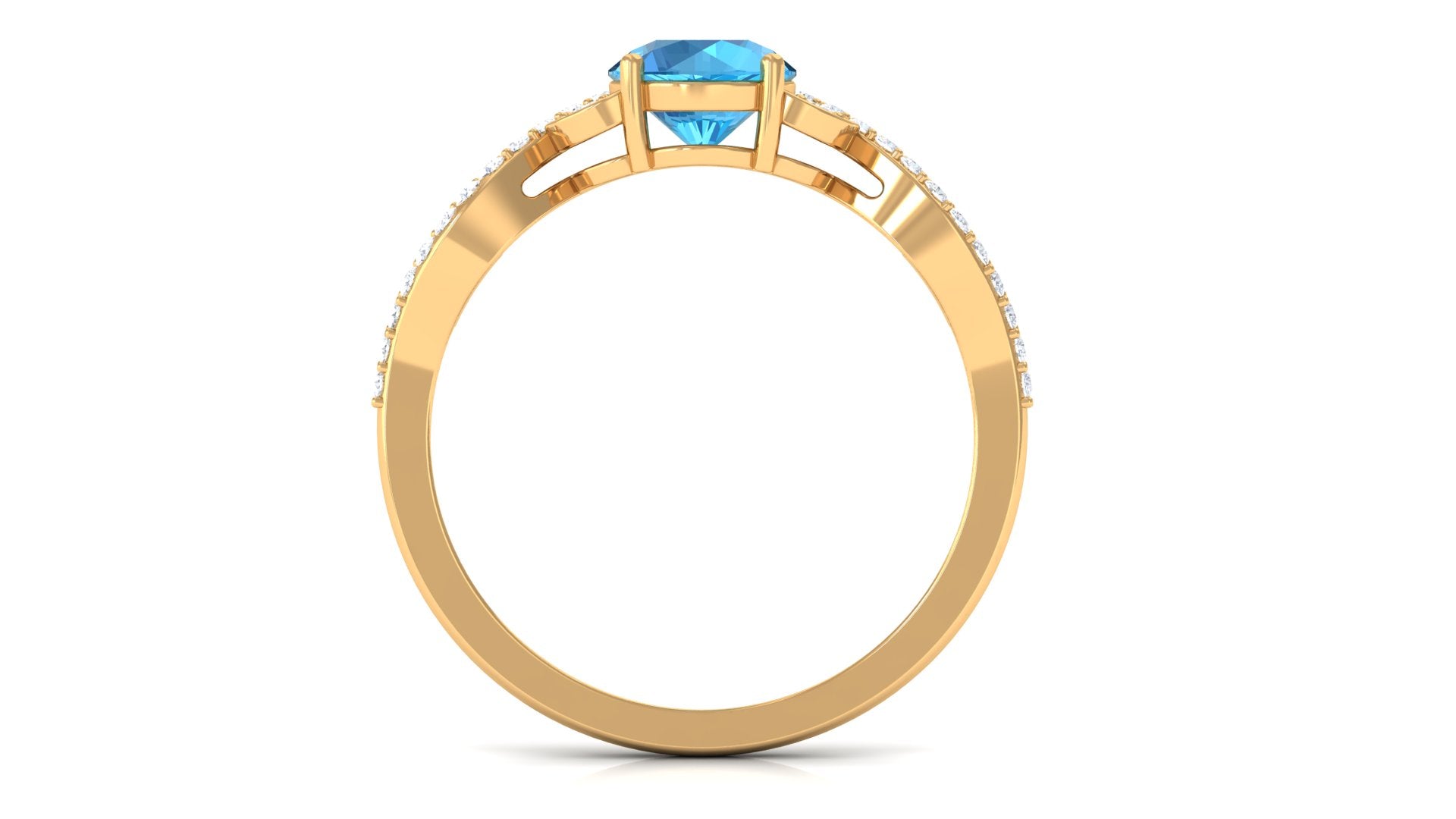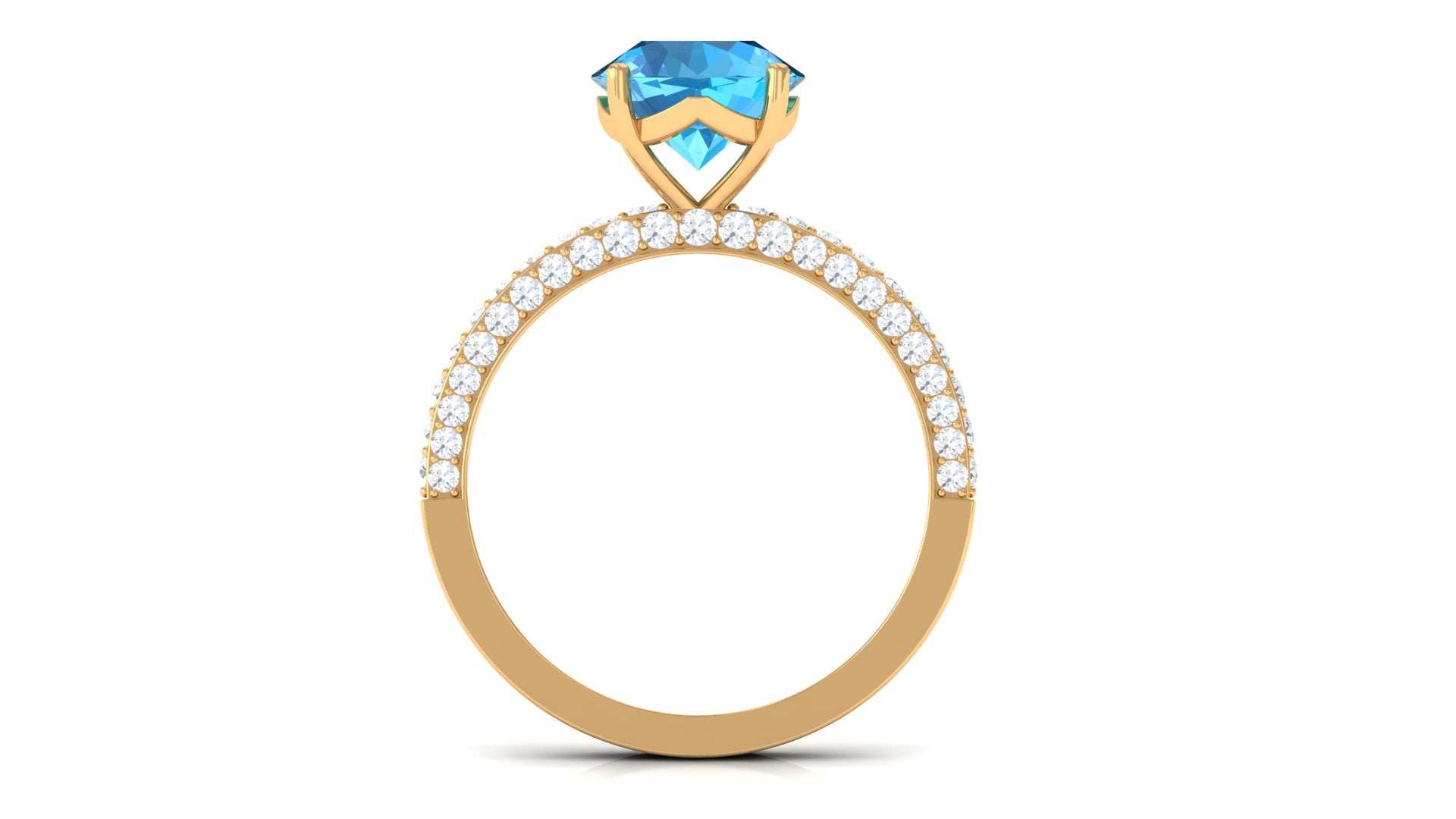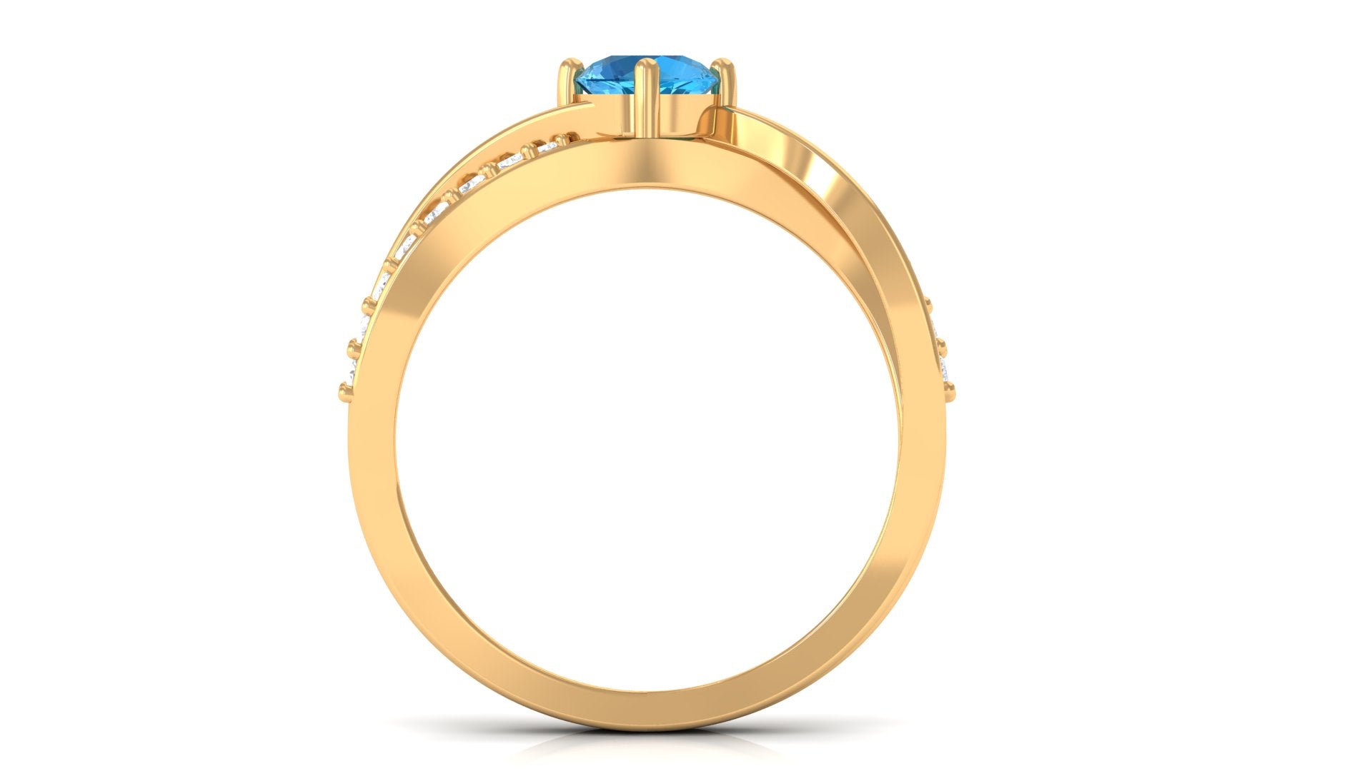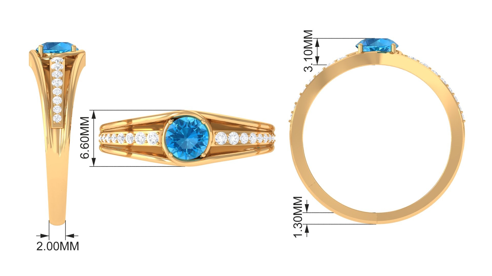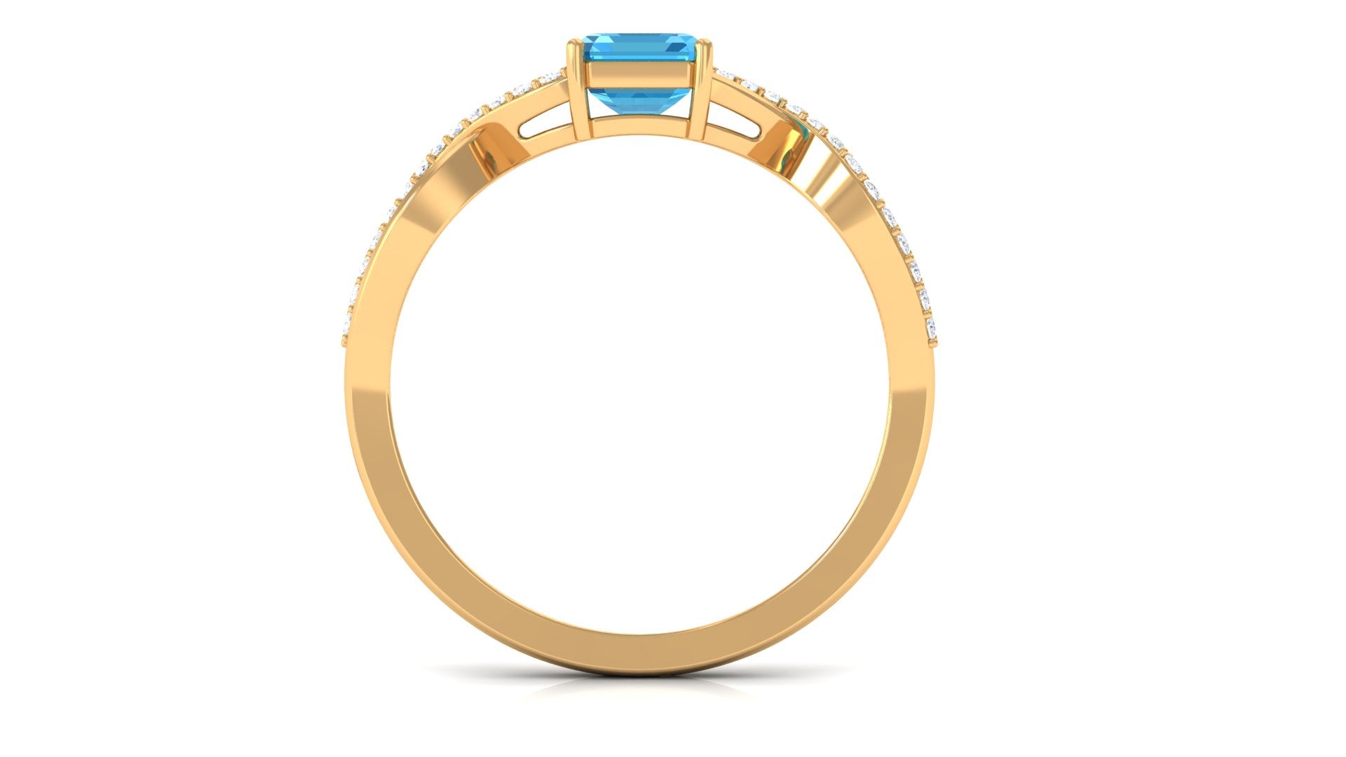 The center-stone of Swiss Blue Topaz here is sparkled up with the encircling of Diamond/Moissanite (that we fondly term ‘Halo’). That makes the Swiss Blue Topaz appear even brighter while highlighting its beauty at its best. Surprisingly, it also gives off the illusion of a bigger Topaz. So, if a Swiss Blue Topaz and Diamond Ring is on your list, this style might turn out to be your best bet.