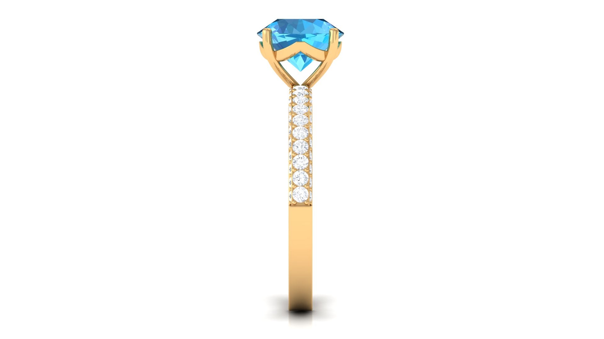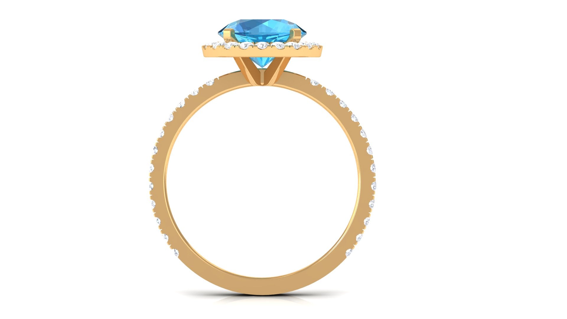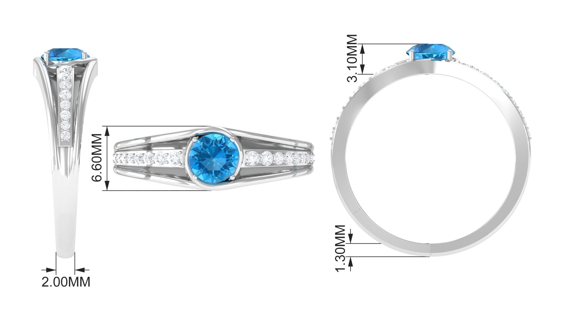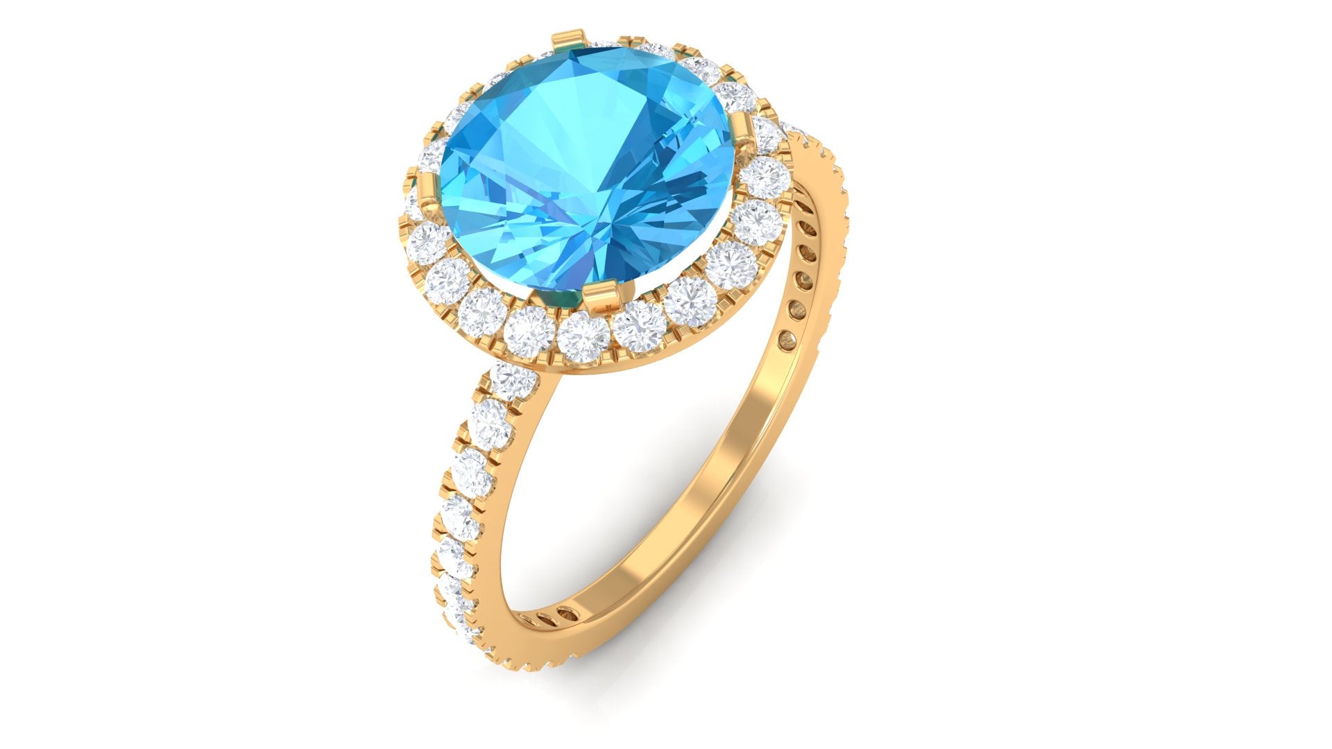 The center-stone of Swiss Blue Topaz here is sparkled up with the encircling of Diamond/Moissanite (that we fondly term ‘Halo’). That makes the Swiss Blue Topaz appear even brighter while highlighting its beauty at its best. Surprisingly, it also gives off the illusion of a bigger Topaz. So, if a Swiss Blue Topaz and Diamond Ring is on your list, this style might turn out to be your best bet.