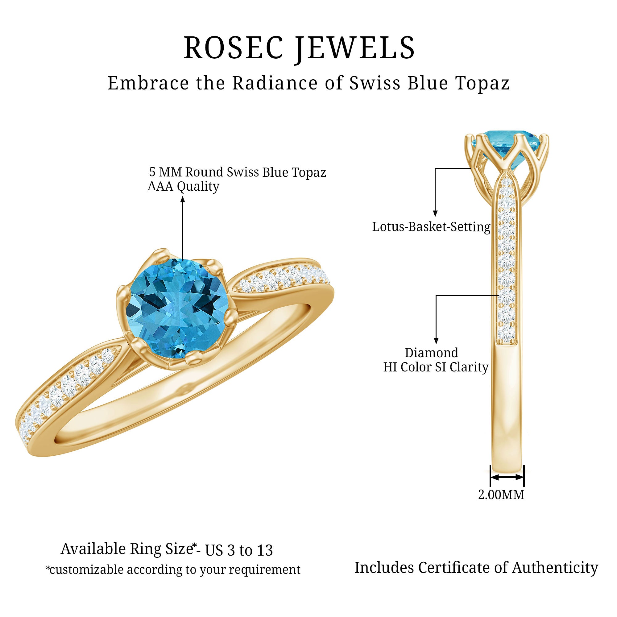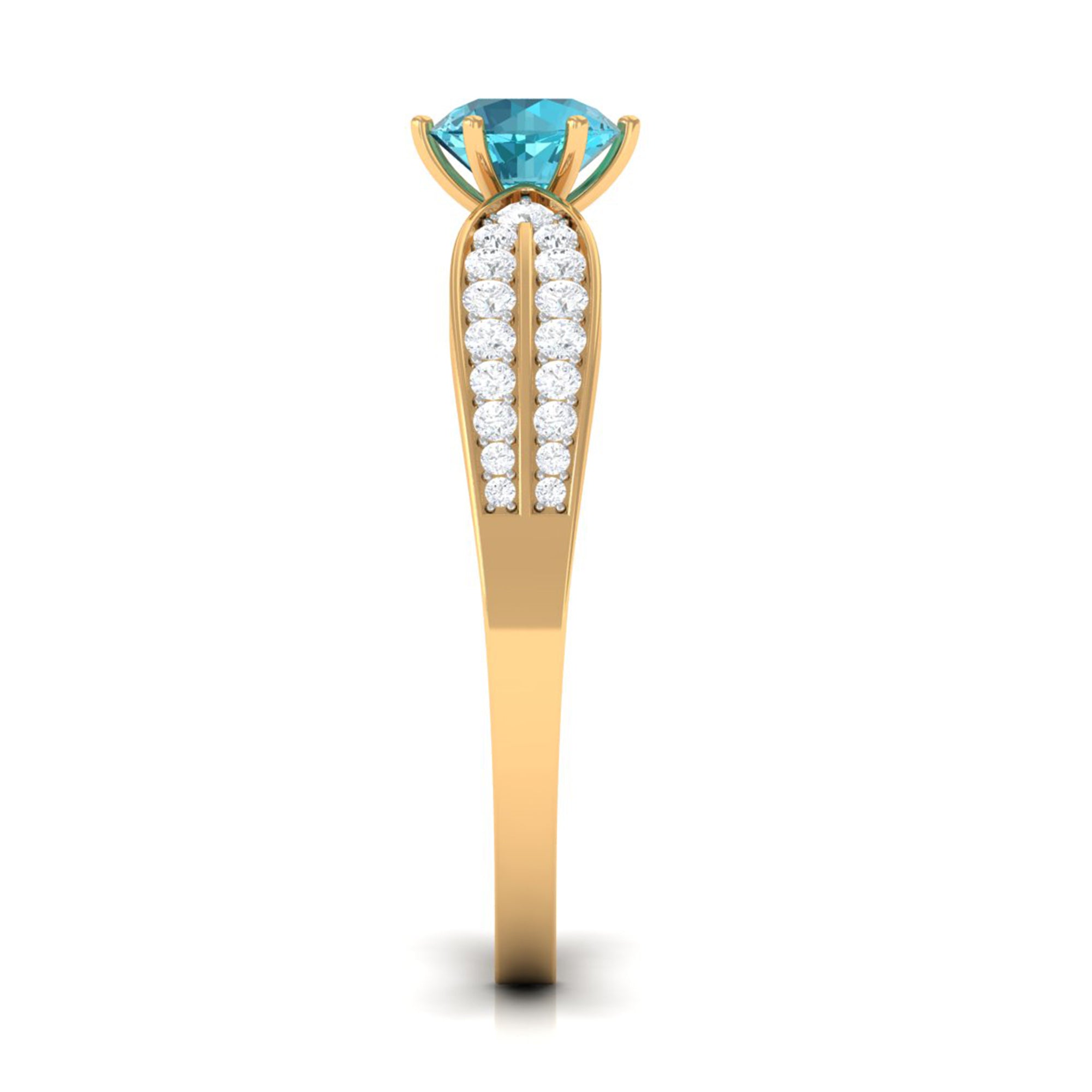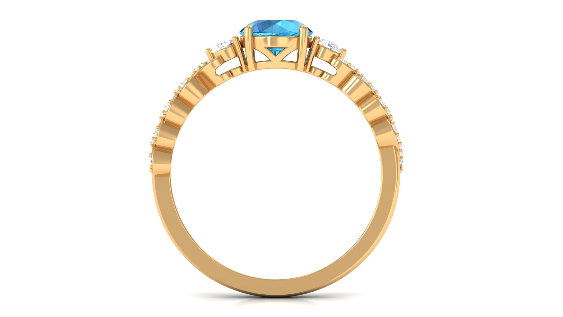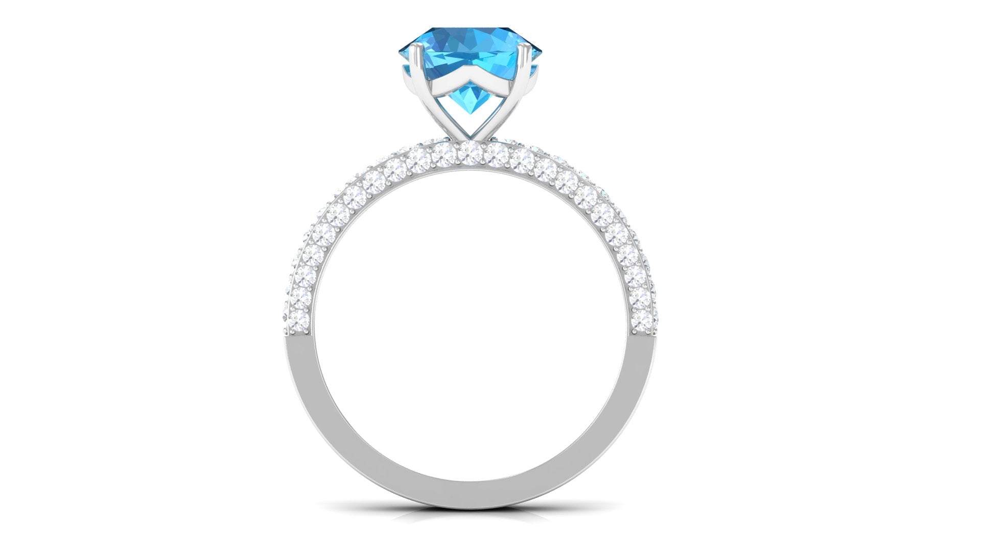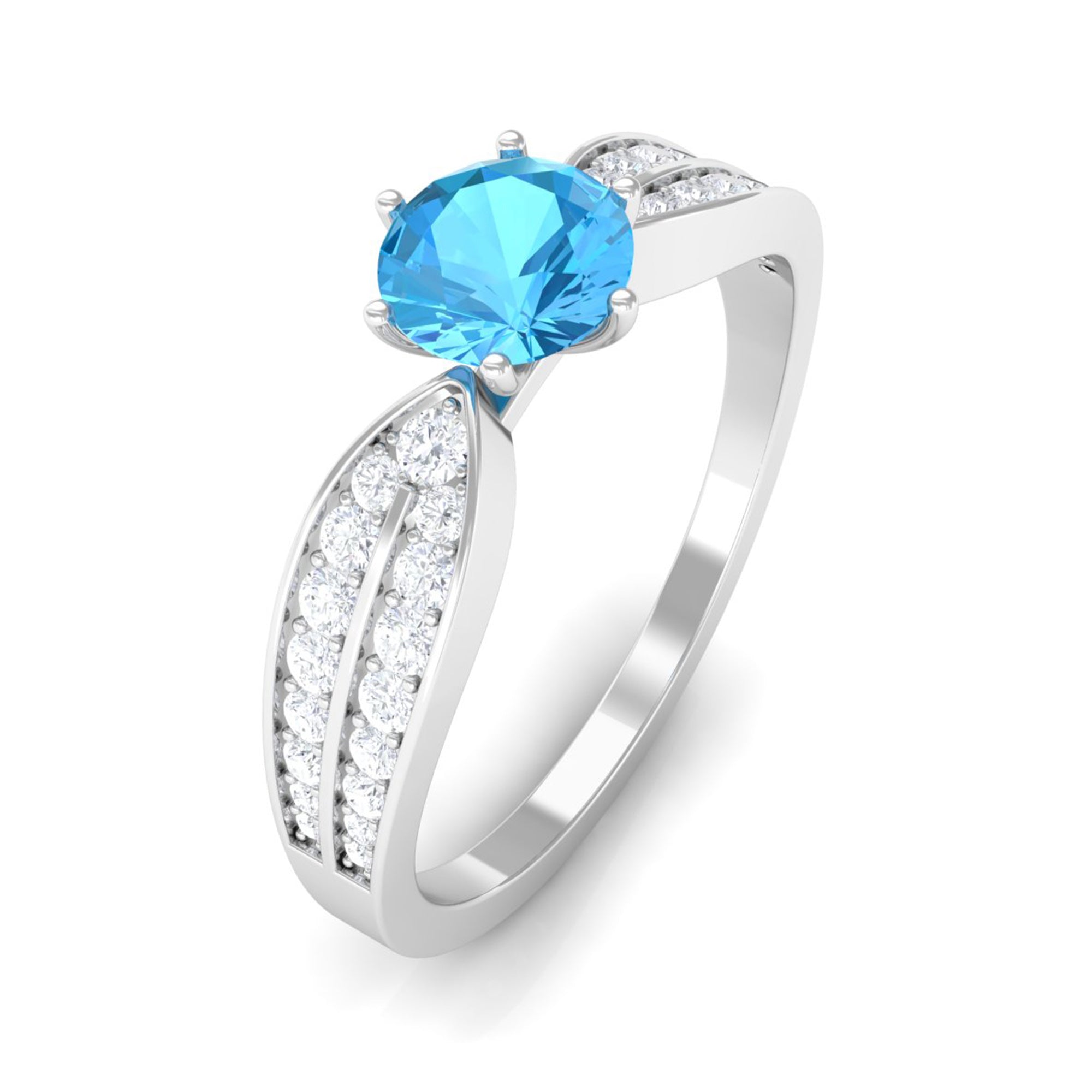 The center-stone of Swiss Blue Topaz here is sparkled up with the encircling of Diamond/Moissanite (that we fondly term ‘Halo’). That makes the Swiss Blue Topaz appear even brighter while highlighting its beauty at its best. Surprisingly, it also gives off the illusion of a bigger Topaz. So, if a Swiss Blue Topaz and Diamond Ring is on your list, this style might turn out to be your best bet.