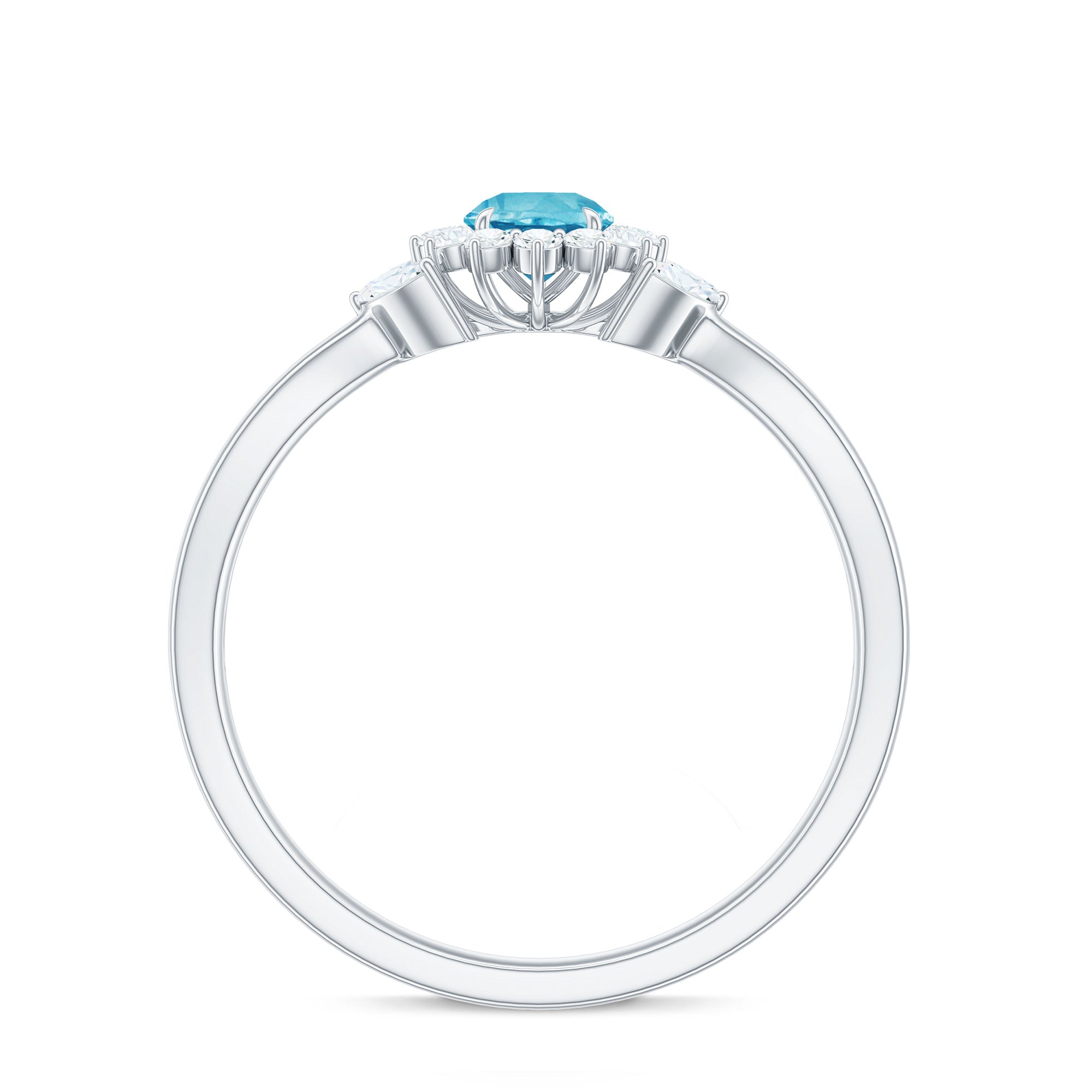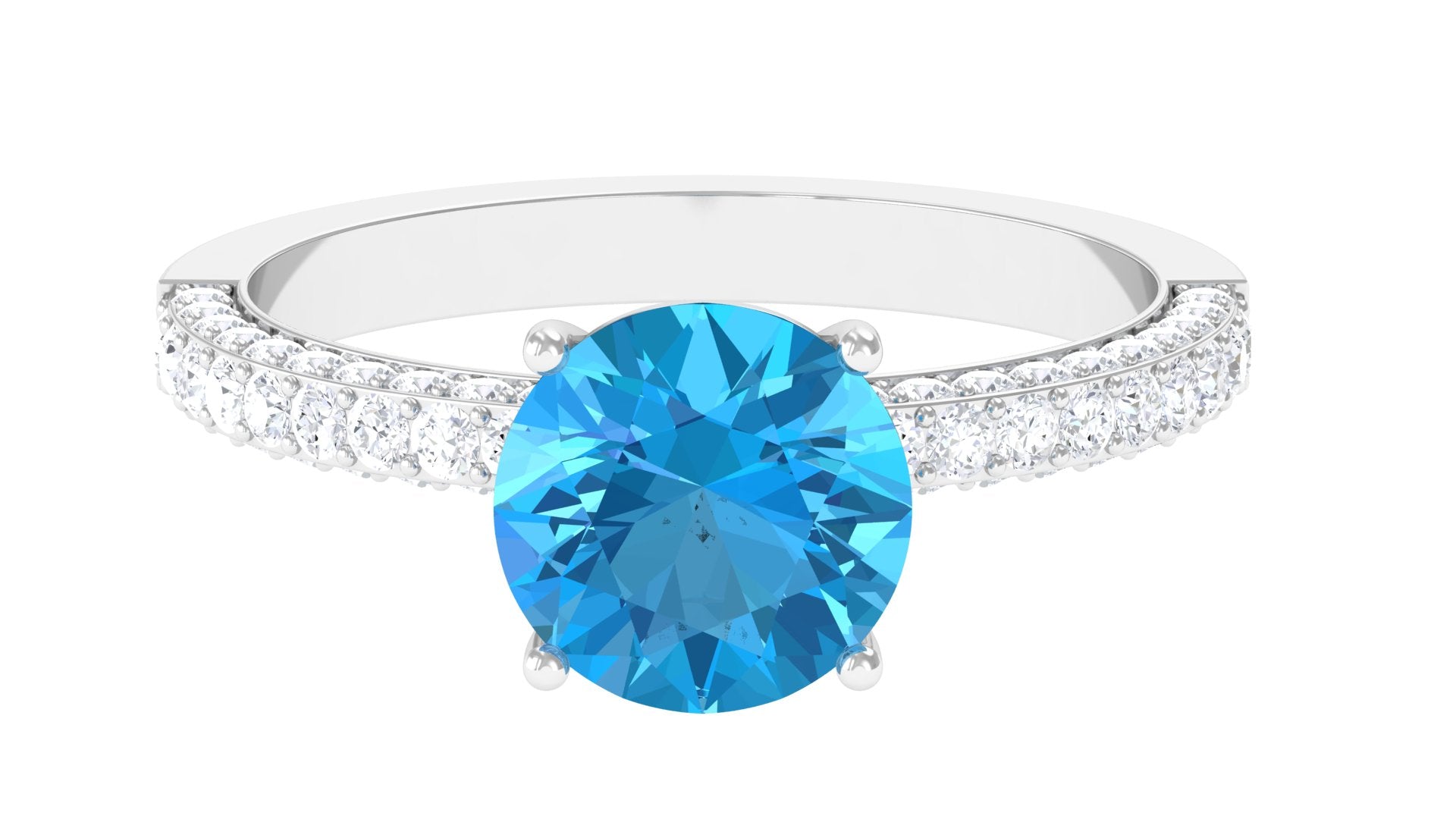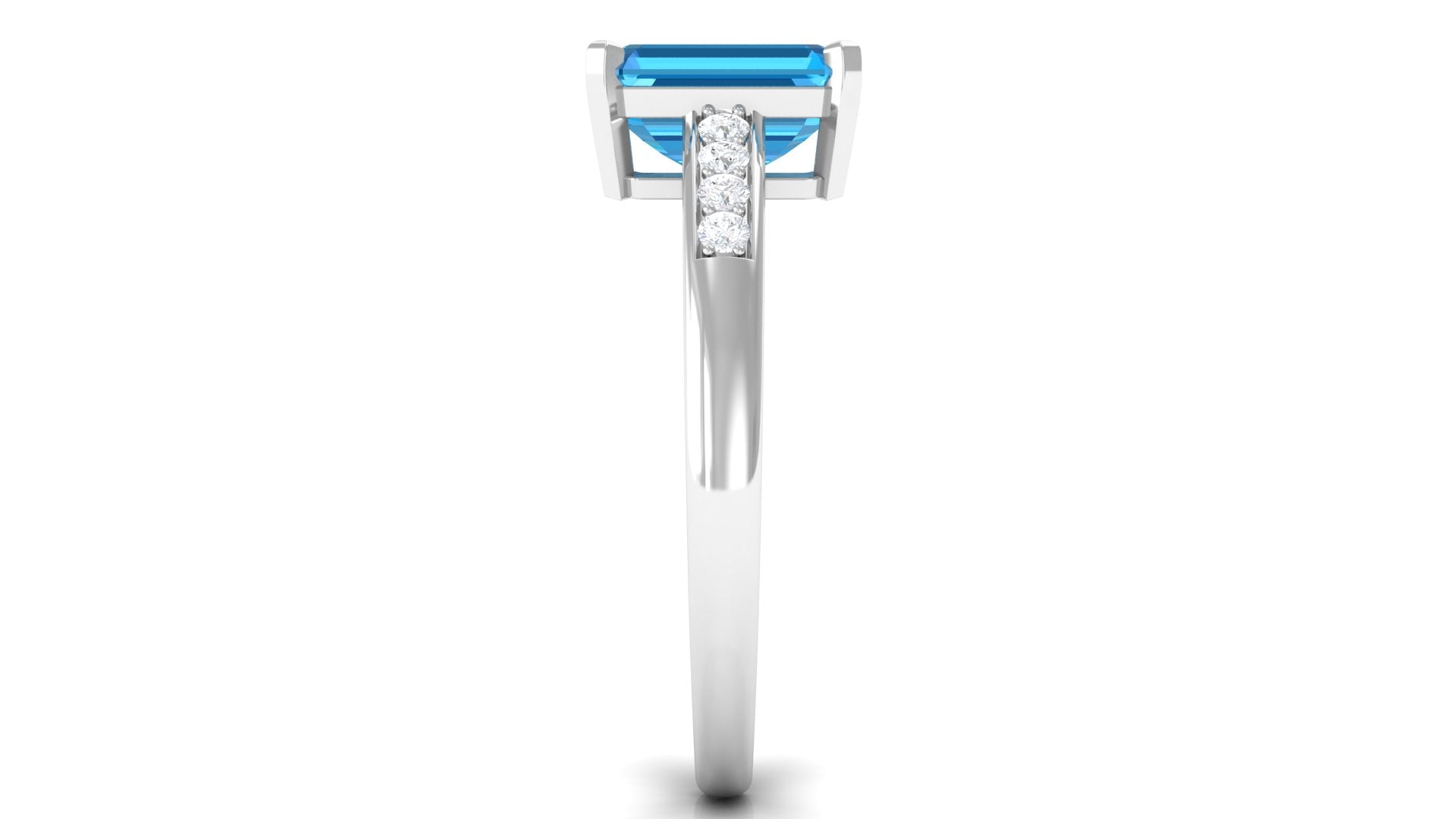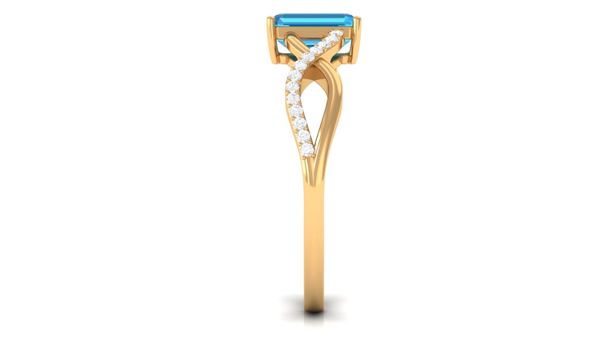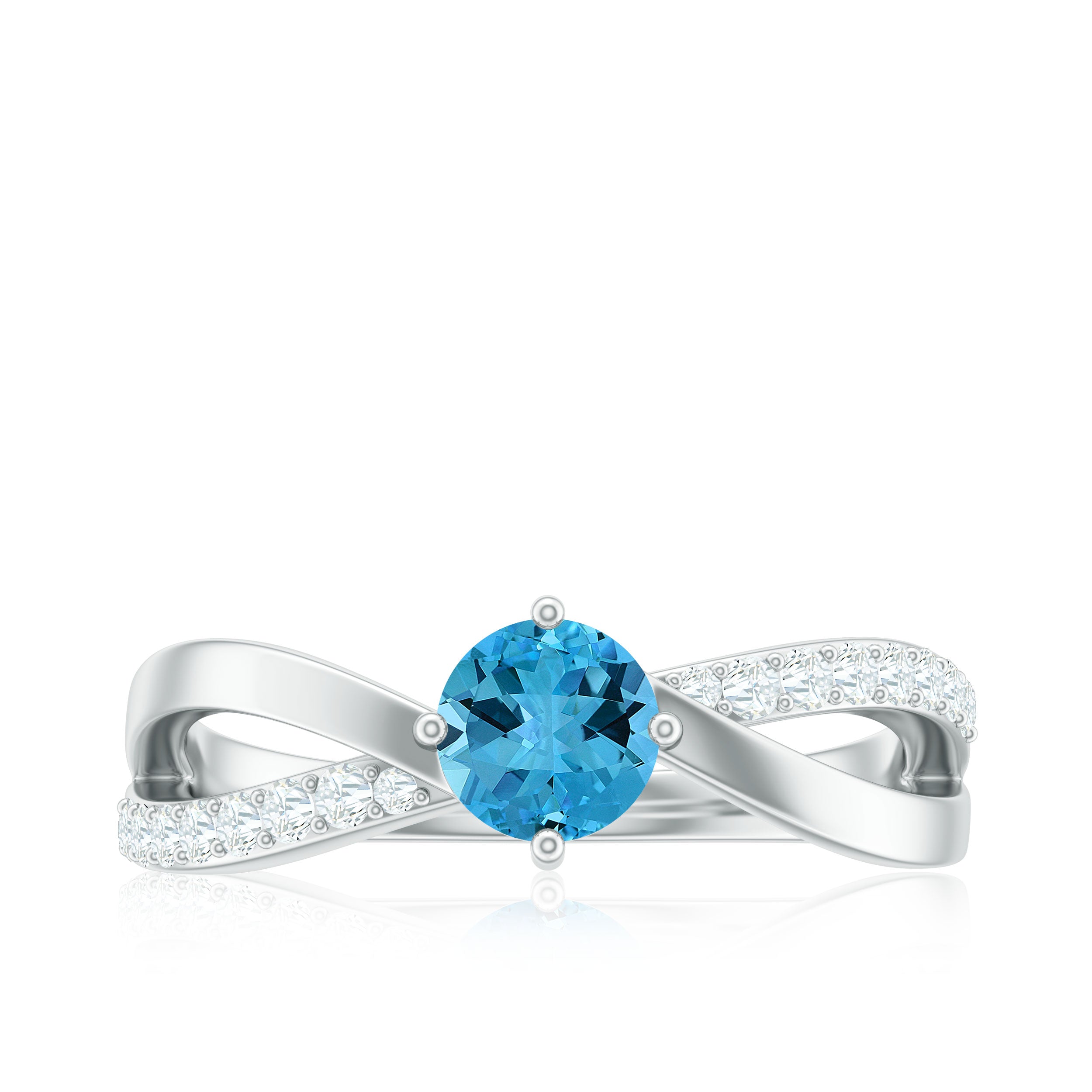 The center-stone of Swiss Blue Topaz here is sparkled up with the encircling of Diamond/Moissanite (that we fondly term ‘Halo’). That makes the Swiss Blue Topaz appear even brighter while highlighting its beauty at its best. Surprisingly, it also gives off the illusion of a bigger Topaz. So, if a Swiss Blue Topaz and Diamond Ring is on your list, this style might turn out to be your best bet.