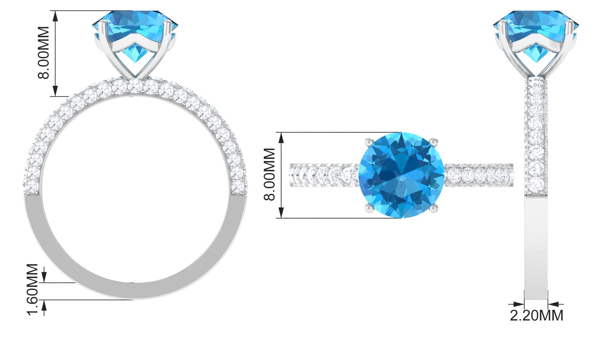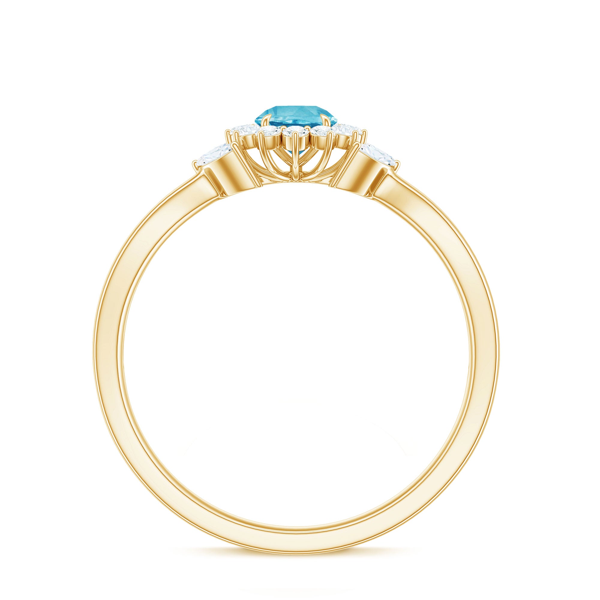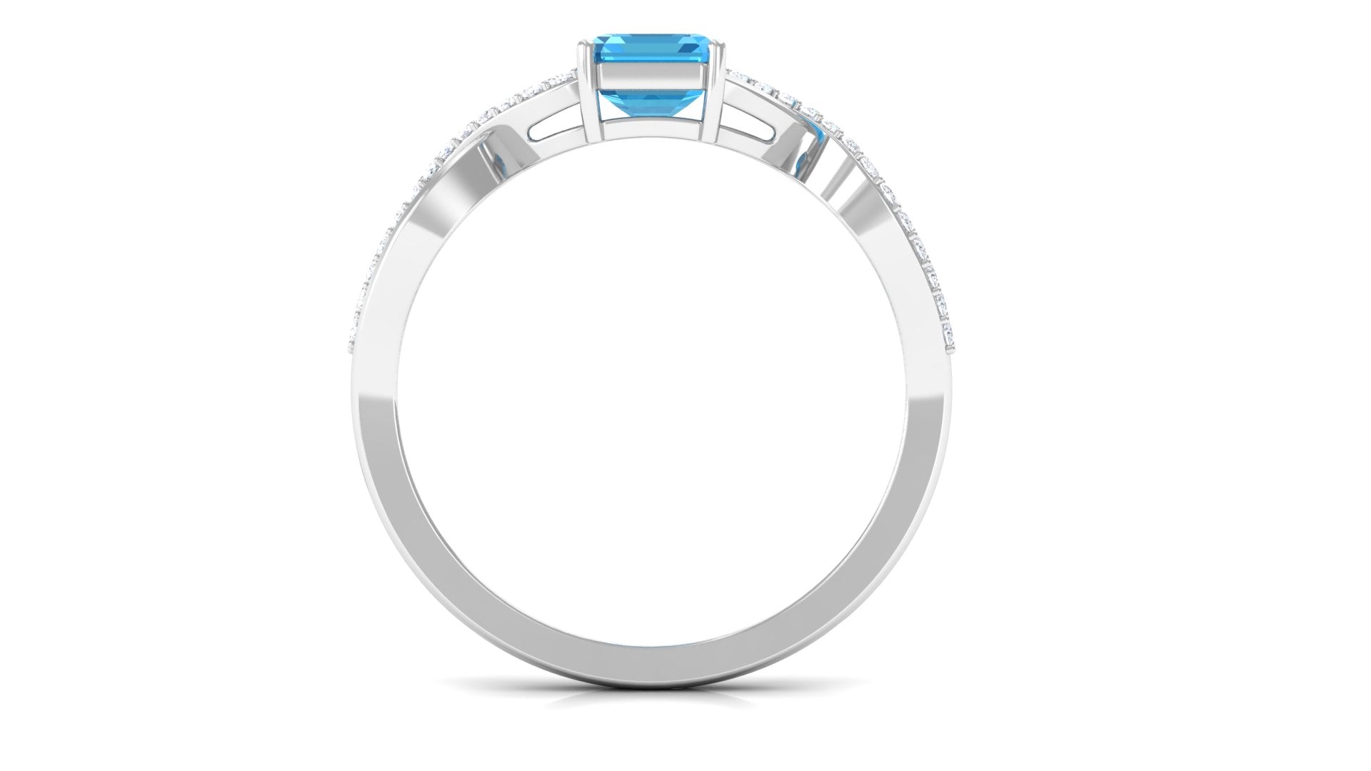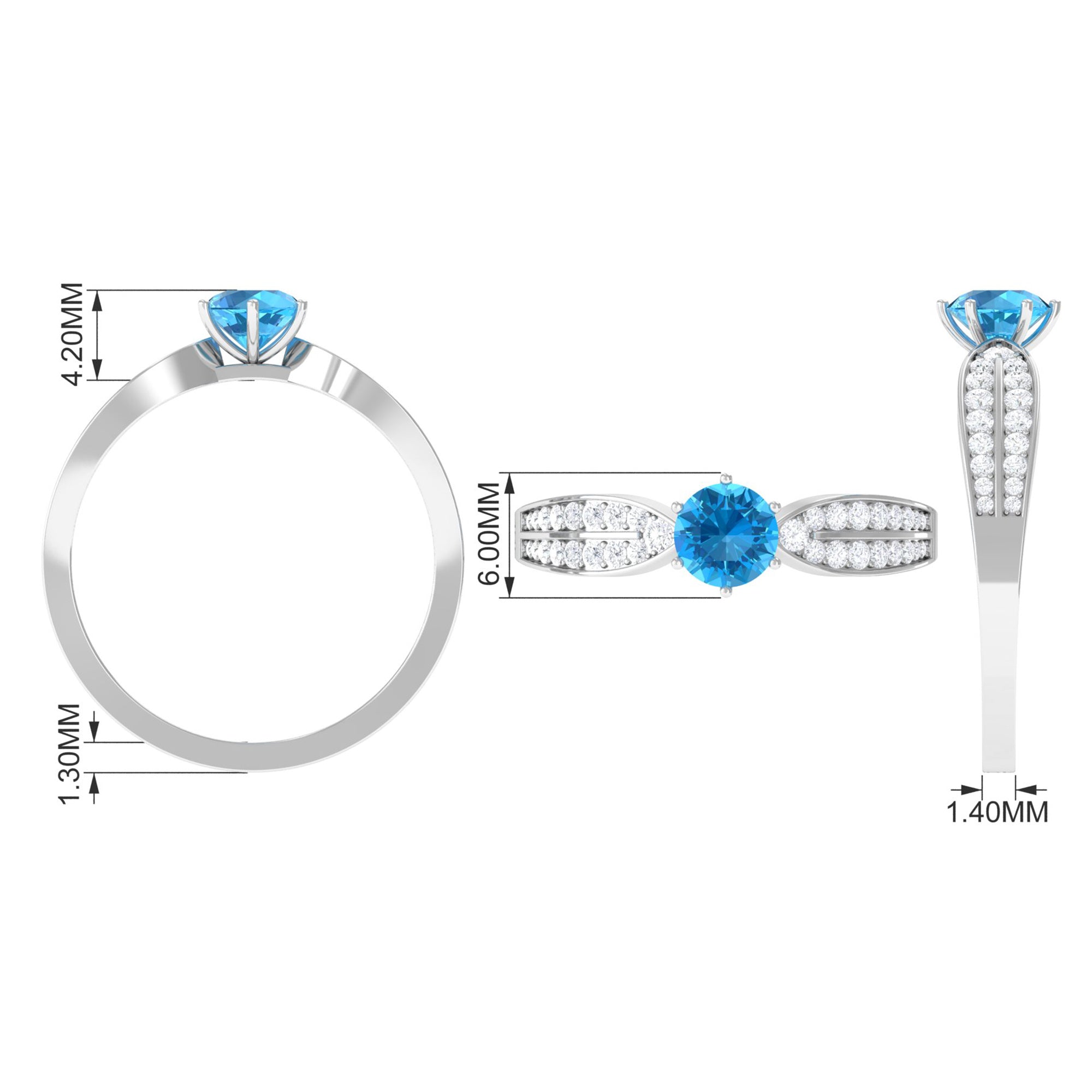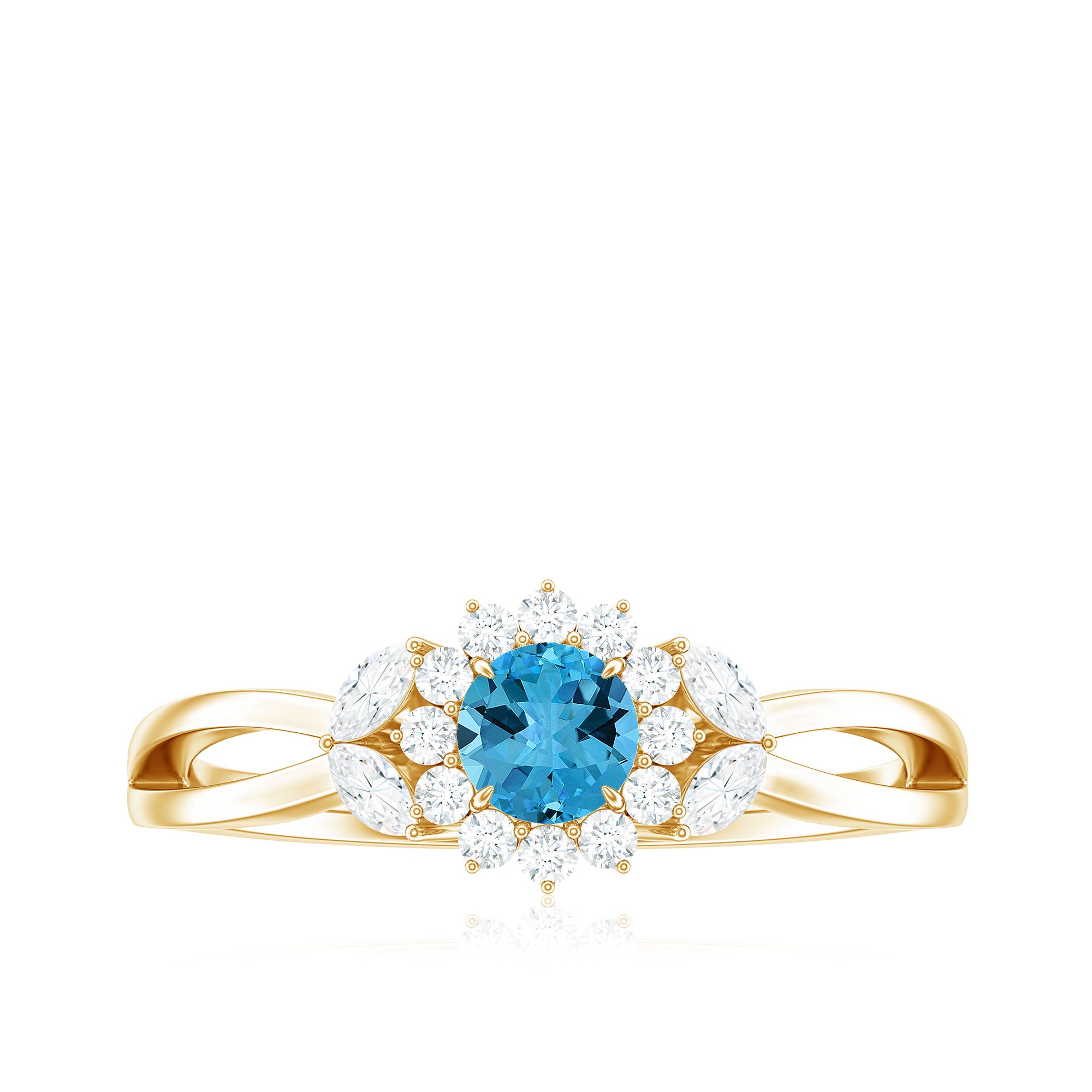 The center-stone of Swiss Blue Topaz here is sparkled up with the encircling of Diamond/Moissanite (that we fondly term ‘Halo’). That makes the Swiss Blue Topaz appear even brighter while highlighting its beauty at its best. Surprisingly, it also gives off the illusion of a bigger Topaz. So, if a Swiss Blue Topaz and Diamond Ring is on your list, this style might turn out to be your best bet.