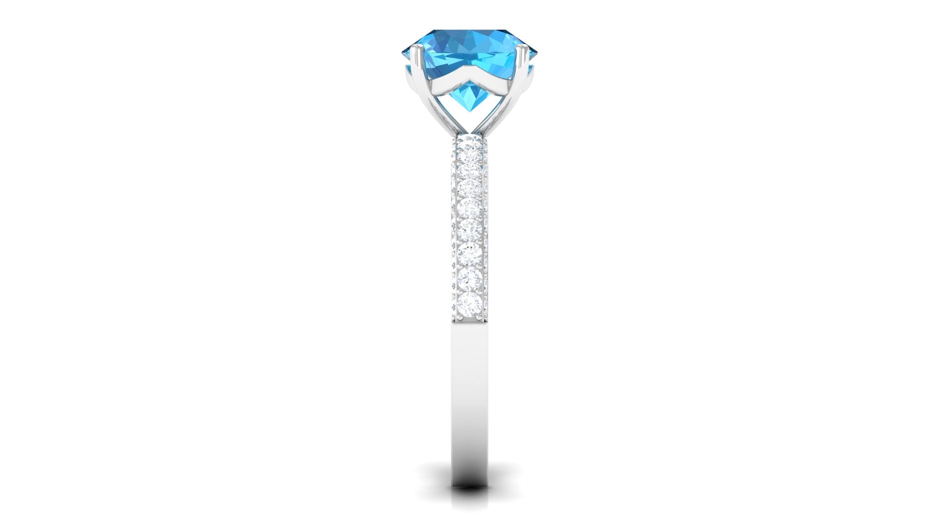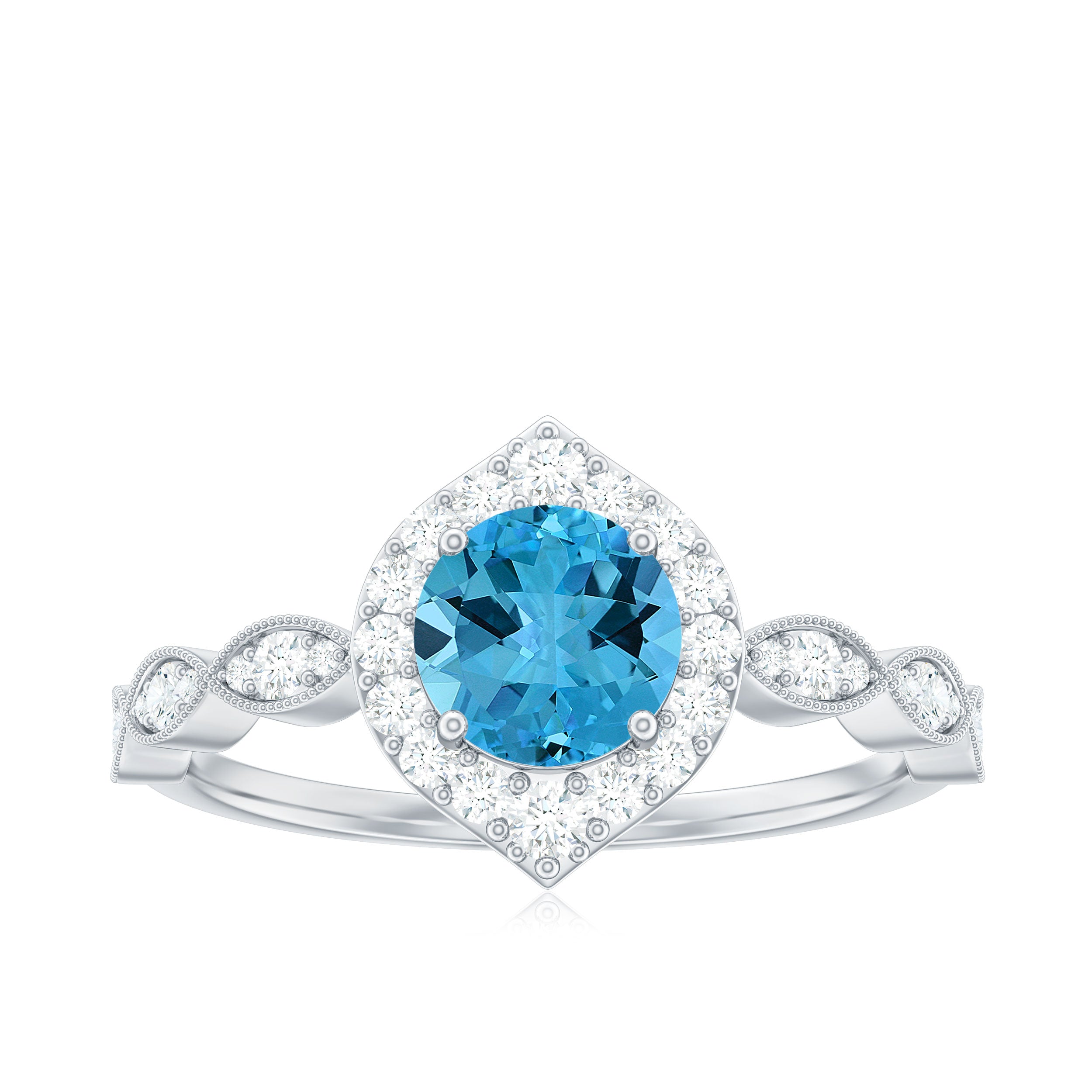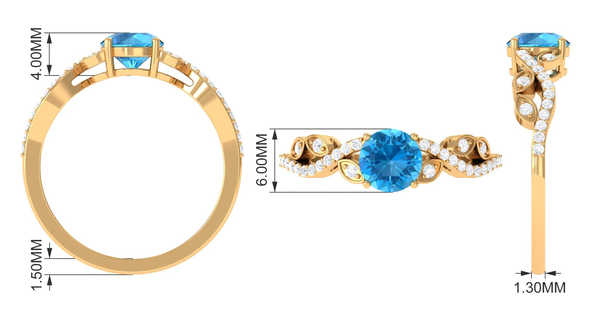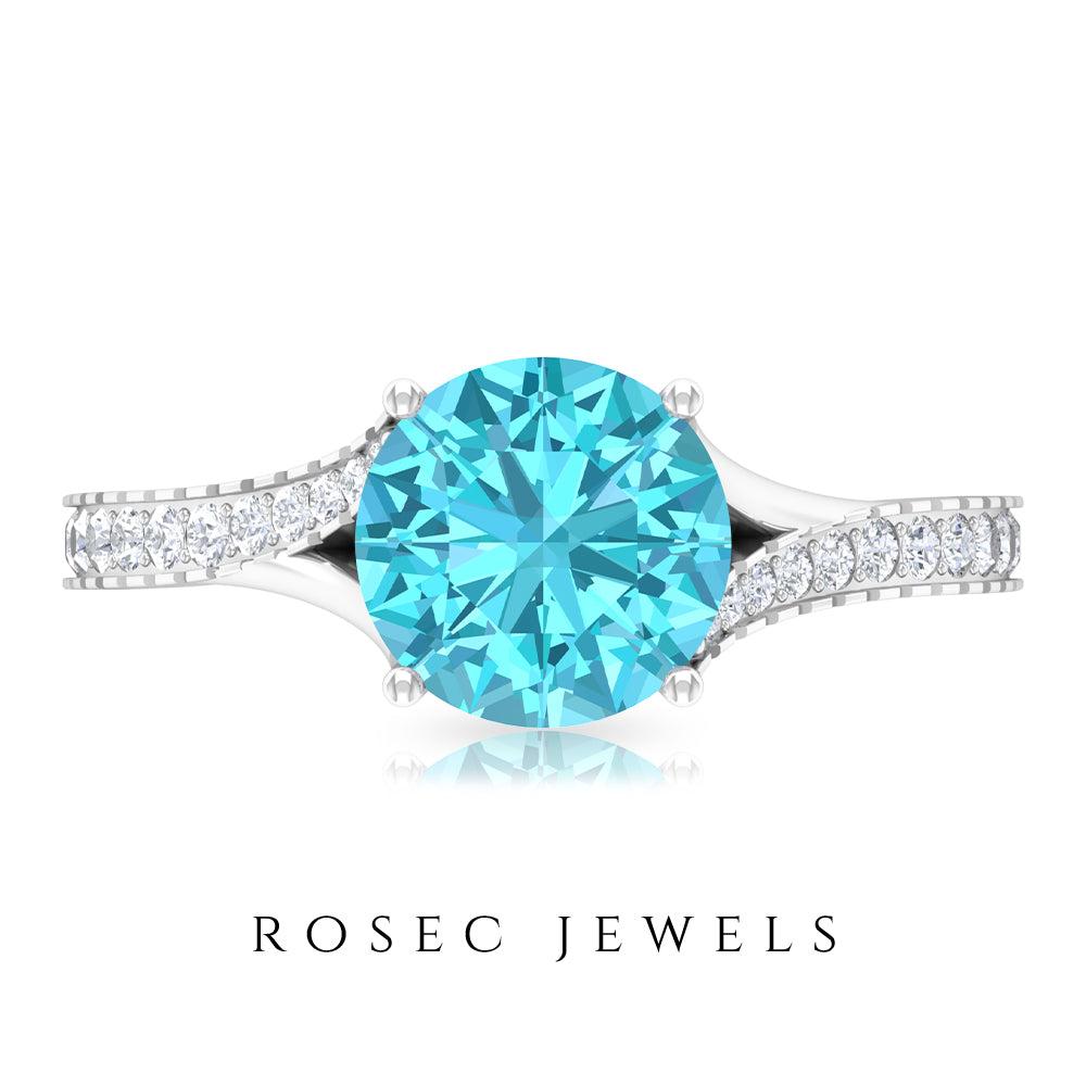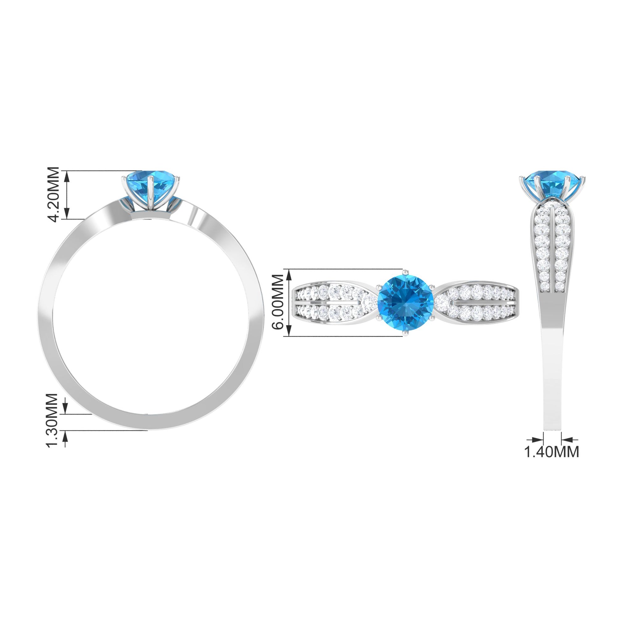 The center-stone of Swiss Blue Topaz here is sparkled up with the encircling of Diamond/Moissanite (that we fondly term ‘Halo’). That makes the Swiss Blue Topaz appear even brighter while highlighting its beauty at its best. Surprisingly, it also gives off the illusion of a bigger Topaz. So, if a Swiss Blue Topaz and Diamond Ring is on your list, this style might turn out to be your best bet.