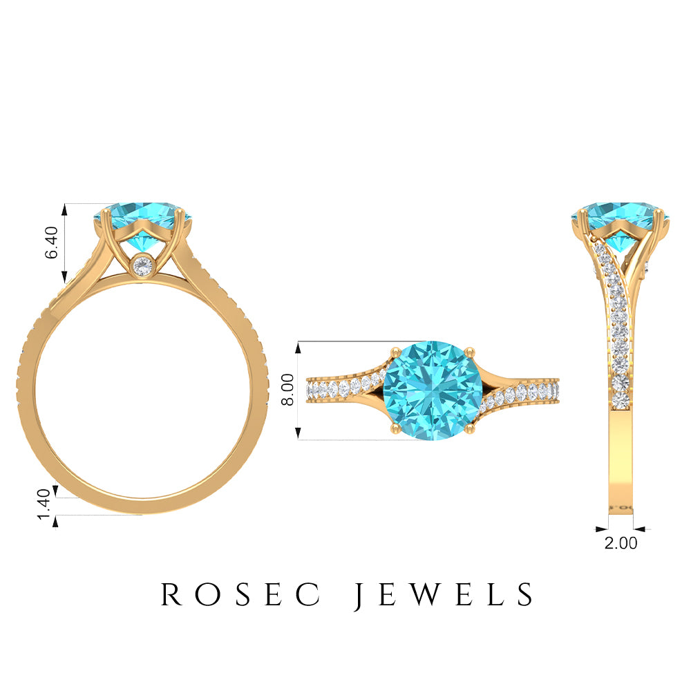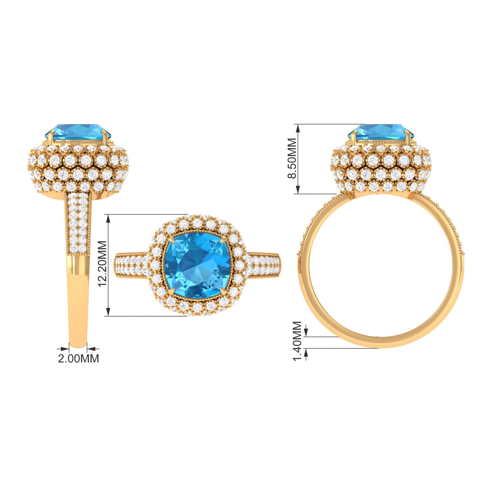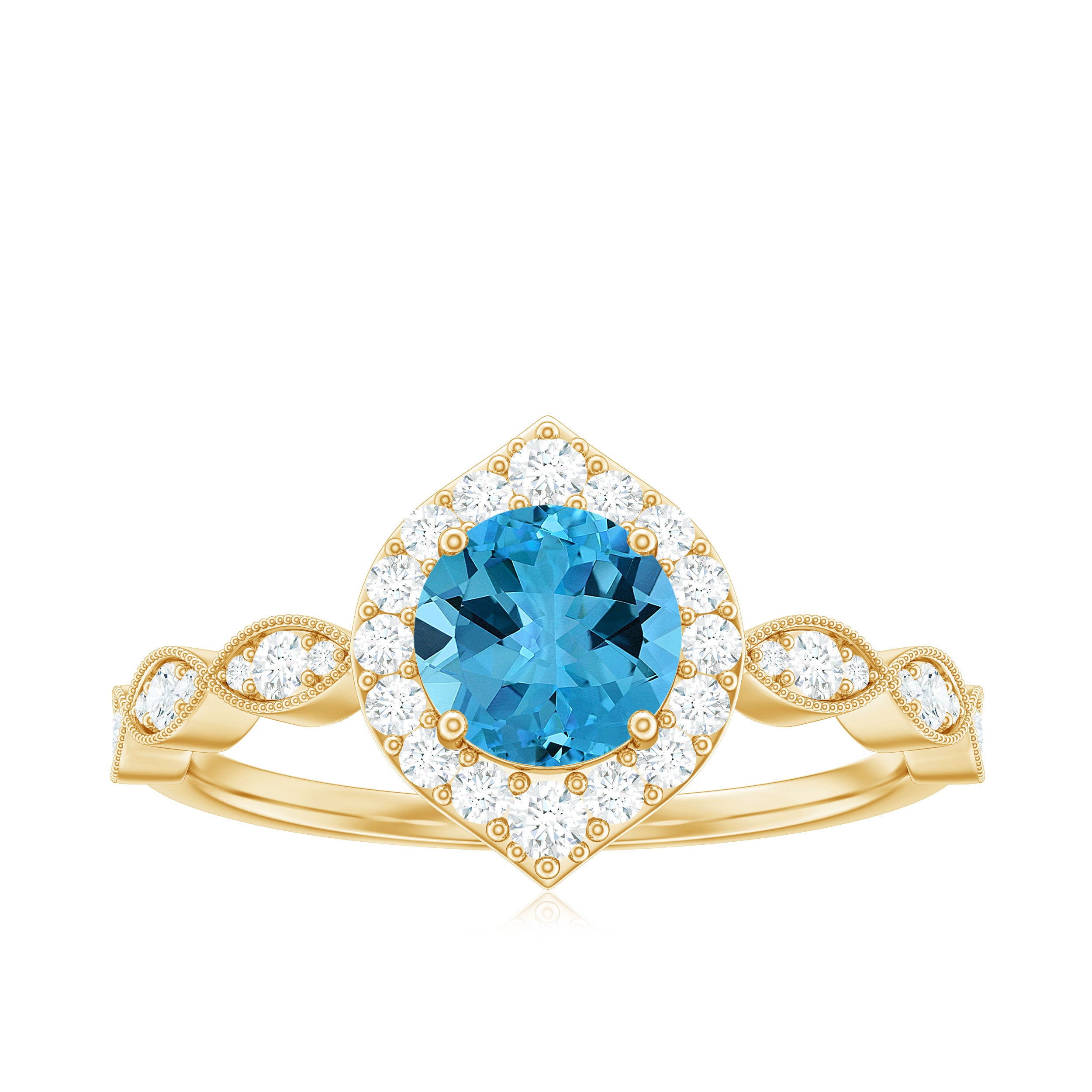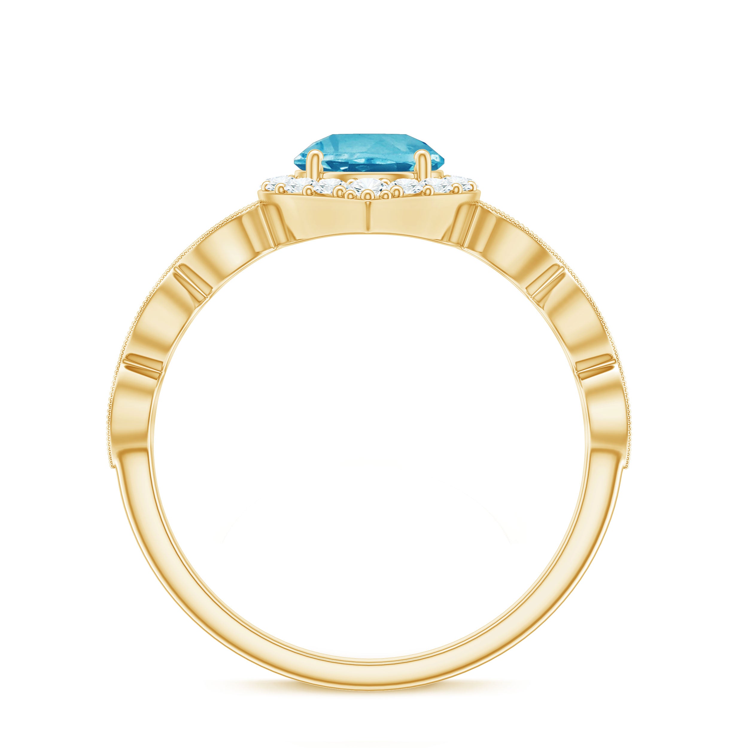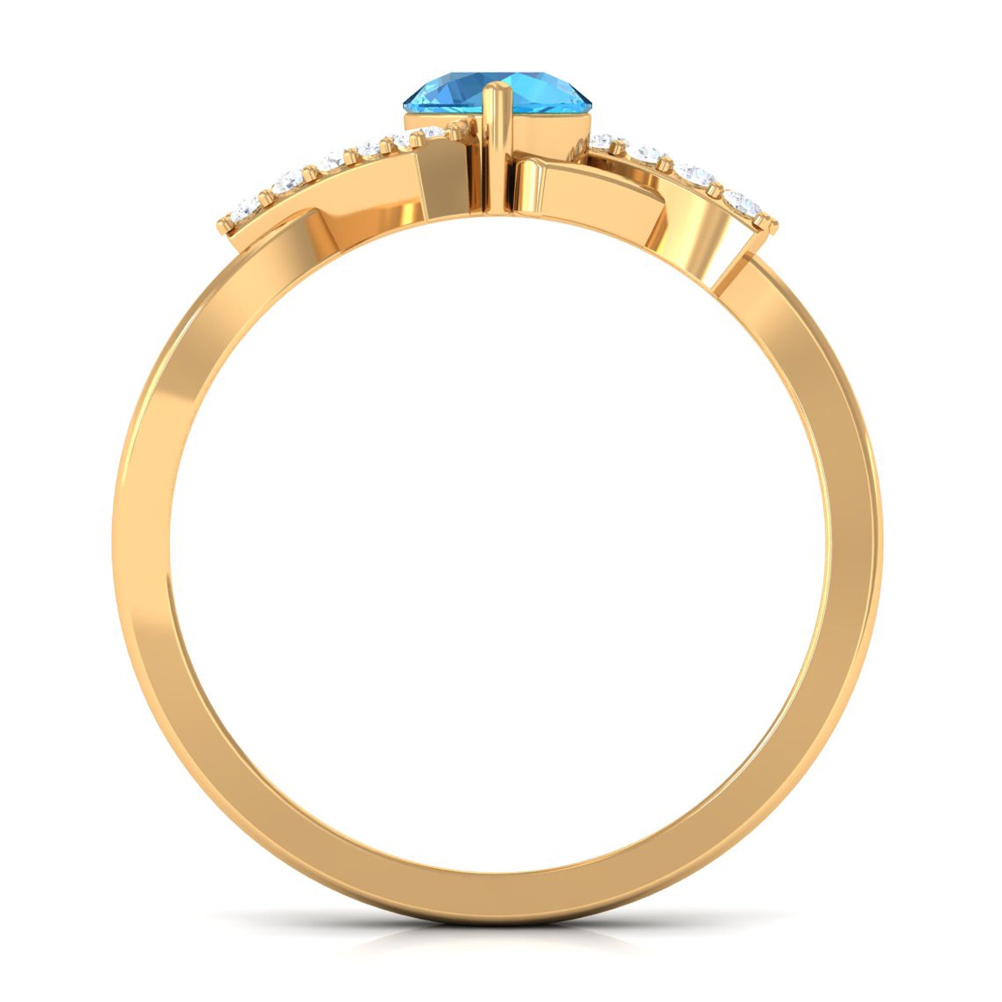 The center-stone of Swiss Blue Topaz here is sparkled up with the encircling of Diamond/Moissanite (that we fondly term ‘Halo’). That makes the Swiss Blue Topaz appear even brighter while highlighting its beauty at its best. Surprisingly, it also gives off the illusion of a bigger Topaz. So, if a Swiss Blue Topaz and Diamond Ring is on your list, this style might turn out to be your best bet.