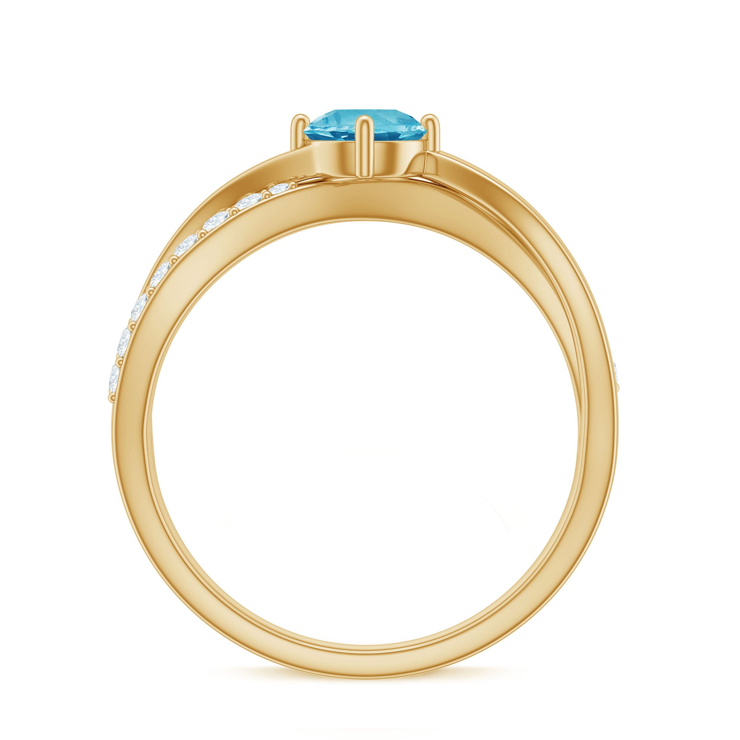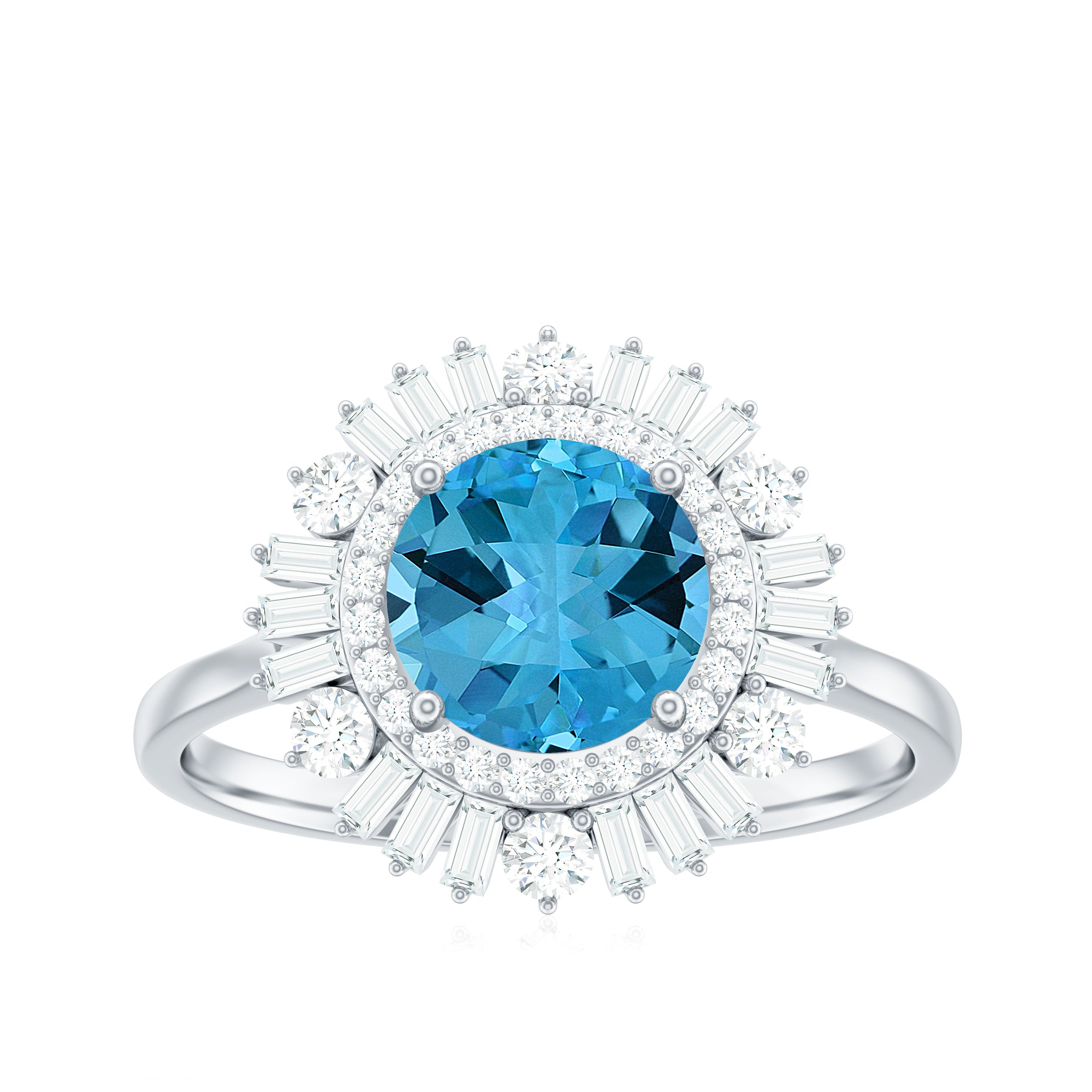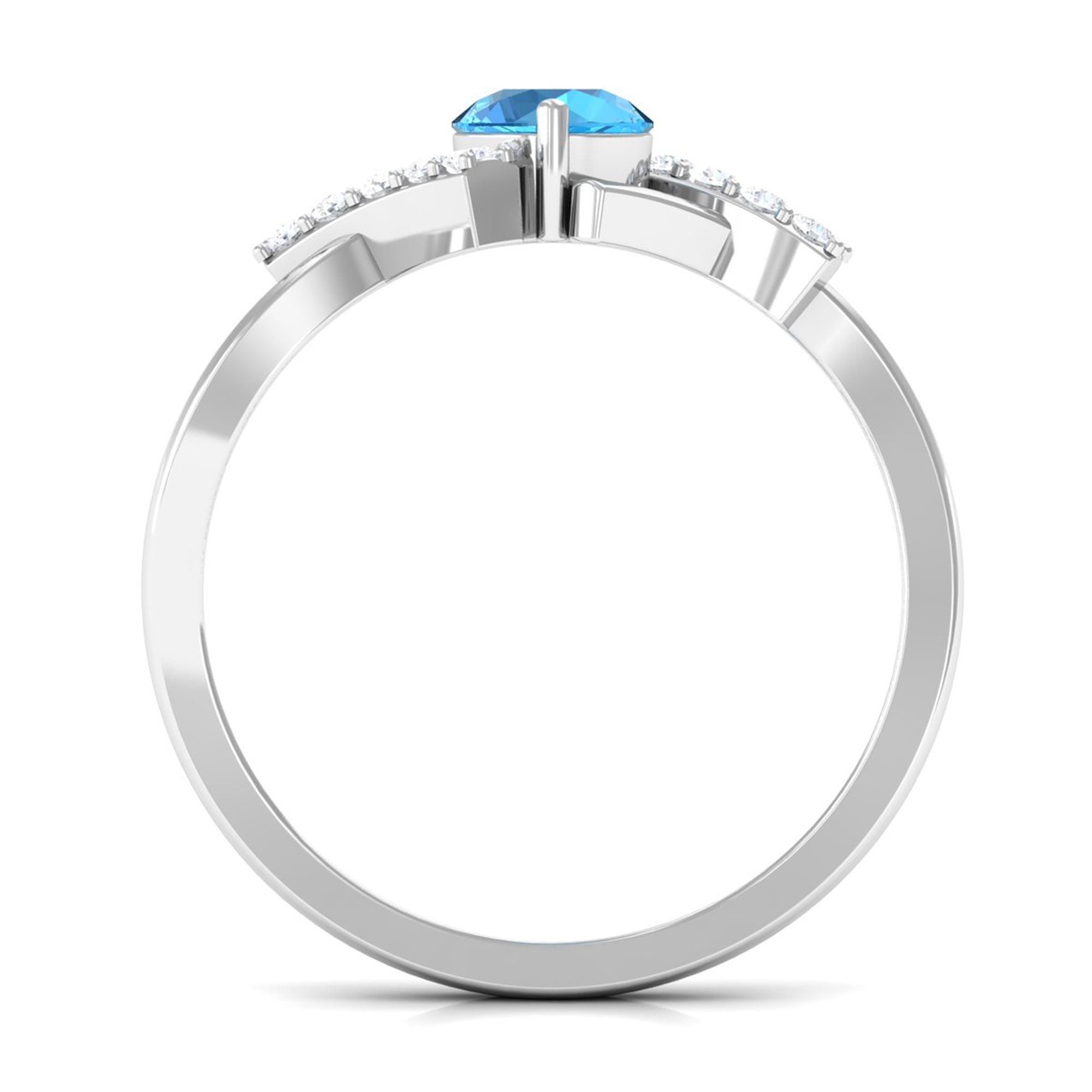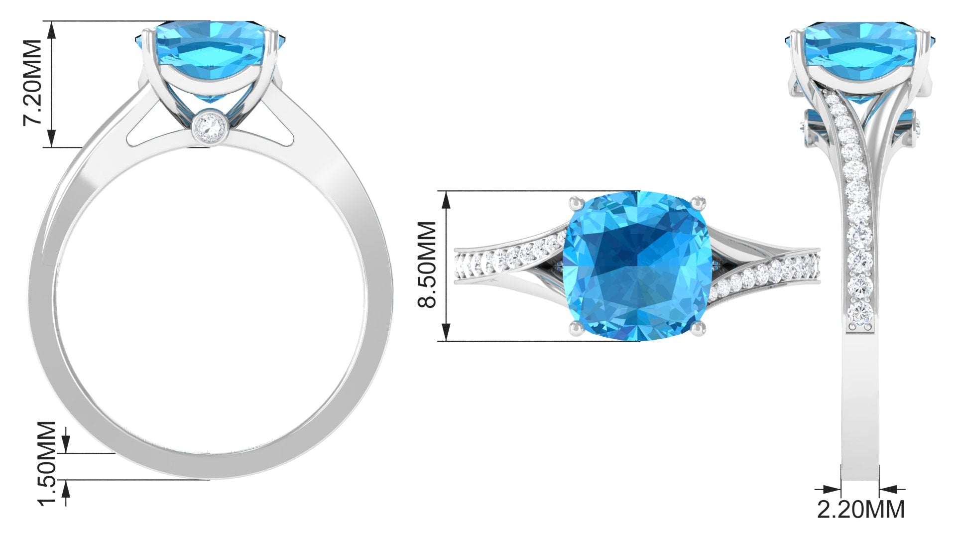 The center-stone of Swiss Blue Topaz here is sparkled up with the encircling of Diamond/Moissanite (that we fondly term ‘Halo’). That makes the Swiss Blue Topaz appear even brighter while highlighting its beauty at its best. Surprisingly, it also gives off the illusion of a bigger Topaz. So, if a Swiss Blue Topaz and Diamond Ring is on your list, this style might turn out to be your best bet.