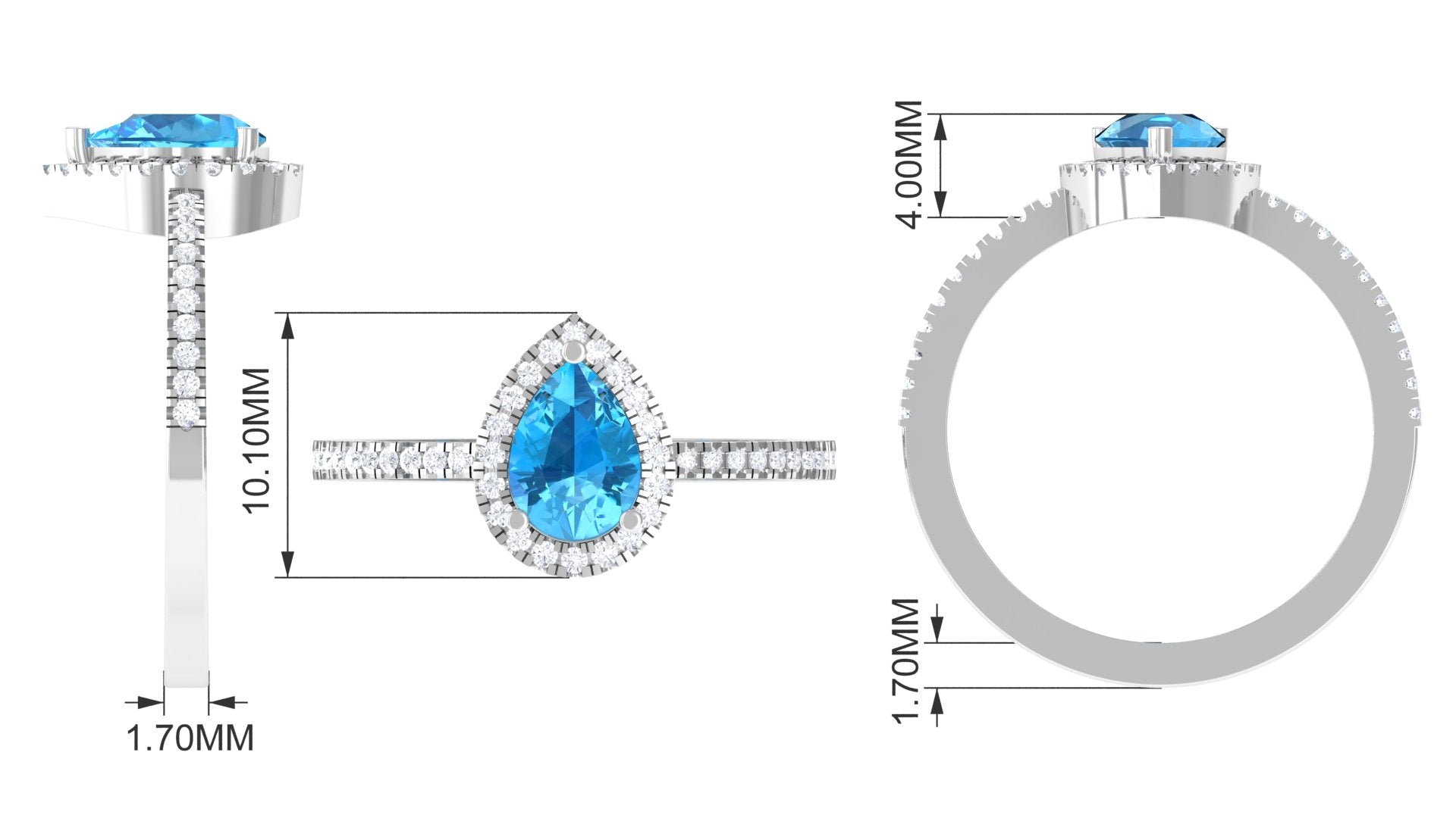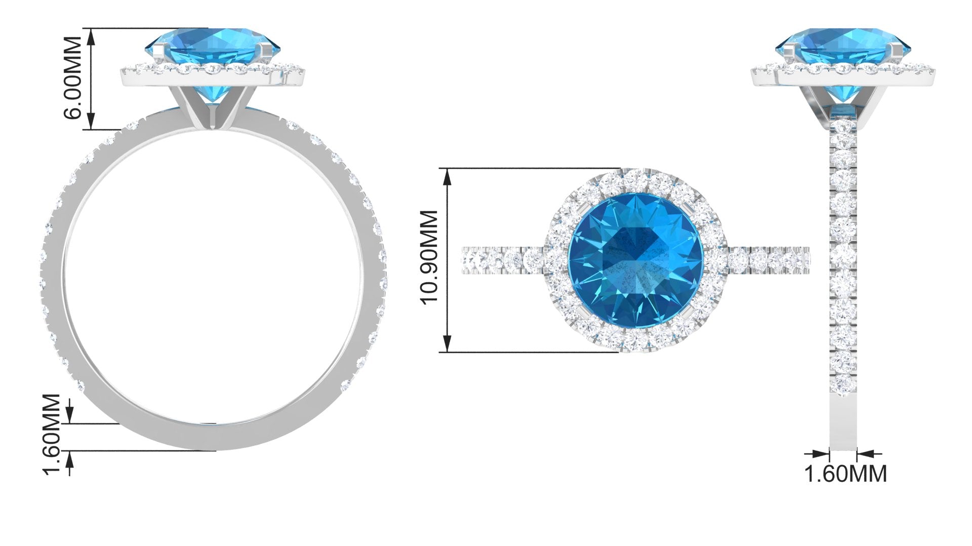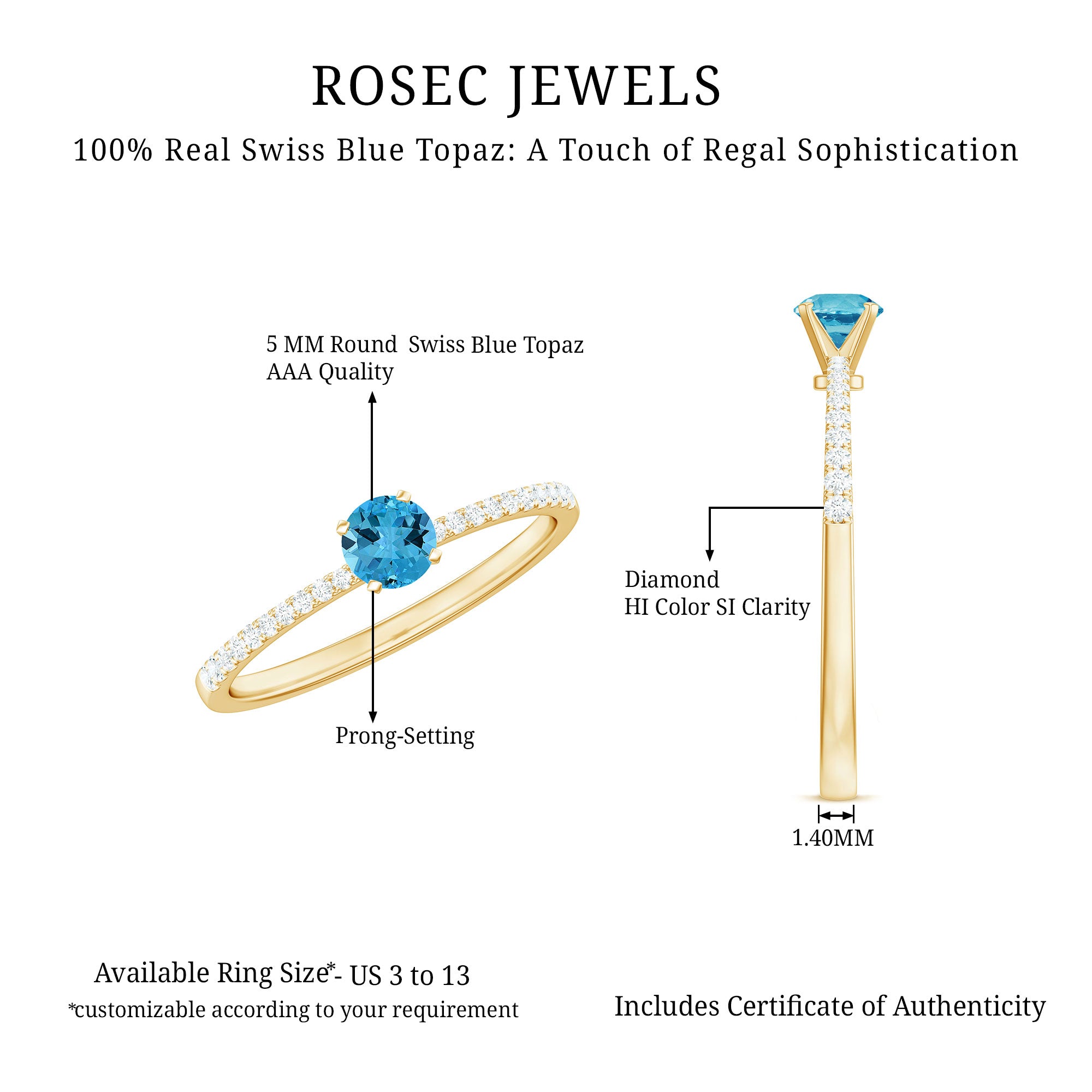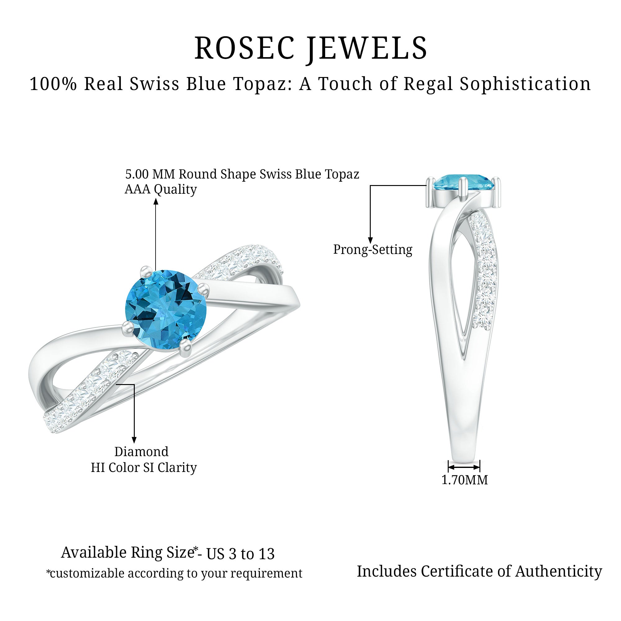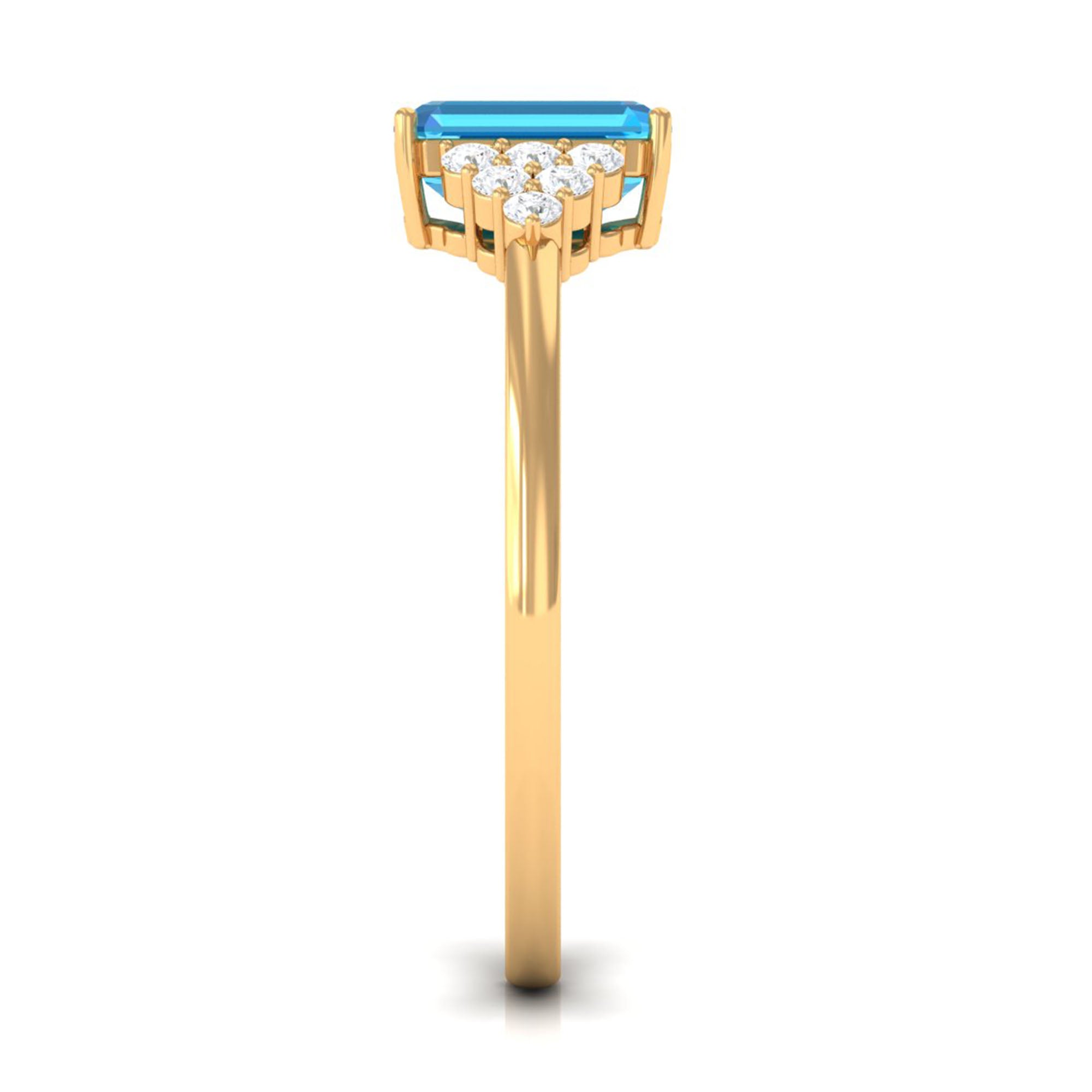 The center-stone of Swiss Blue Topaz here is sparkled up with the encircling of Diamond/Moissanite (that we fondly term ‘Halo’). That makes the Swiss Blue Topaz appear even brighter while highlighting its beauty at its best. Surprisingly, it also gives off the illusion of a bigger Topaz. So, if a Swiss Blue Topaz and Diamond Ring is on your list, this style might turn out to be your best bet.