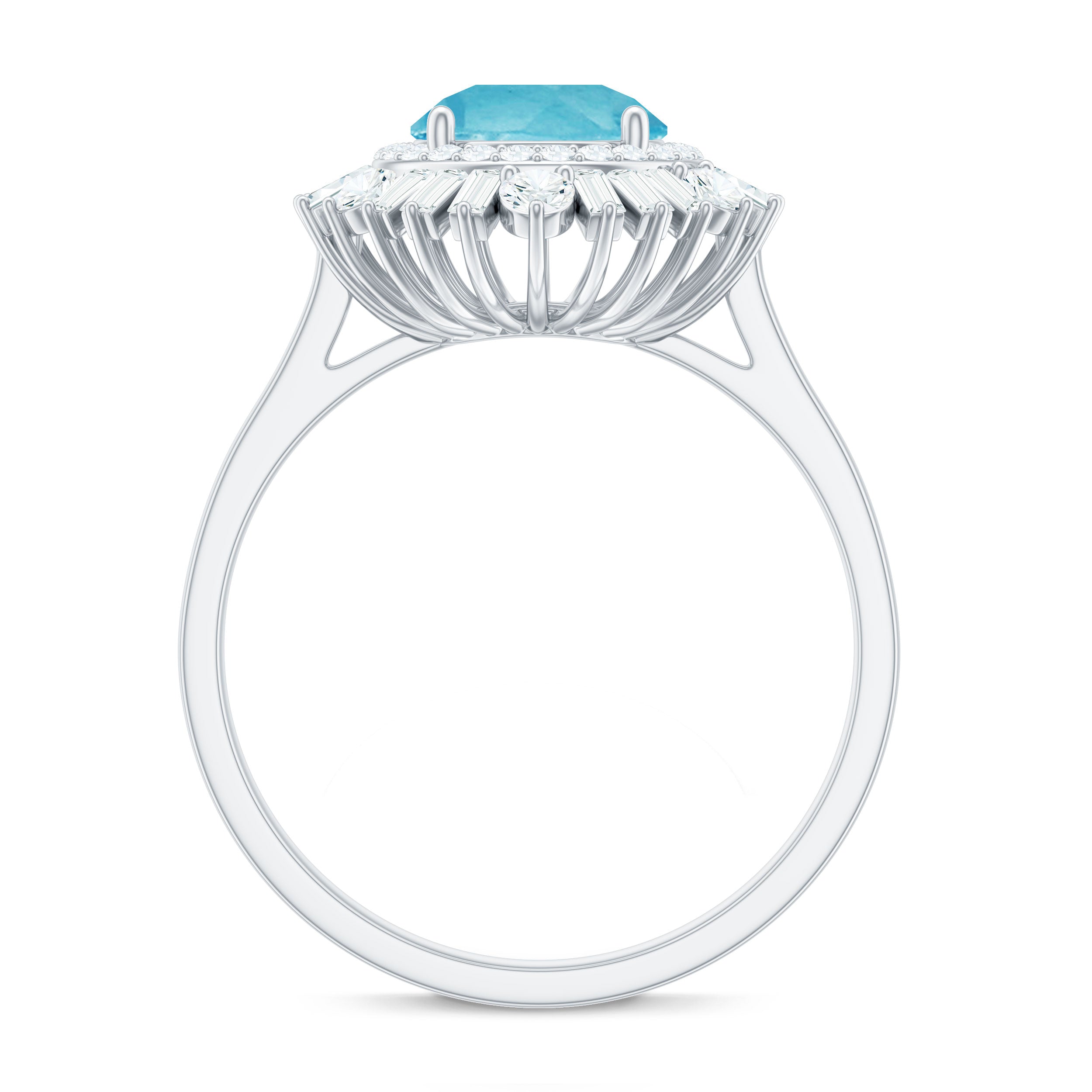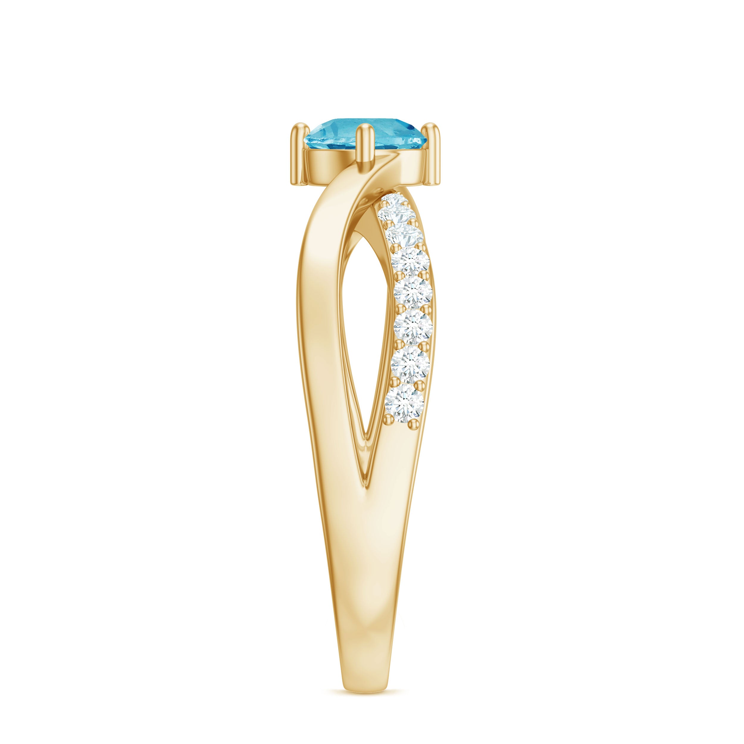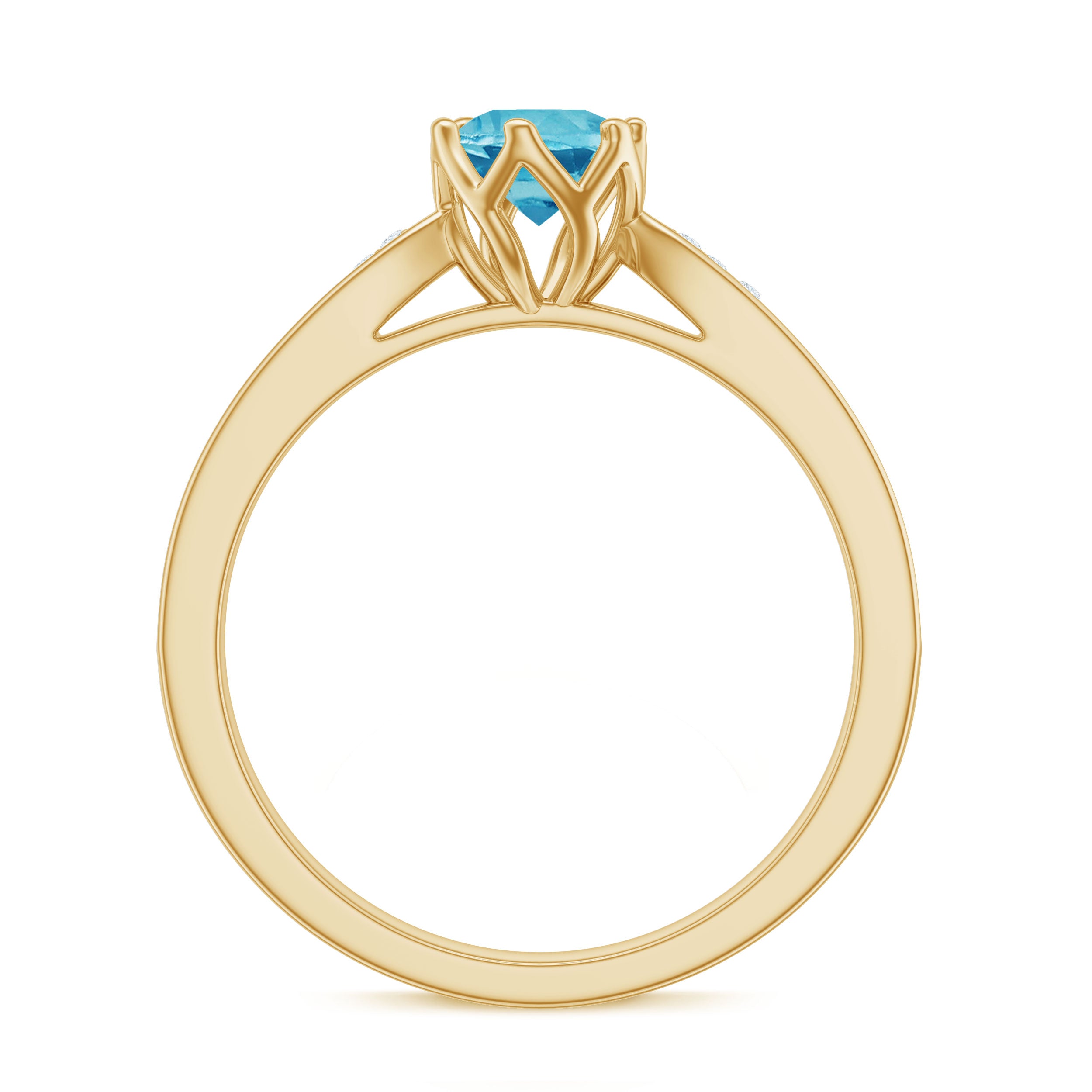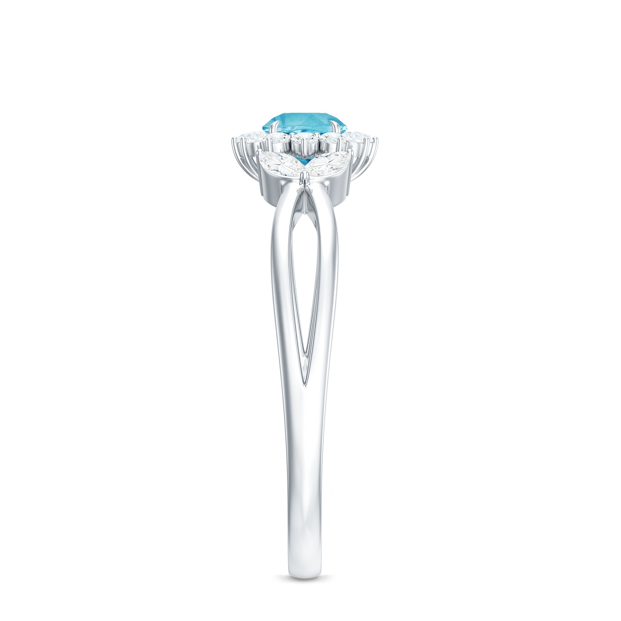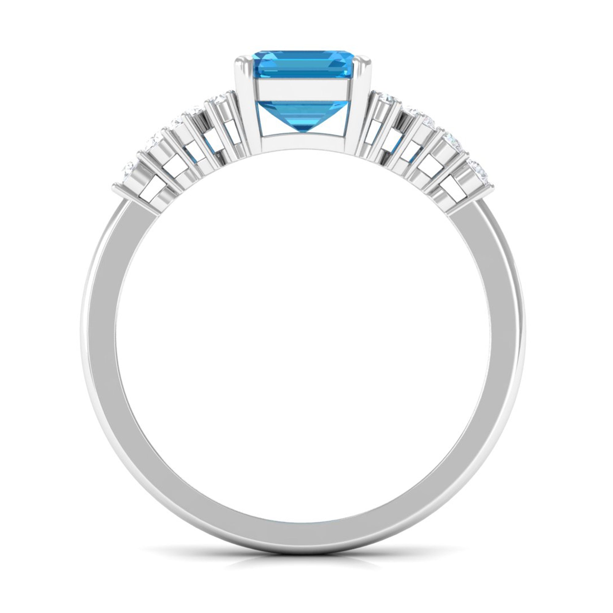 The center-stone of Swiss Blue Topaz here is sparkled up with the encircling of Diamond/Moissanite (that we fondly term ‘Halo’). That makes the Swiss Blue Topaz appear even brighter while highlighting its beauty at its best. Surprisingly, it also gives off the illusion of a bigger Topaz. So, if a Swiss Blue Topaz and Diamond Ring is on your list, this style might turn out to be your best bet.