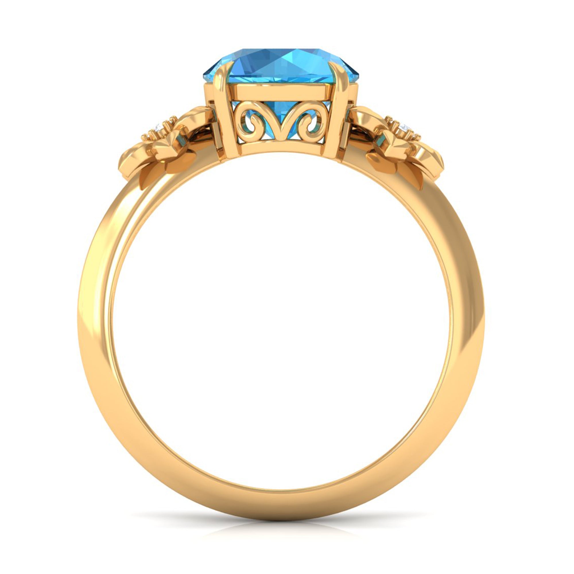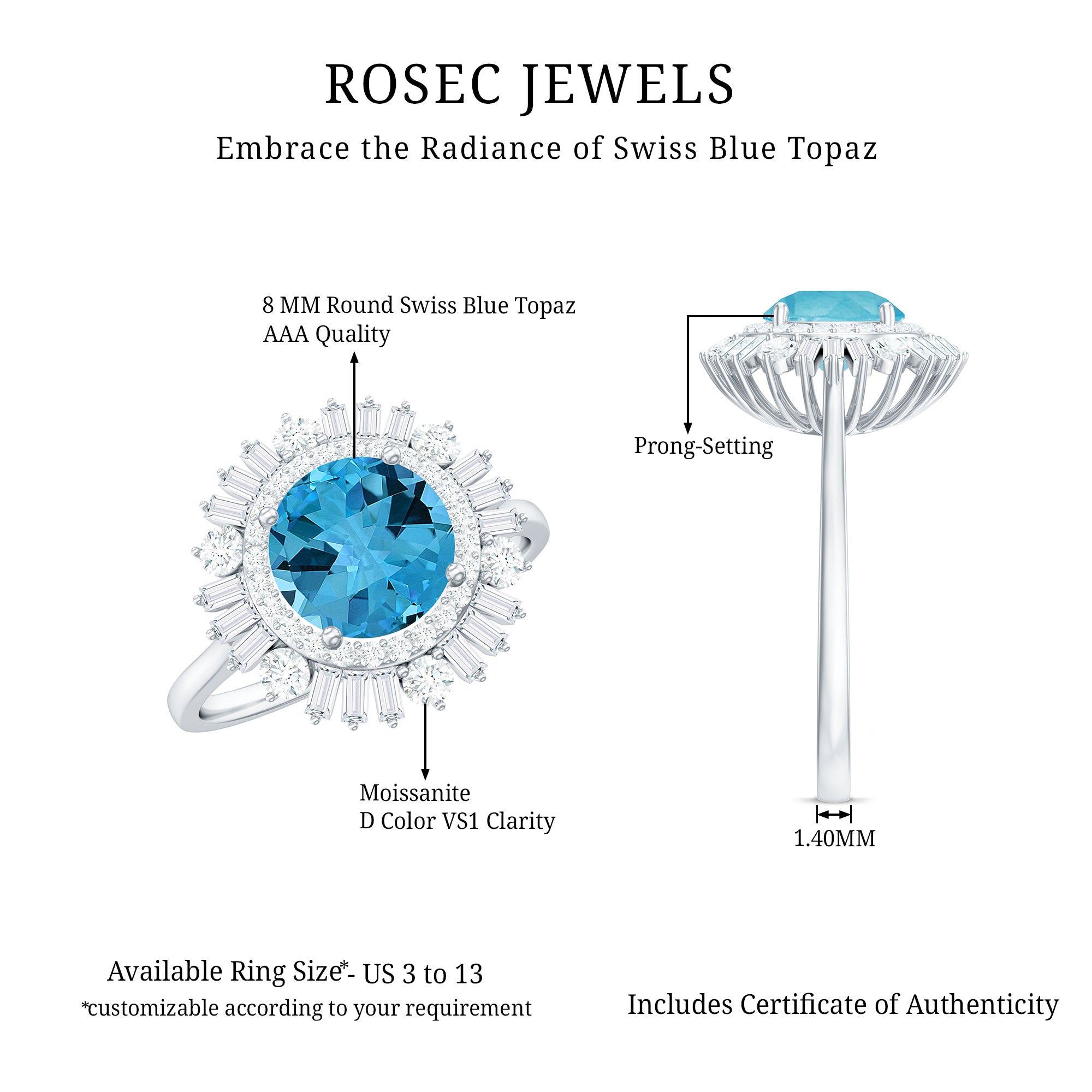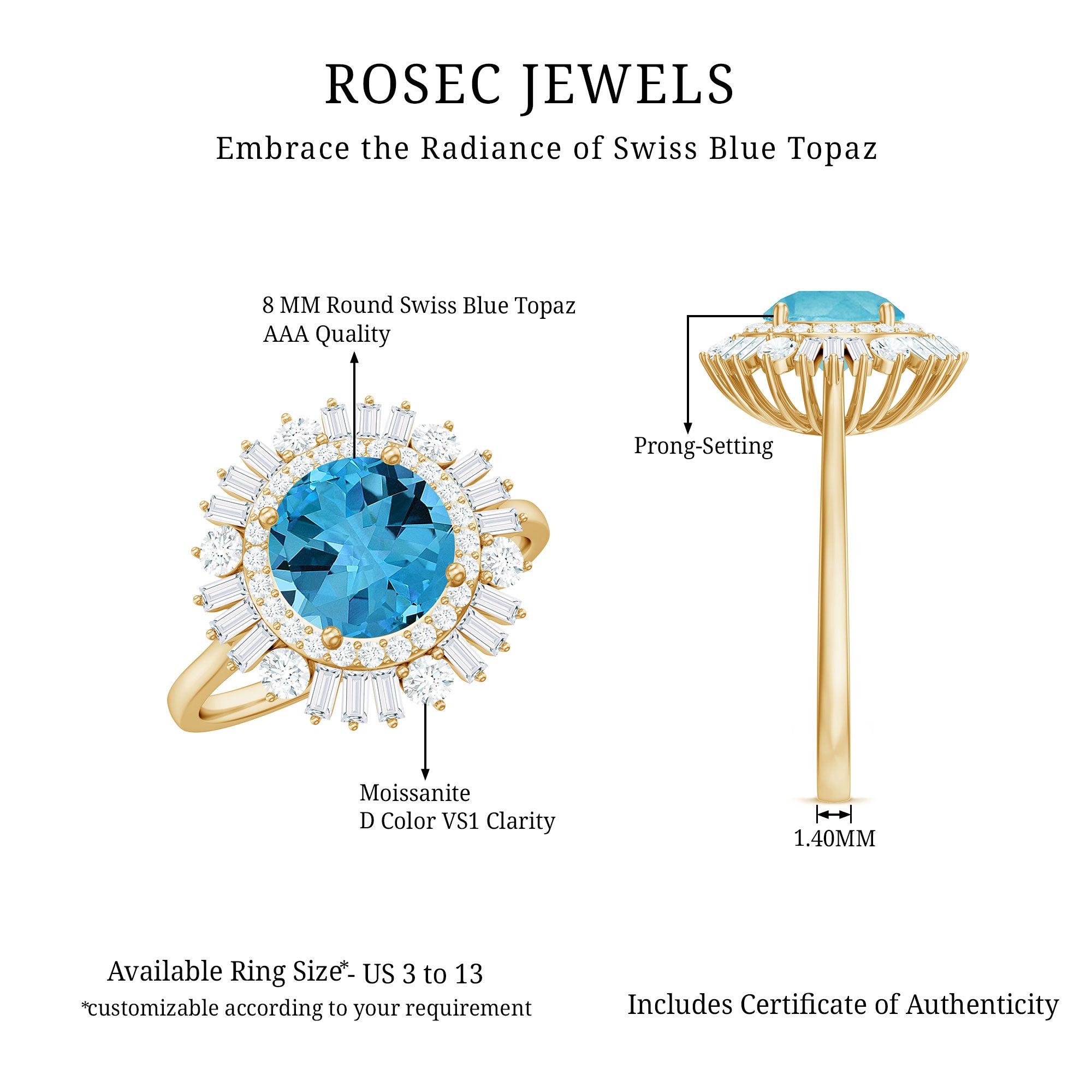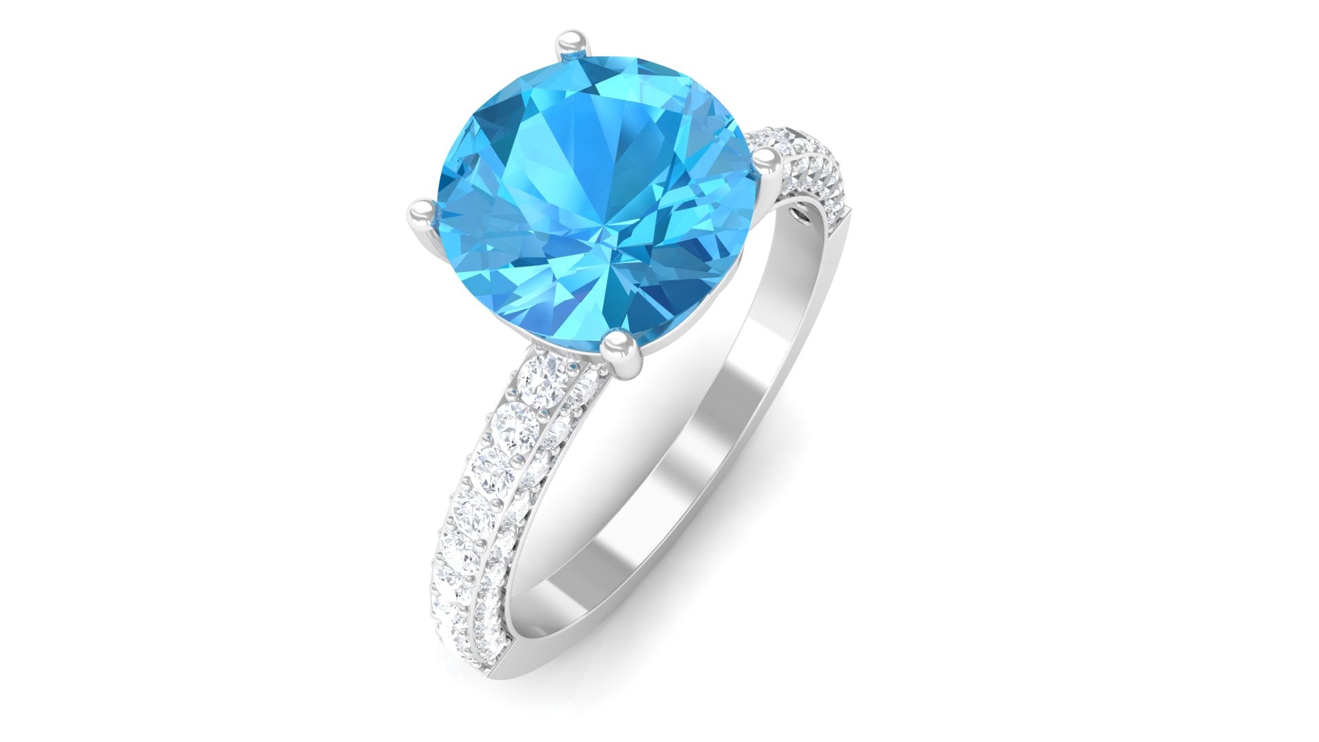 Treasured as one of the most flashy and flamboyant ring styles out there, a Swiss Blue Topaz Cocktail Ring is adorned by an enormous center stone of Swiss Blue Topaz. It is further beautified by eye-striking patterns of side-stones of Diamond/Moissanite under floral, antique, or any other statement-making design.