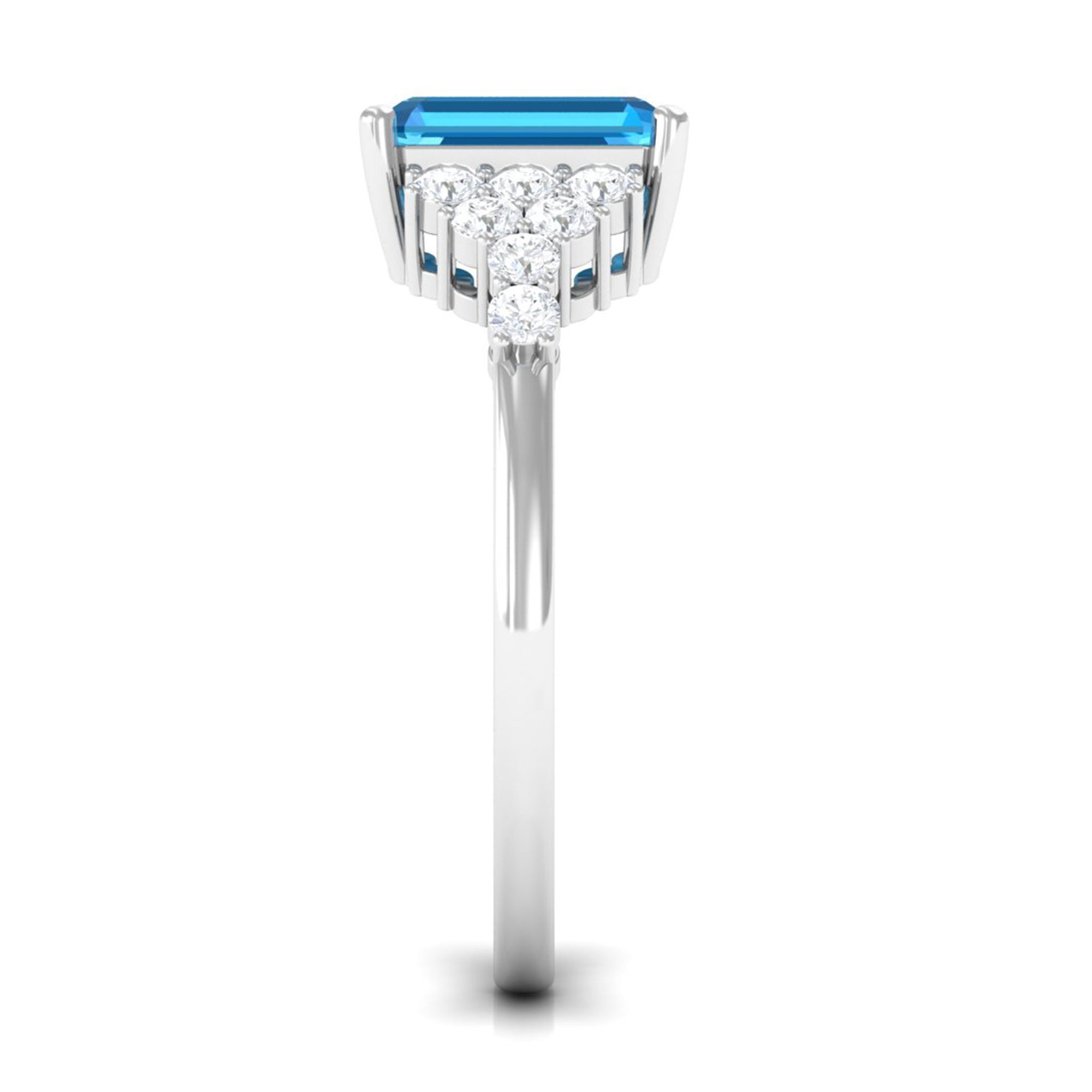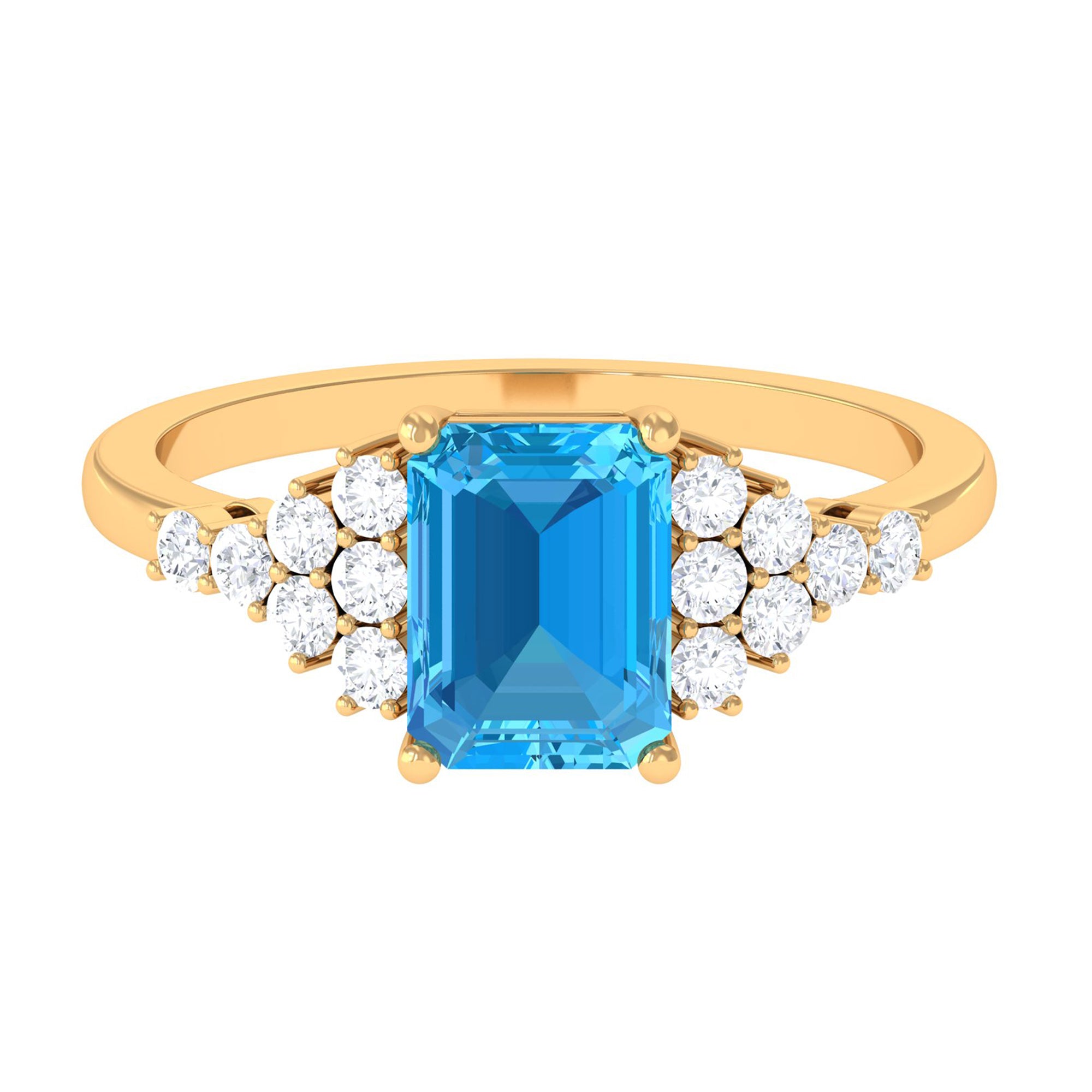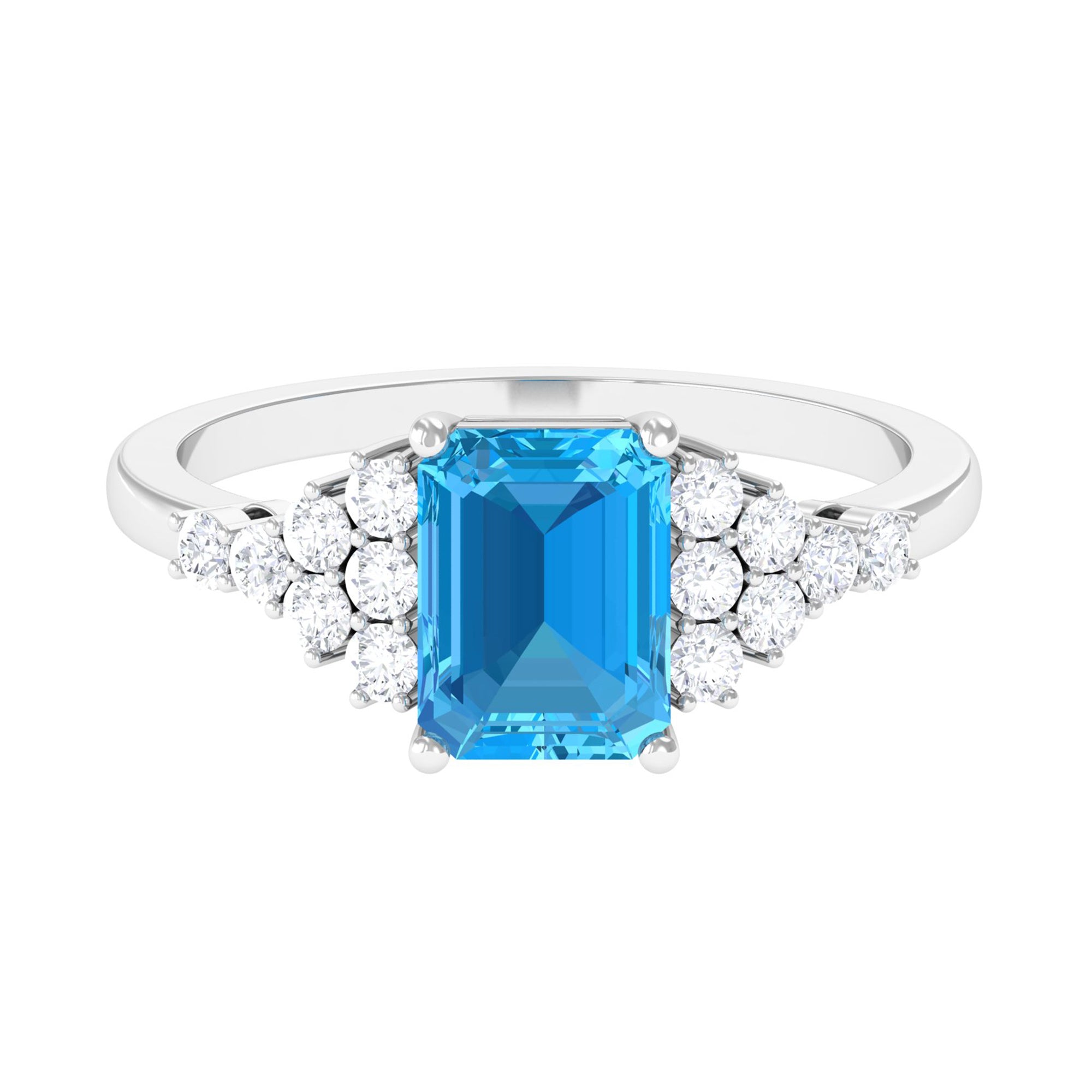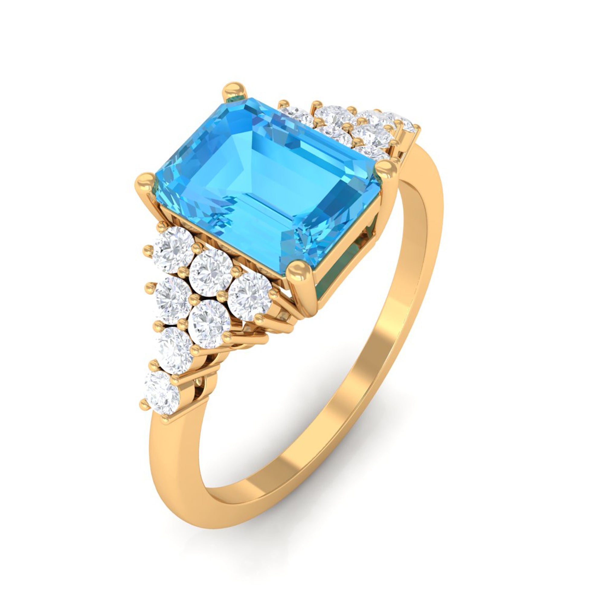 Treasured as one of the most flashy and flamboyant ring styles out there, a Swiss Blue Topaz Cocktail Ring is adorned by an enormous center stone of Swiss Blue Topaz. It is further beautified by eye-striking patterns of side-stones of Diamond/Moissanite under floral, antique, or any other statement-making design.