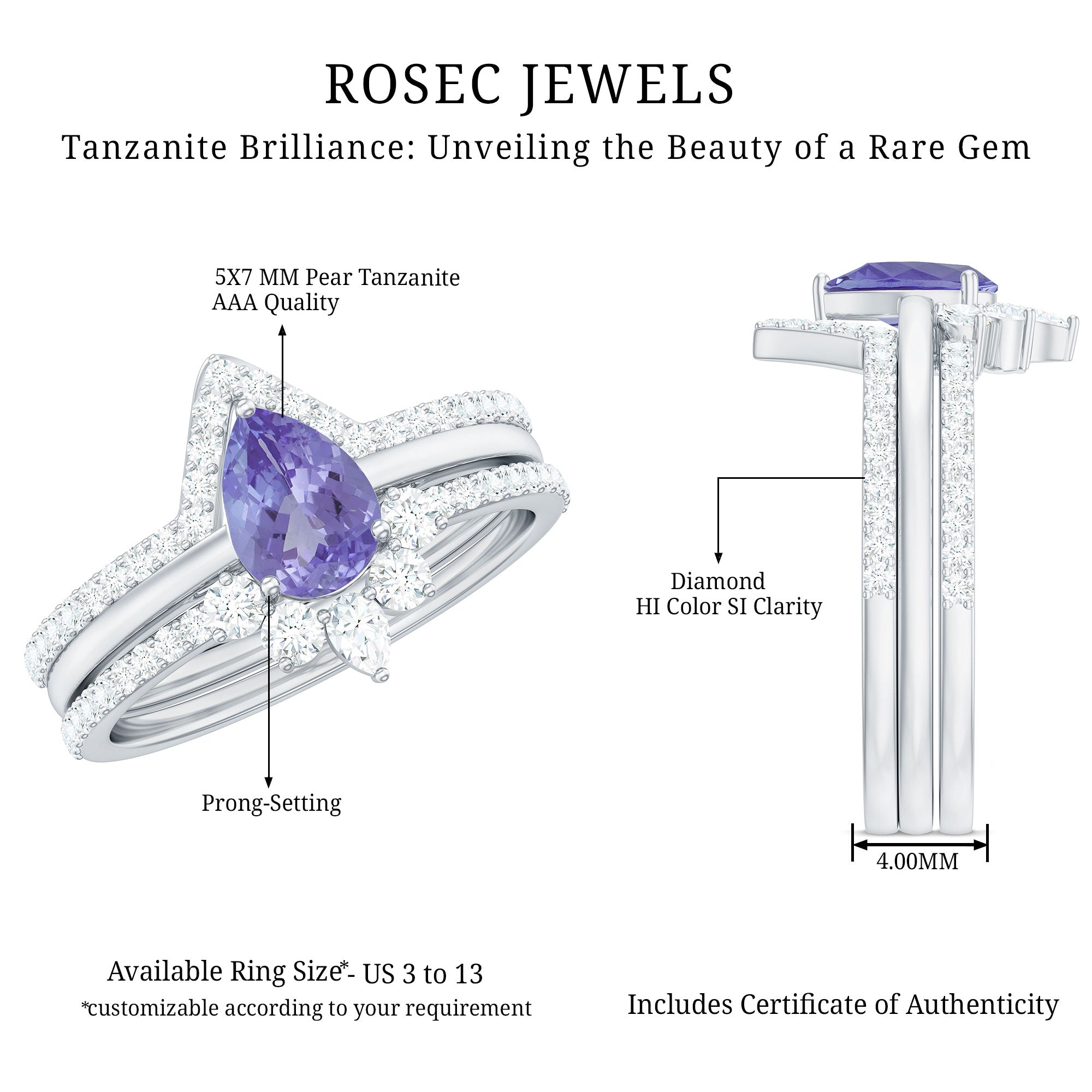 Tanzanite ranking 6-7 on Mohs scale of hardness is quite durable and suitable for crafting adorable tanzanite wedding rings for women.