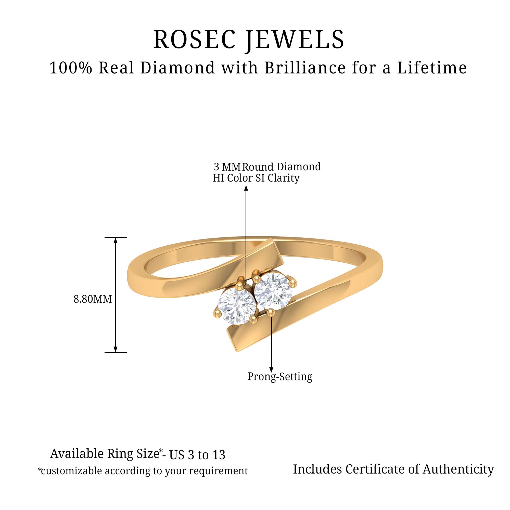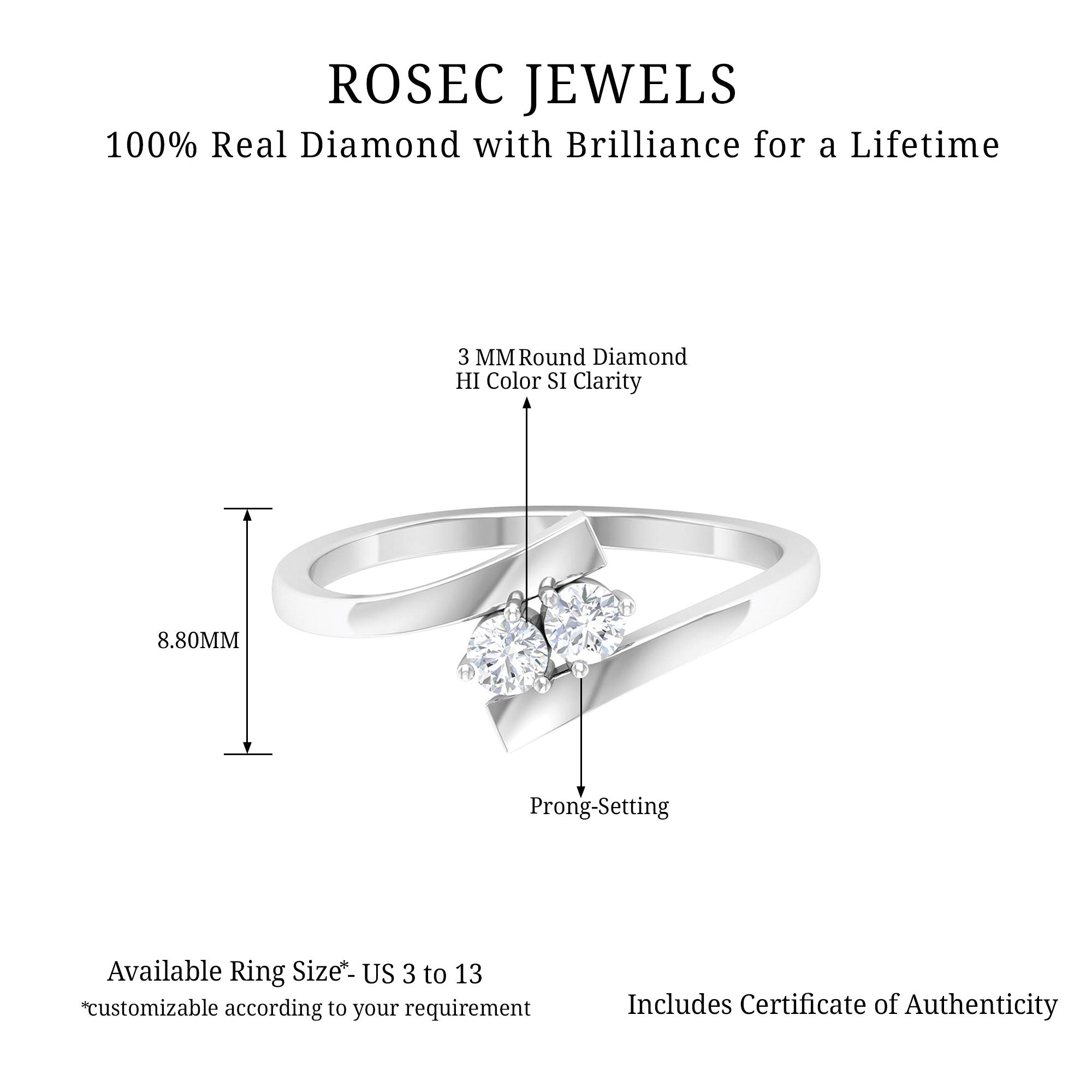 Round: If you wish for a hint of classic touch in your Modern Toi Et Moi Ring, it’s best to go for the one fashioned with Conventional Round Cut Stones. What’s more, owing to the strategical arrangement of its 57 facets (per stone), it exudes an unparalleled brilliance.