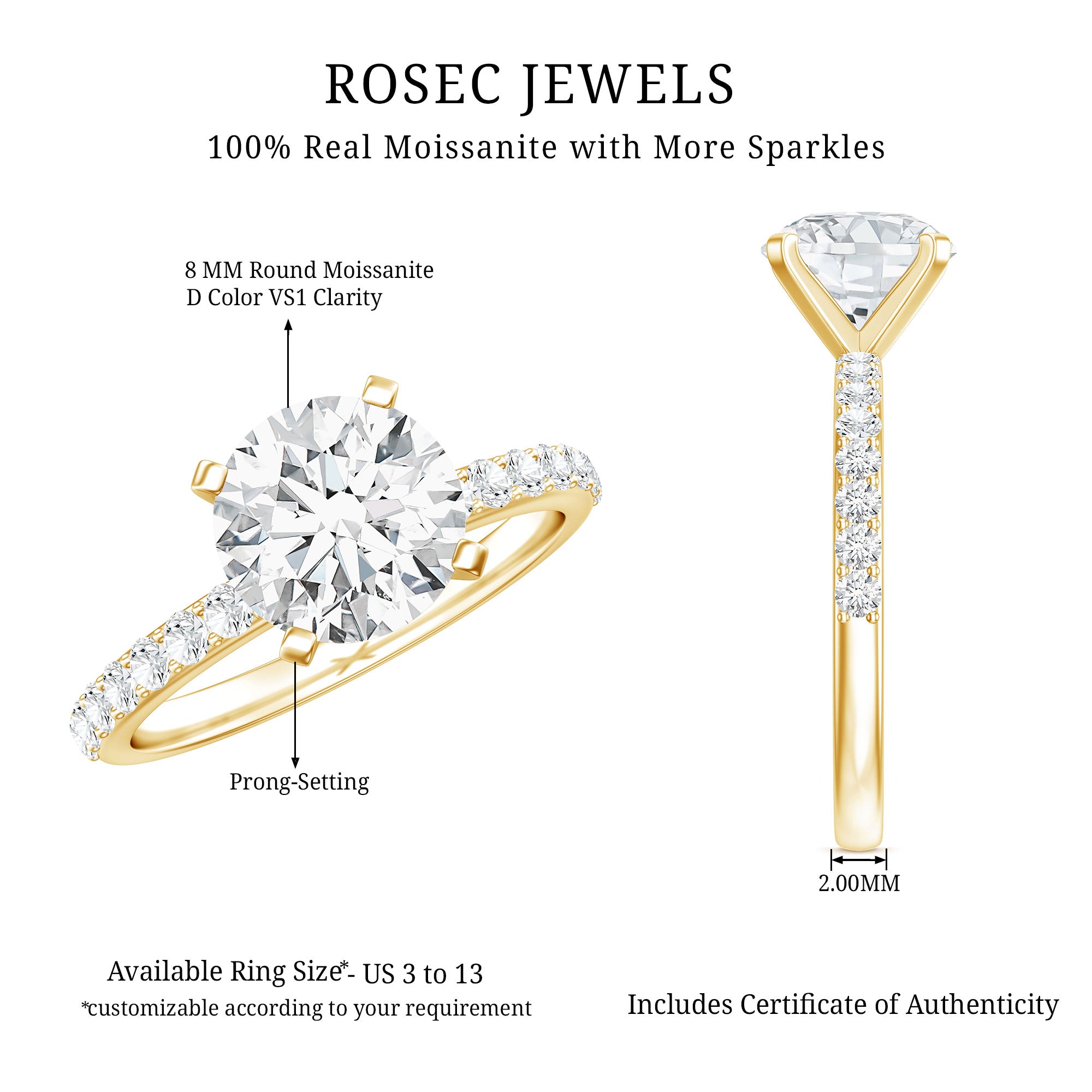 Pave setting is also another way to create more sparkles by adorning small diamonds/moissanites along the band with main stone in the center. The gemstones all around the band are known as full pave and when they cover half of the shank, they are known as half pave. This setting creates a shiny surface.