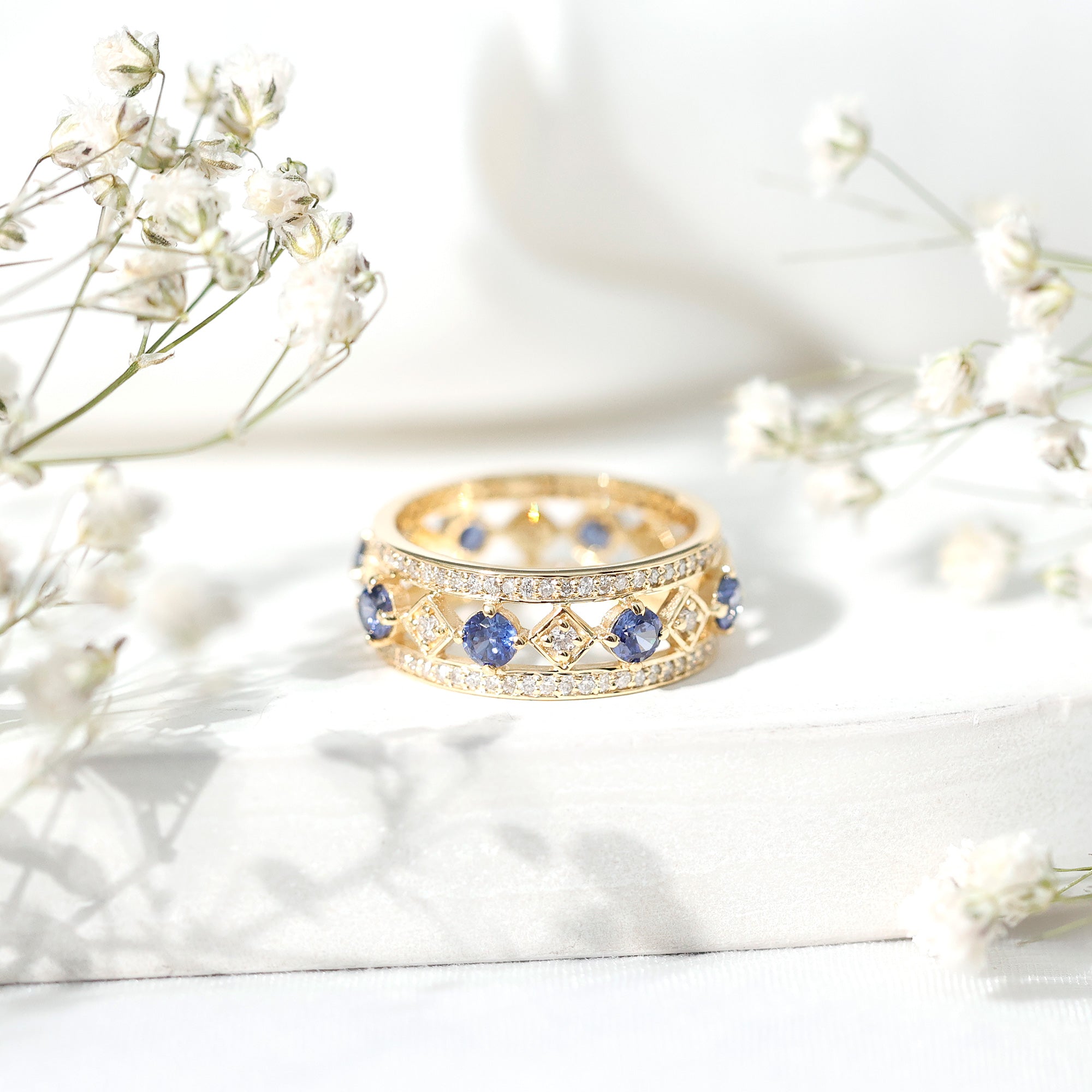 - Best for stacking: bands with smoother shoulders pair more easily with wedding bands or enhancers.