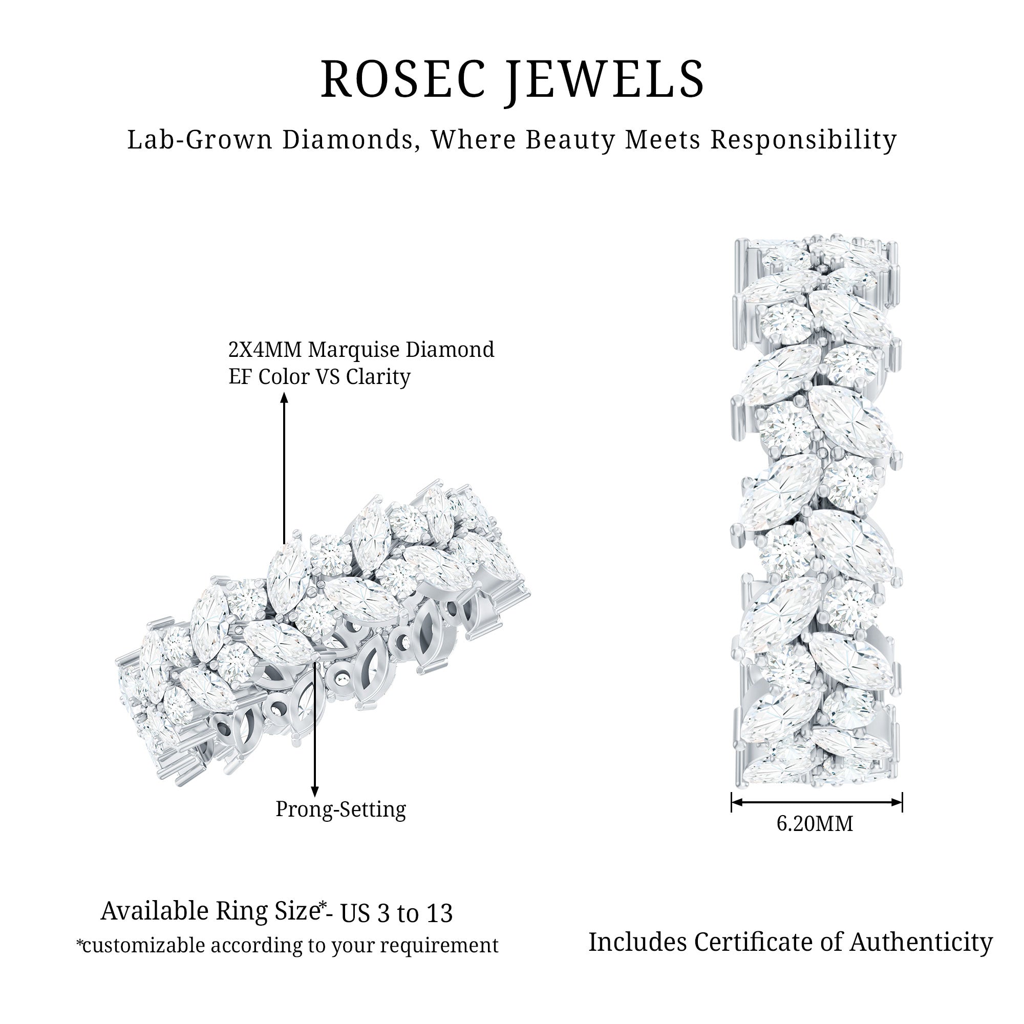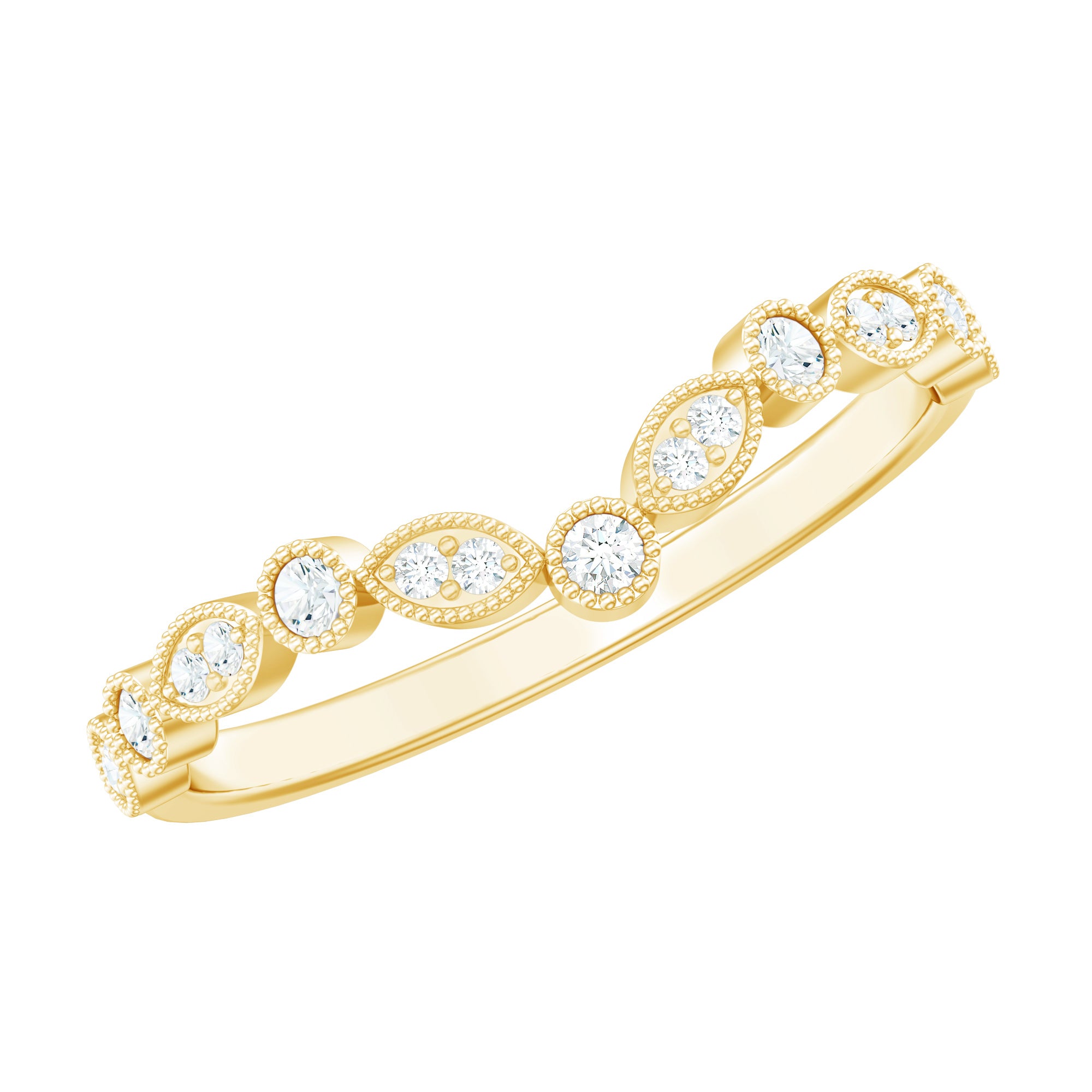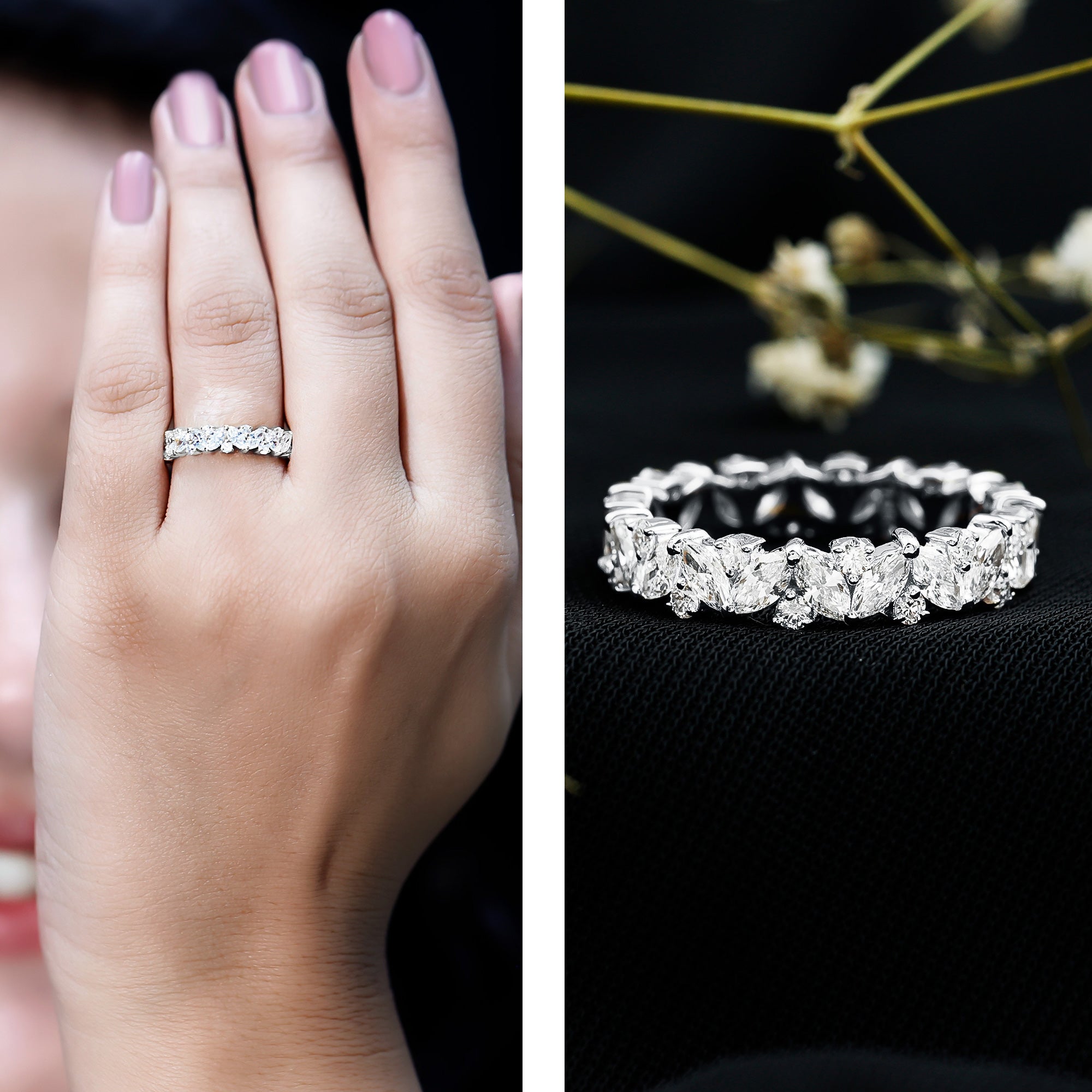 Marquise Wedding Bands: Marquise wedding bands would fascinate you with their timeless charm. Elongated gemstone with pointed tips in the ring stands out as a stylish piece with vintage glam. Scattered marquise as cluster rings or east-west set marquise diamond eternity bands are some of the elegant designs that add a whimsical touch.