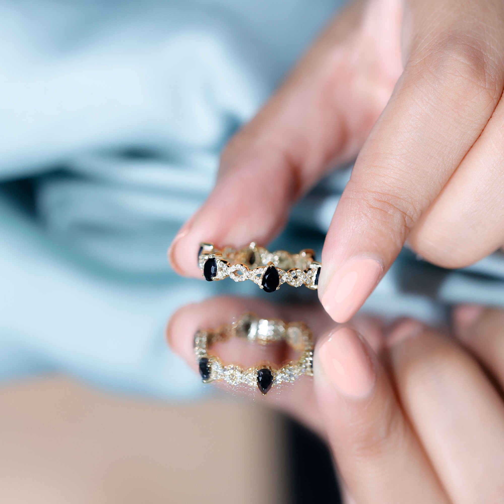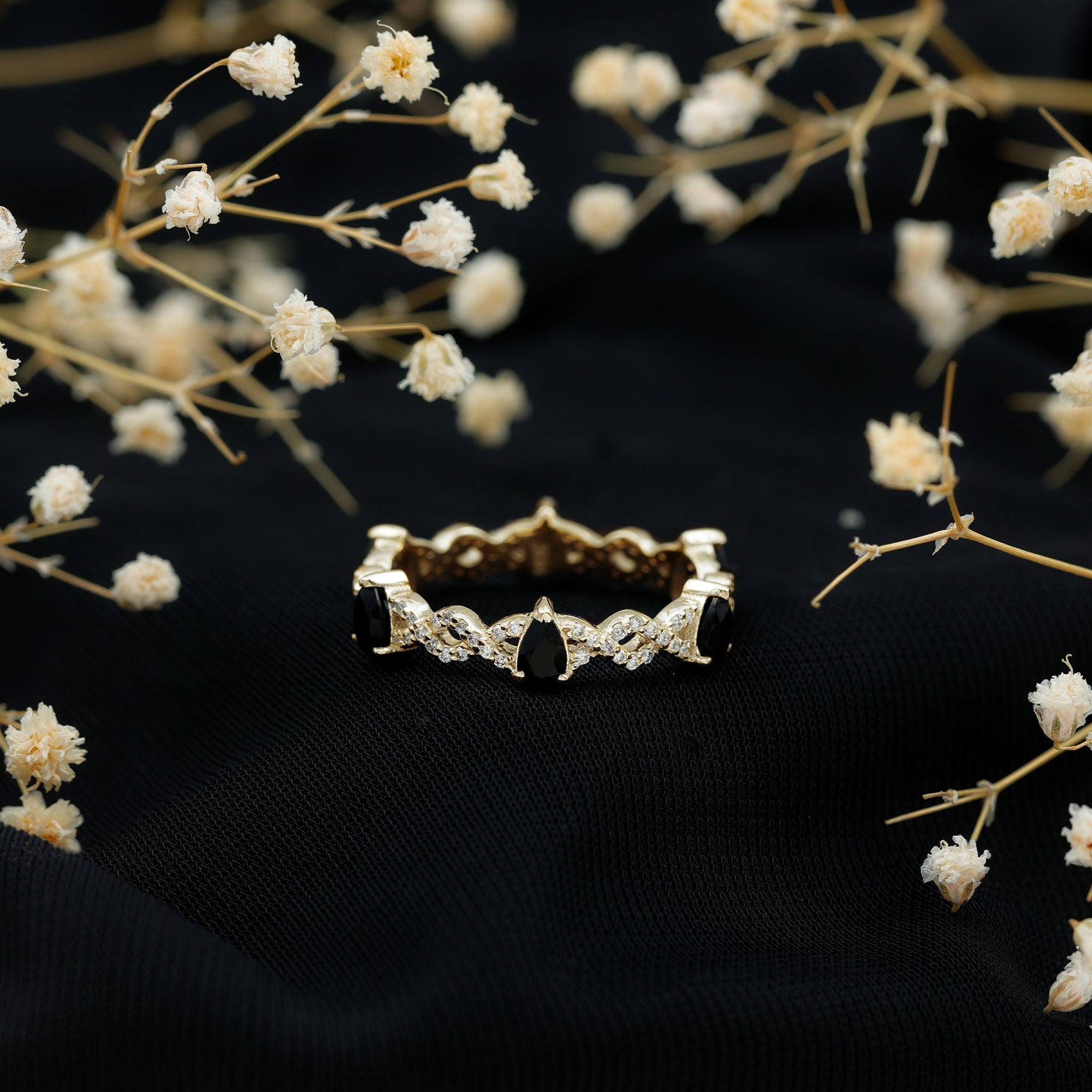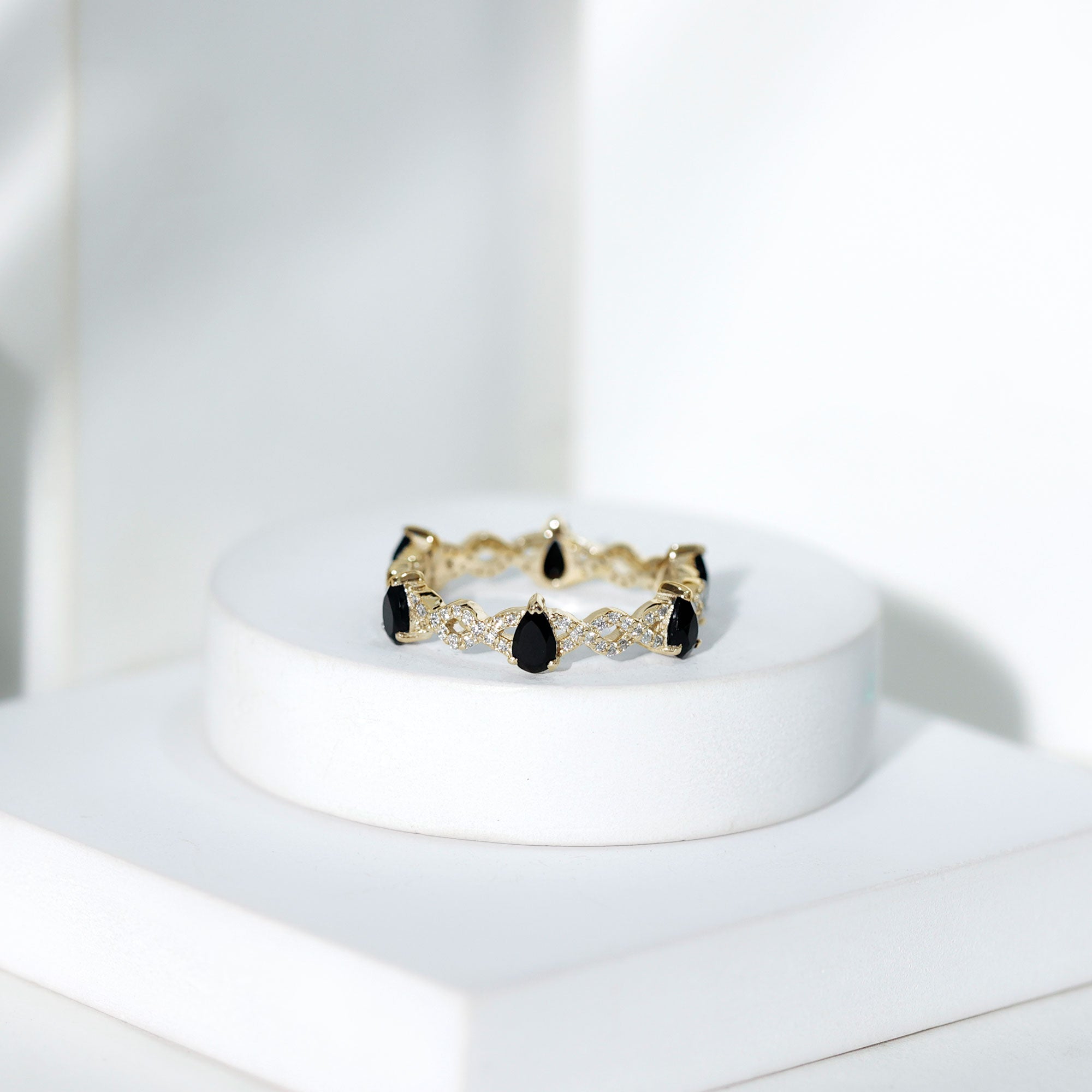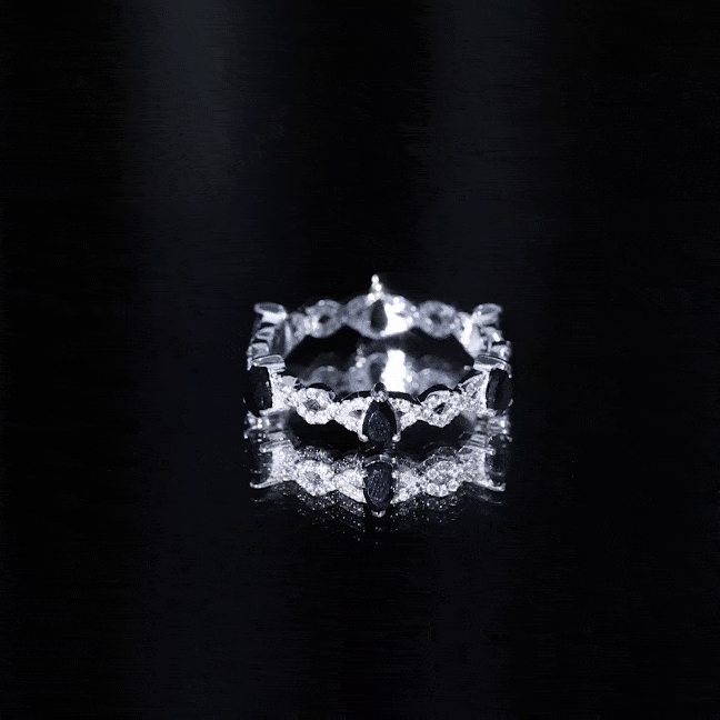 5. Pear Shaped Rings for Wedding Bands: Pear or teardrop wedding rings feature a gemstone with rounded ends and pointed tip. Pear gemstone with a flattering silhouette, elongates the finger, and showcases the gem’s color transitions very well. Crafted side by side or accented with other traditional cuts, pear moissanite wedding rings present classic designs with a stylish touch.