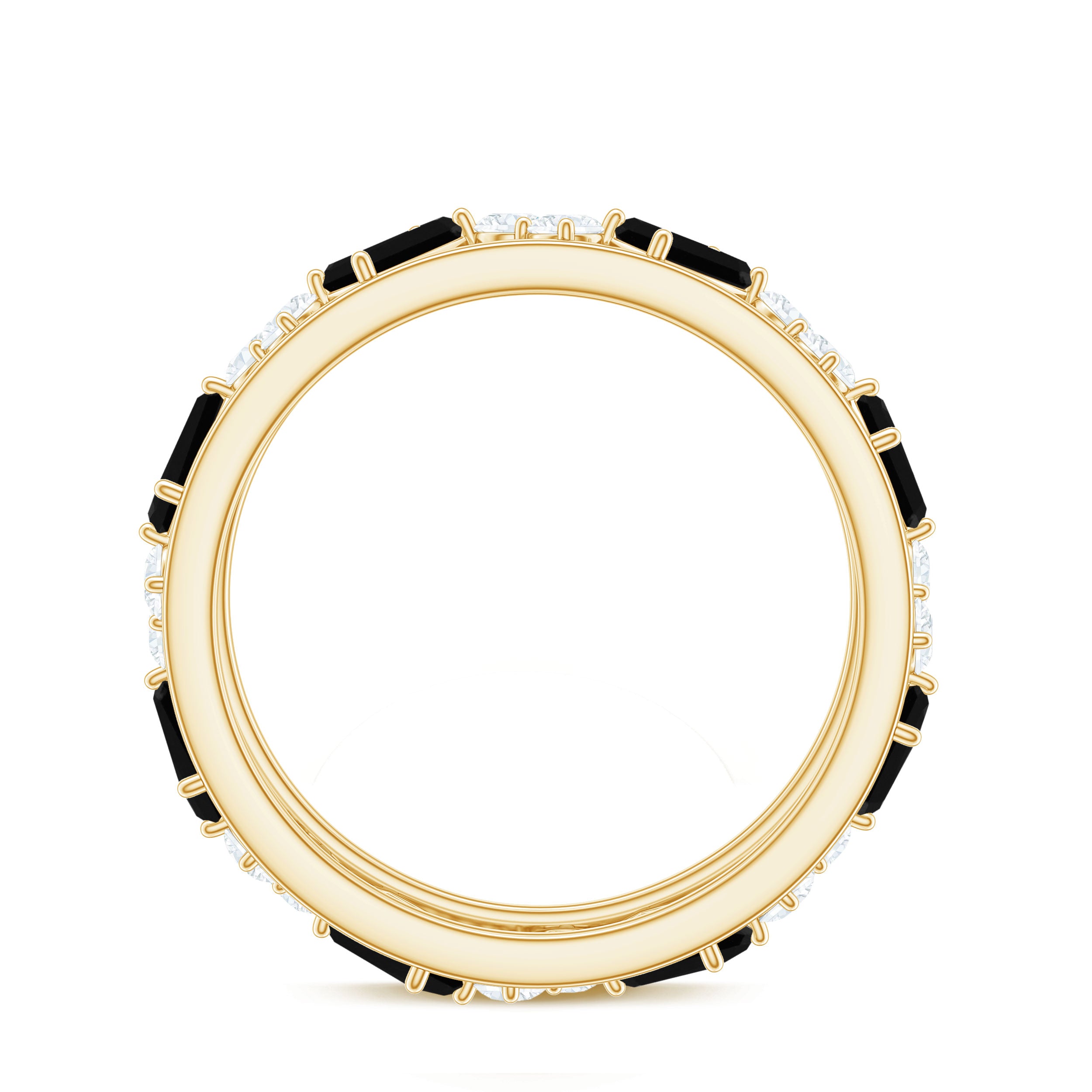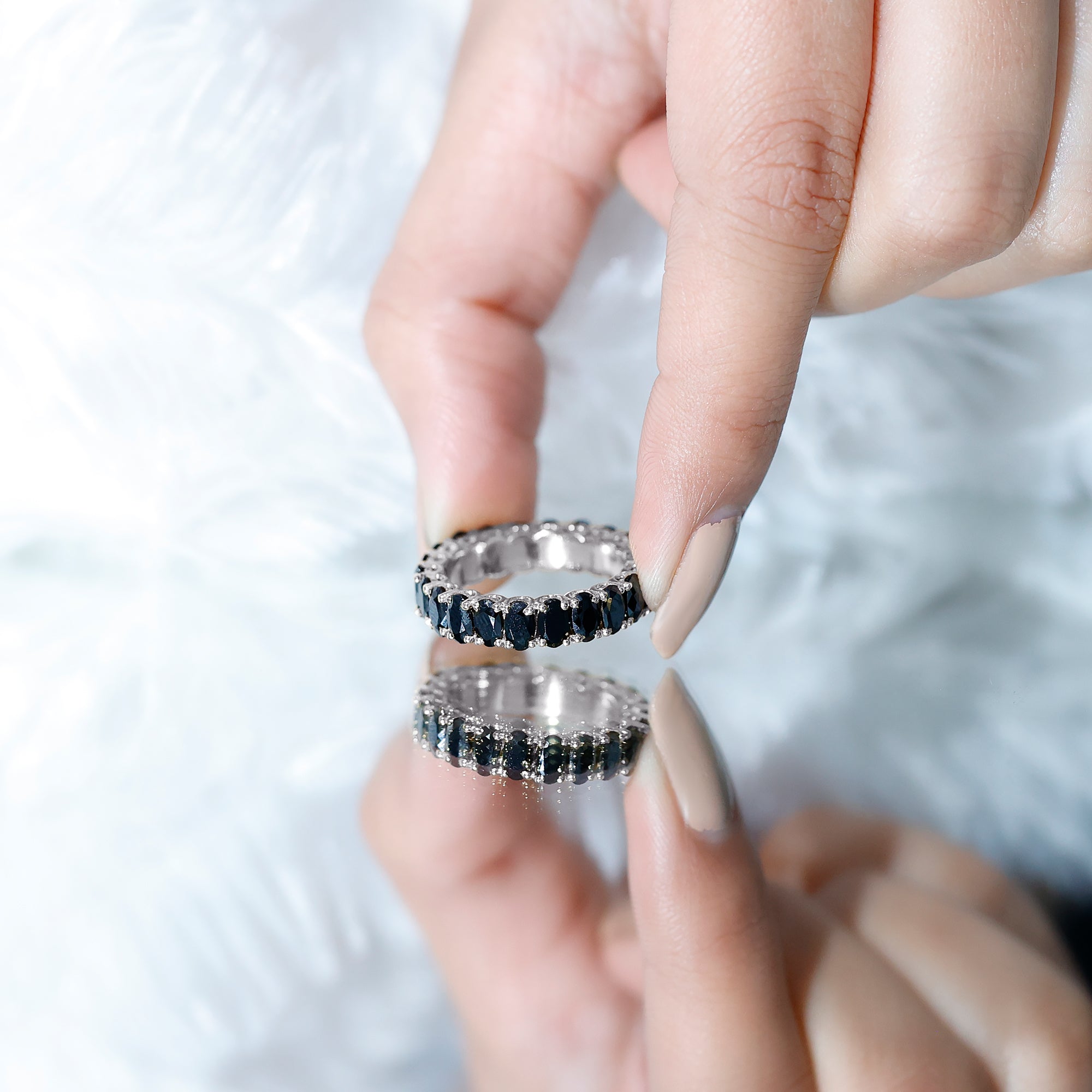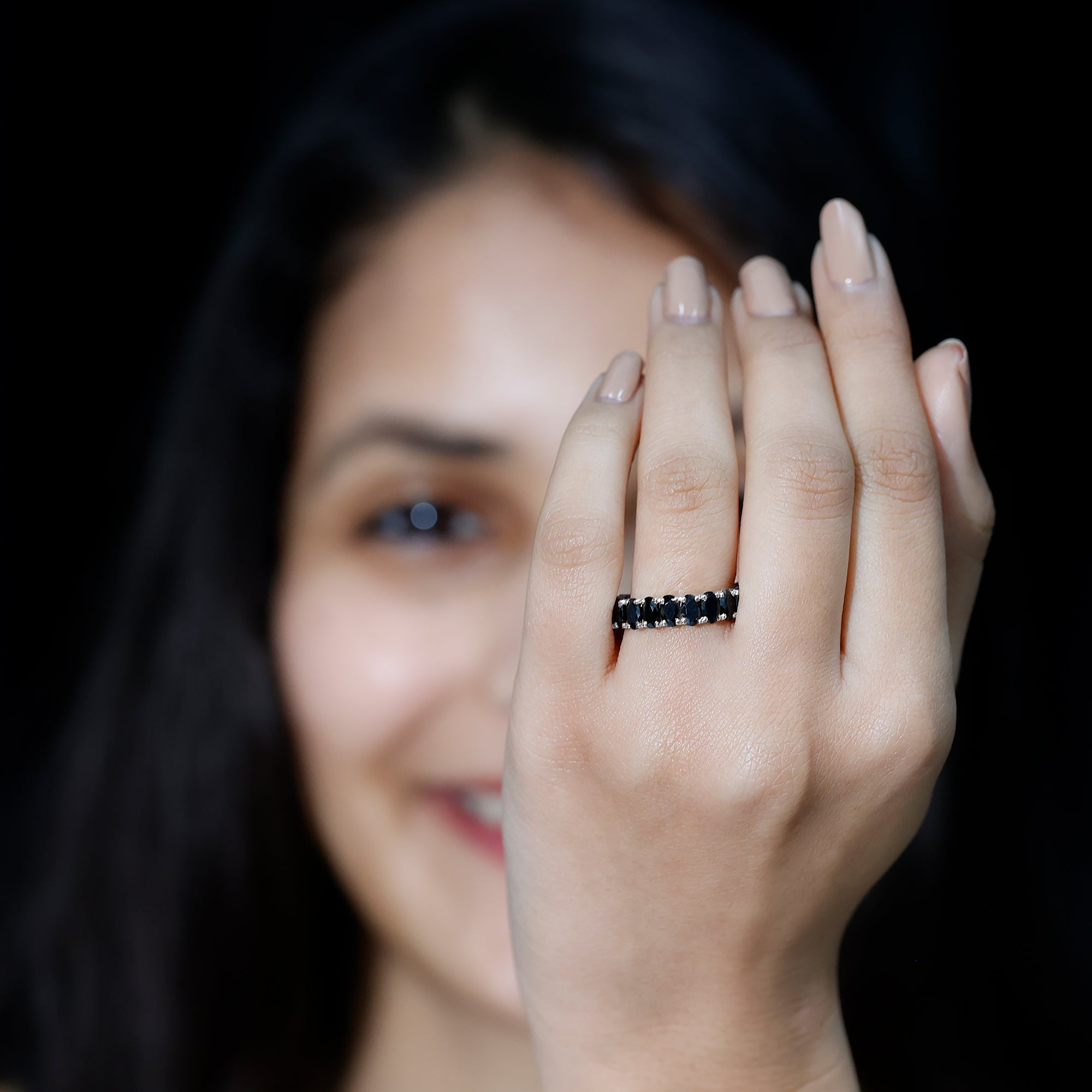 1. Baguette Wedding Rings: Baguette wedding bands are known for their larger gemstone illusion, vintage glam, and distinctive yet understated elegance. Tilted baguette sapphires, straight baguette moissanites, or any other colored or sparkling gemstone wedding bands can add a touch of sparkle to your engagement ring.