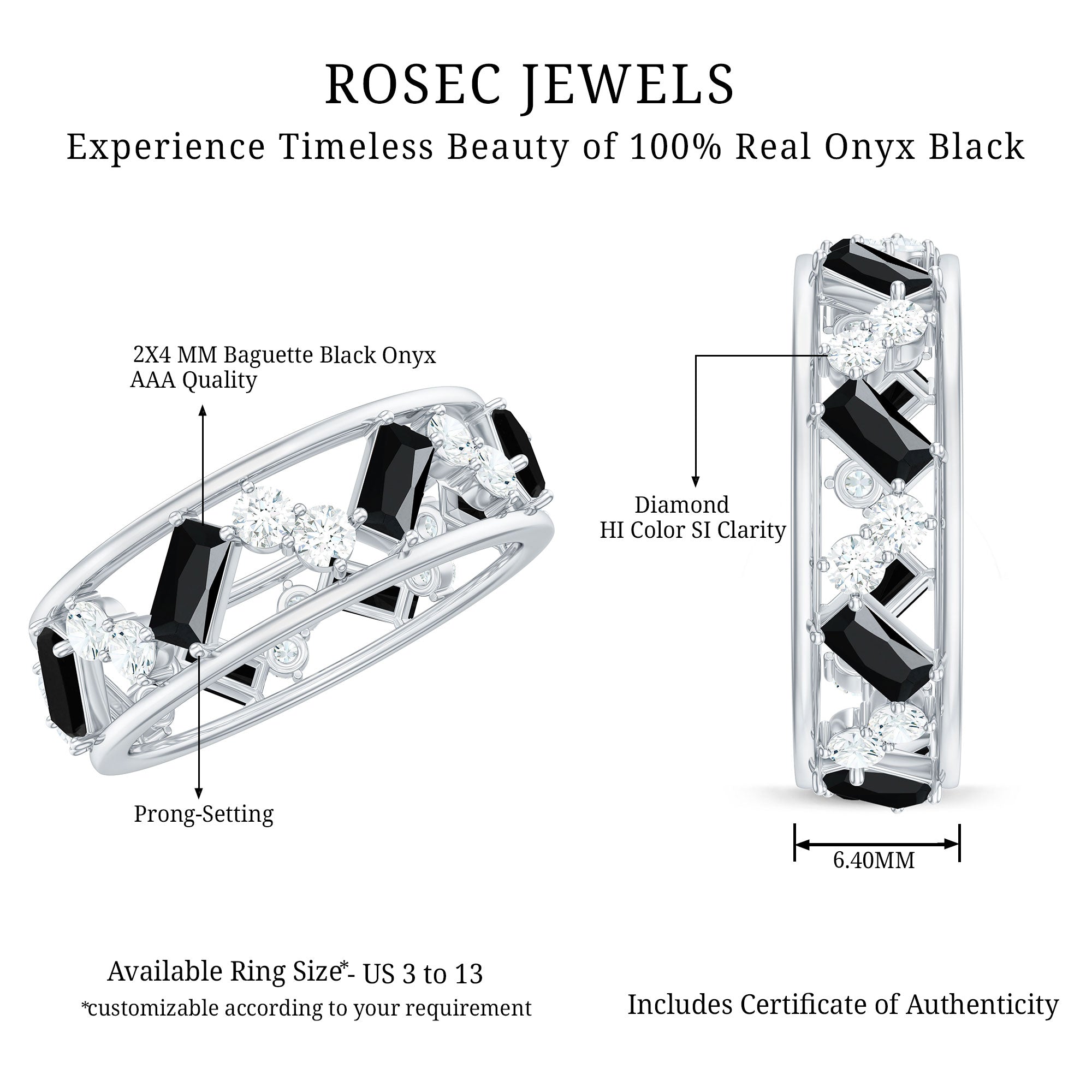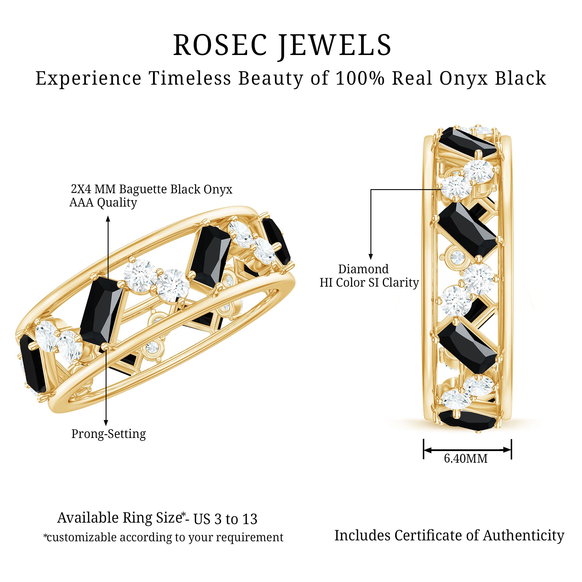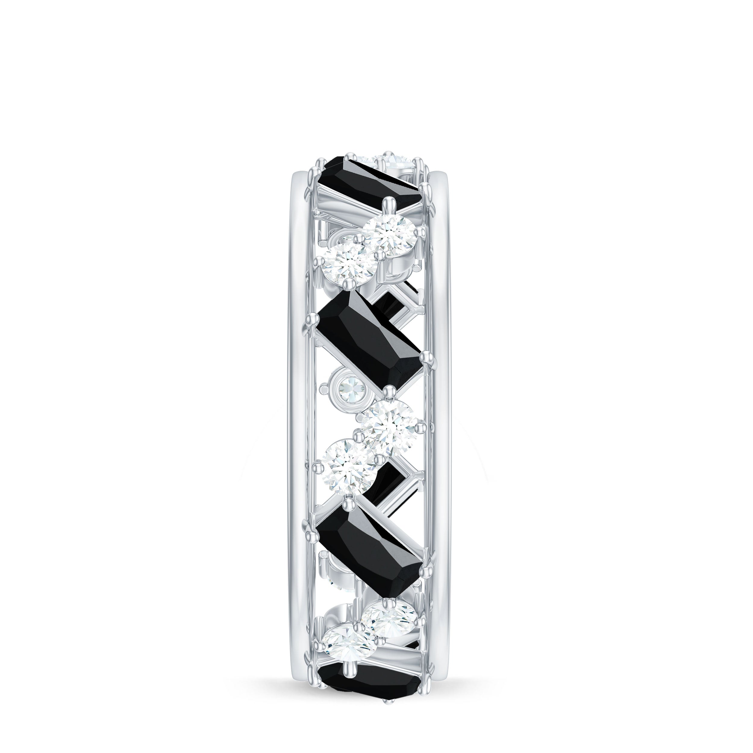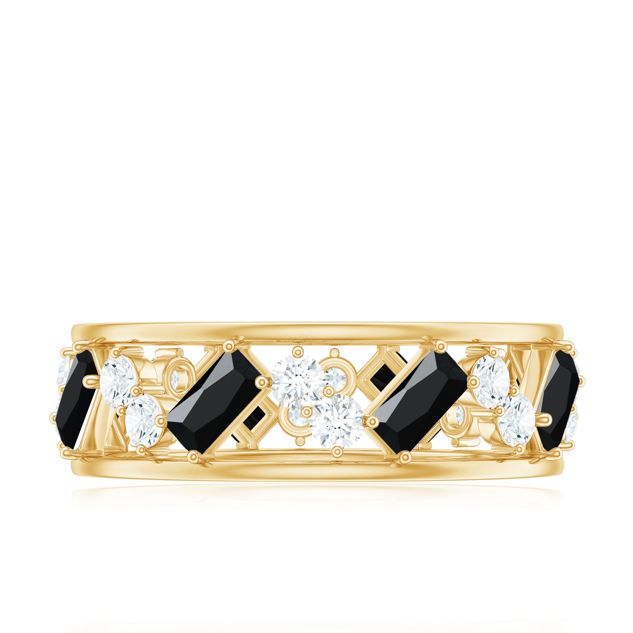 1. Baguette Wedding Rings: Baguette wedding bands are known for their larger gemstone illusion, vintage glam, and distinctive yet understated elegance. Tilted baguette sapphires, straight baguette moissanites, or any other colored or sparkling gemstone wedding bands can add a touch of sparkle to your engagement ring.