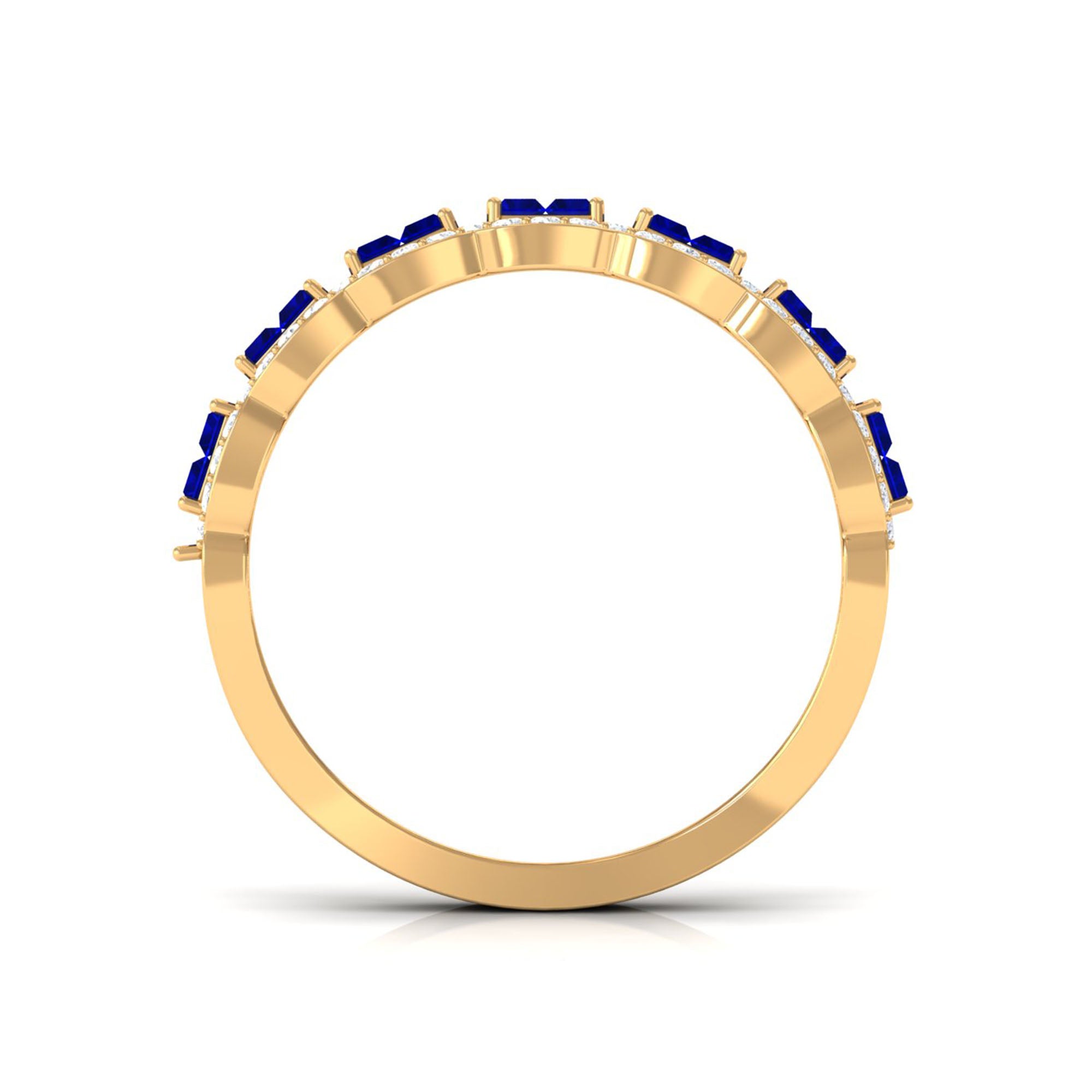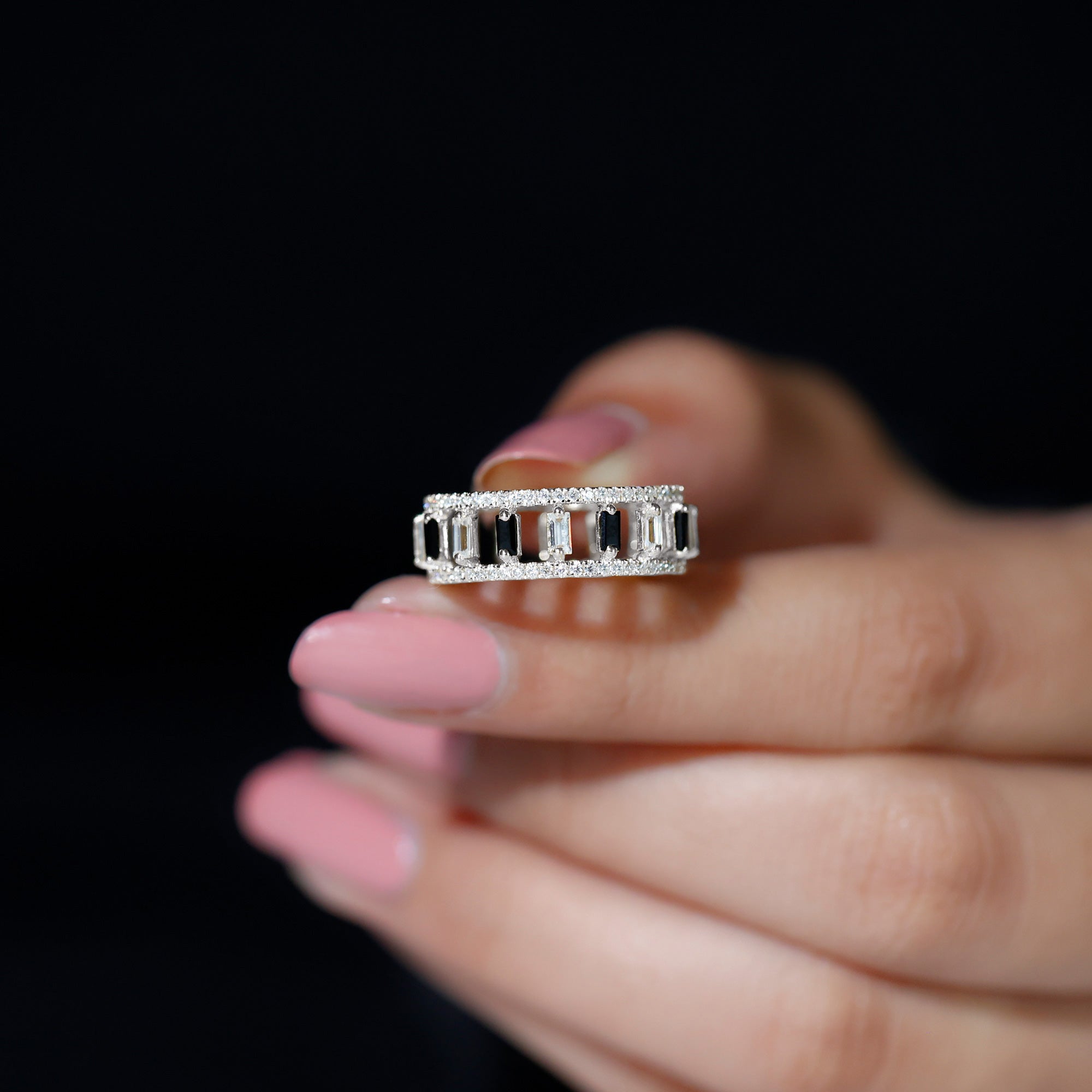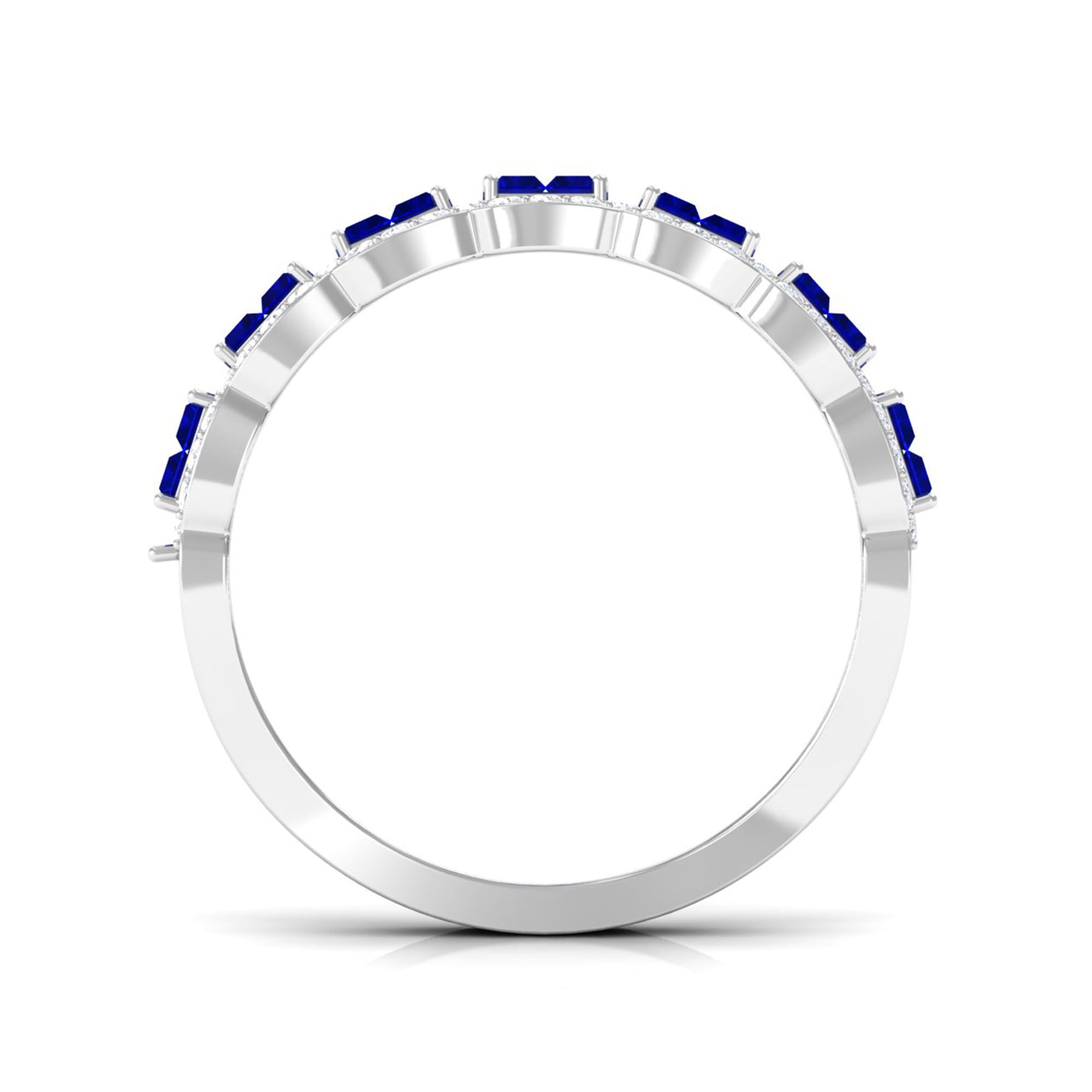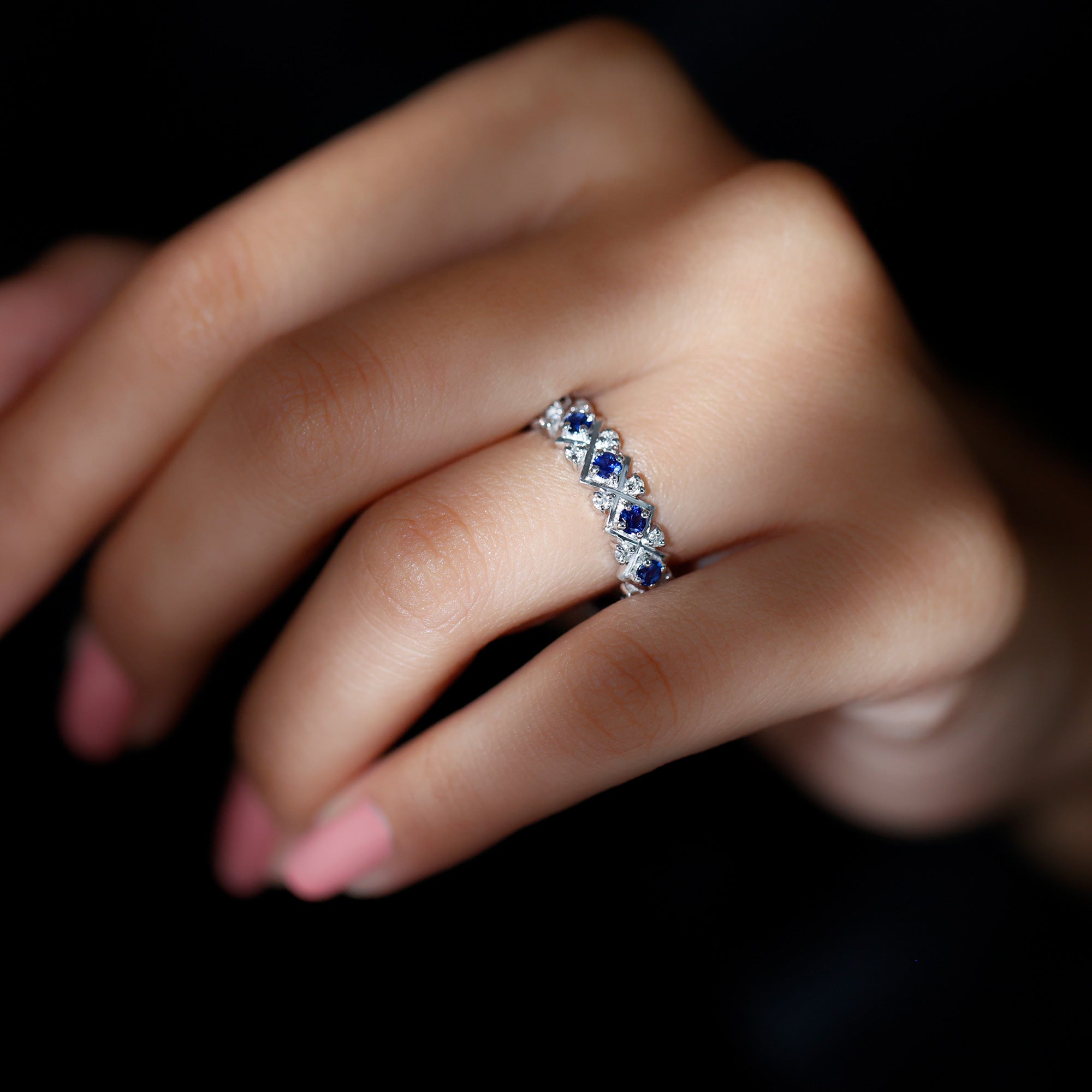 Baguette Wedding Rings: Baguette wedding bands are known for their larger gemstone illusion, vintage glam, and distinctive yet understated elegance. Tilted baguette sapphires, straight baguette moissanites, or any other colored or sparkling gemstone wedding bands can add a touch of sparkle to your engagement ring.