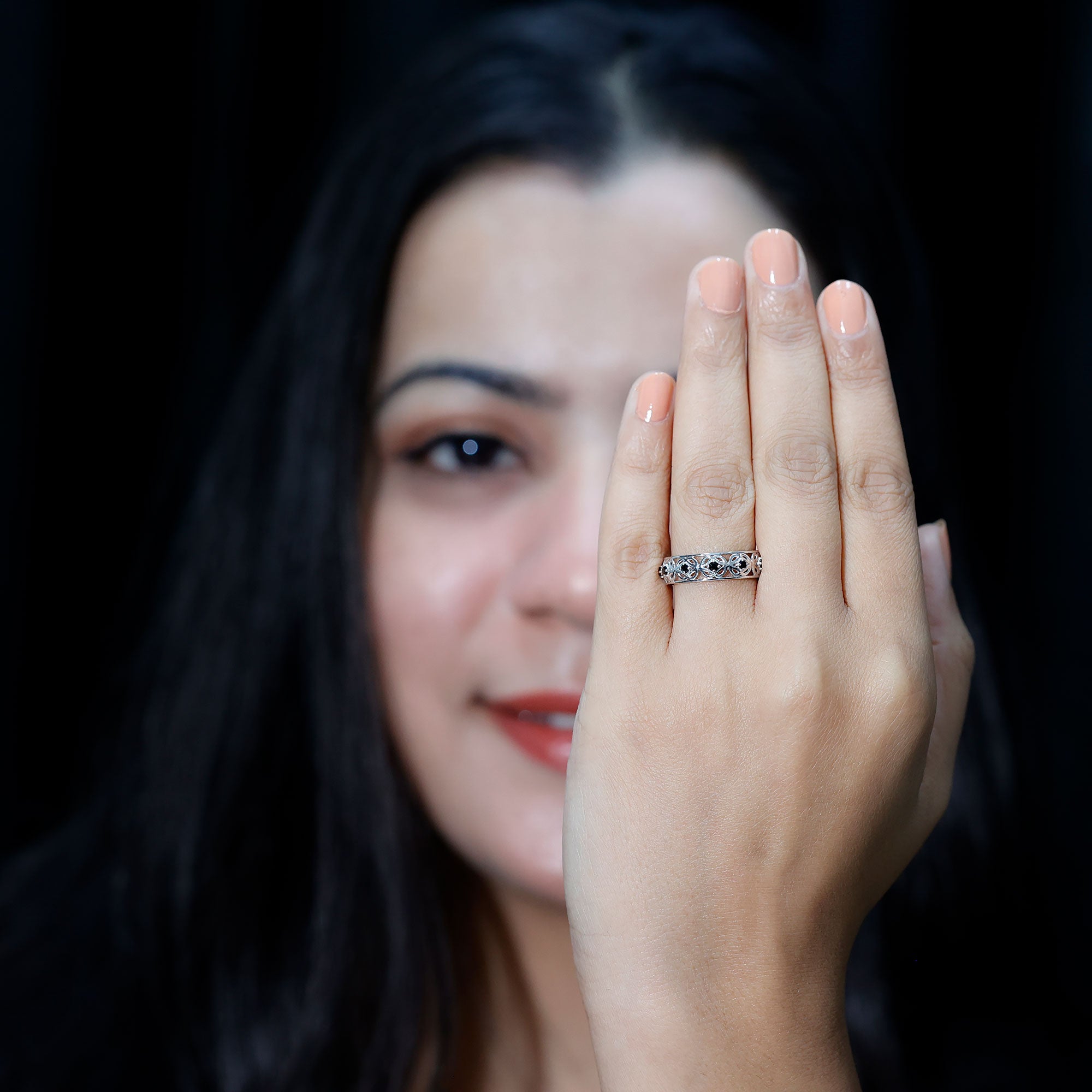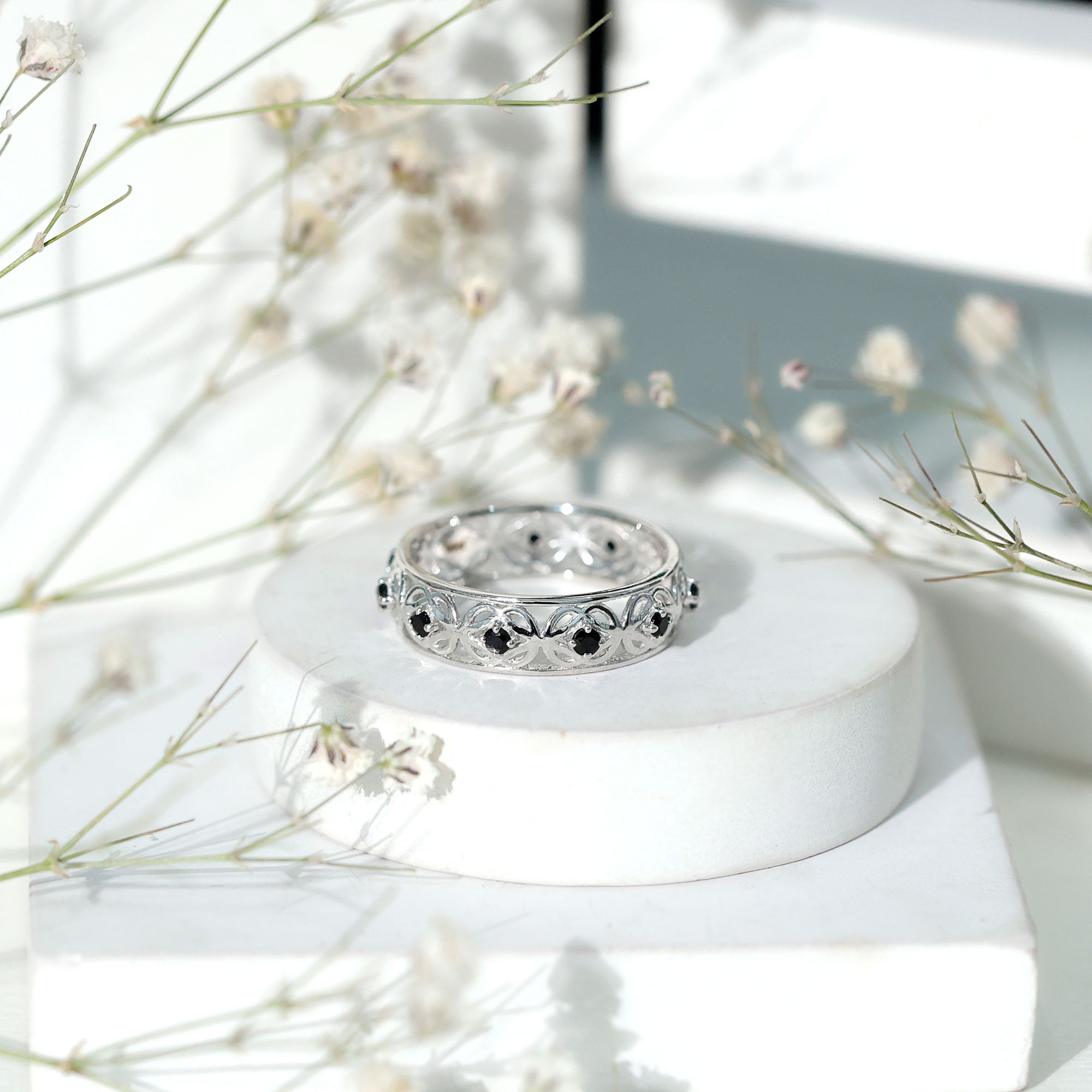 Heart Wedding Bands: Heart shaped moissanite wedding bands are usually the choice of romantic couples, who look for symbolism, besides meaning in their ring. Ruby hearts with alternate diamond hearts or topaz hearts side by side with their clefts facing opposite direction create stunning visual appeal. Explore more such heartfelt symbols in our wedding bands collection.