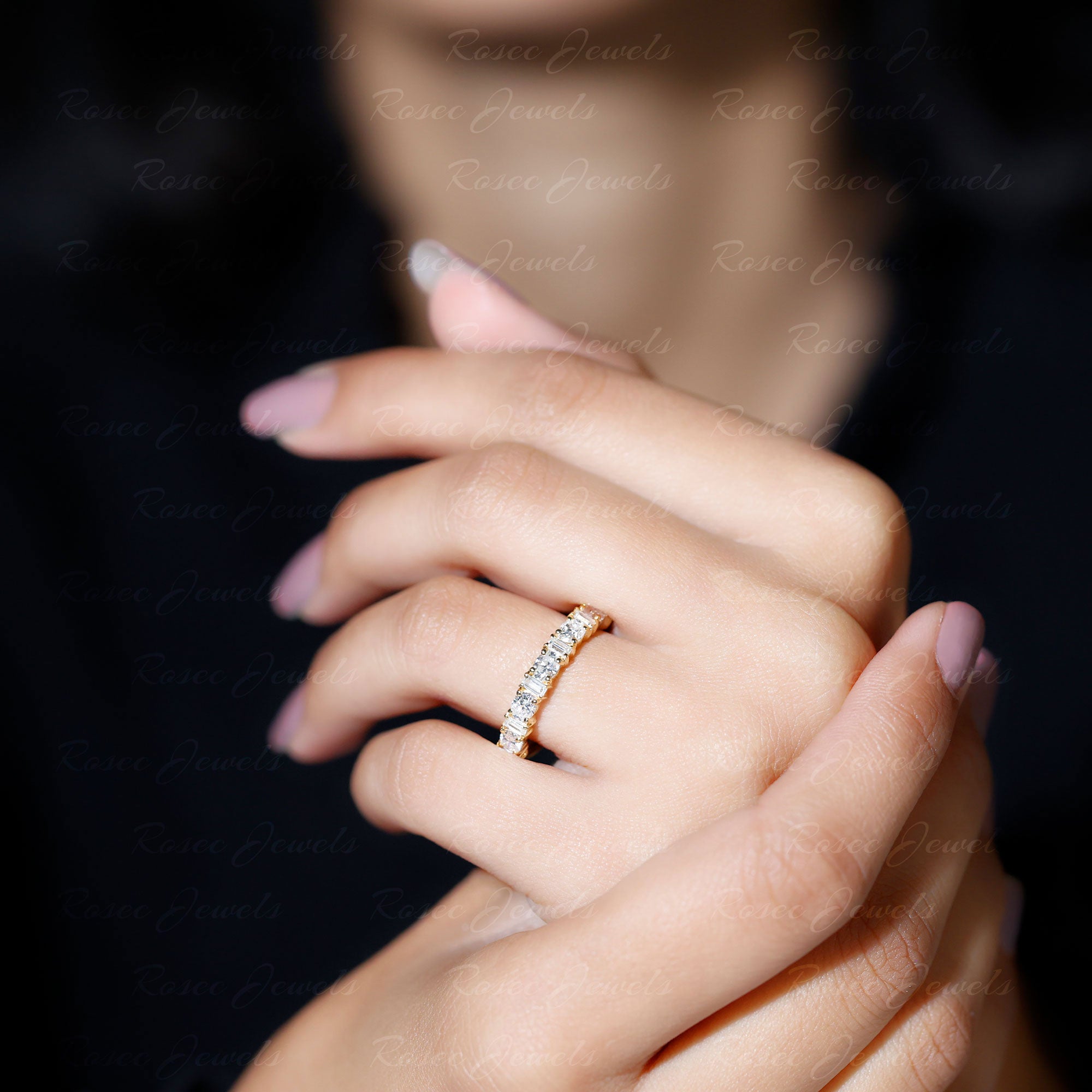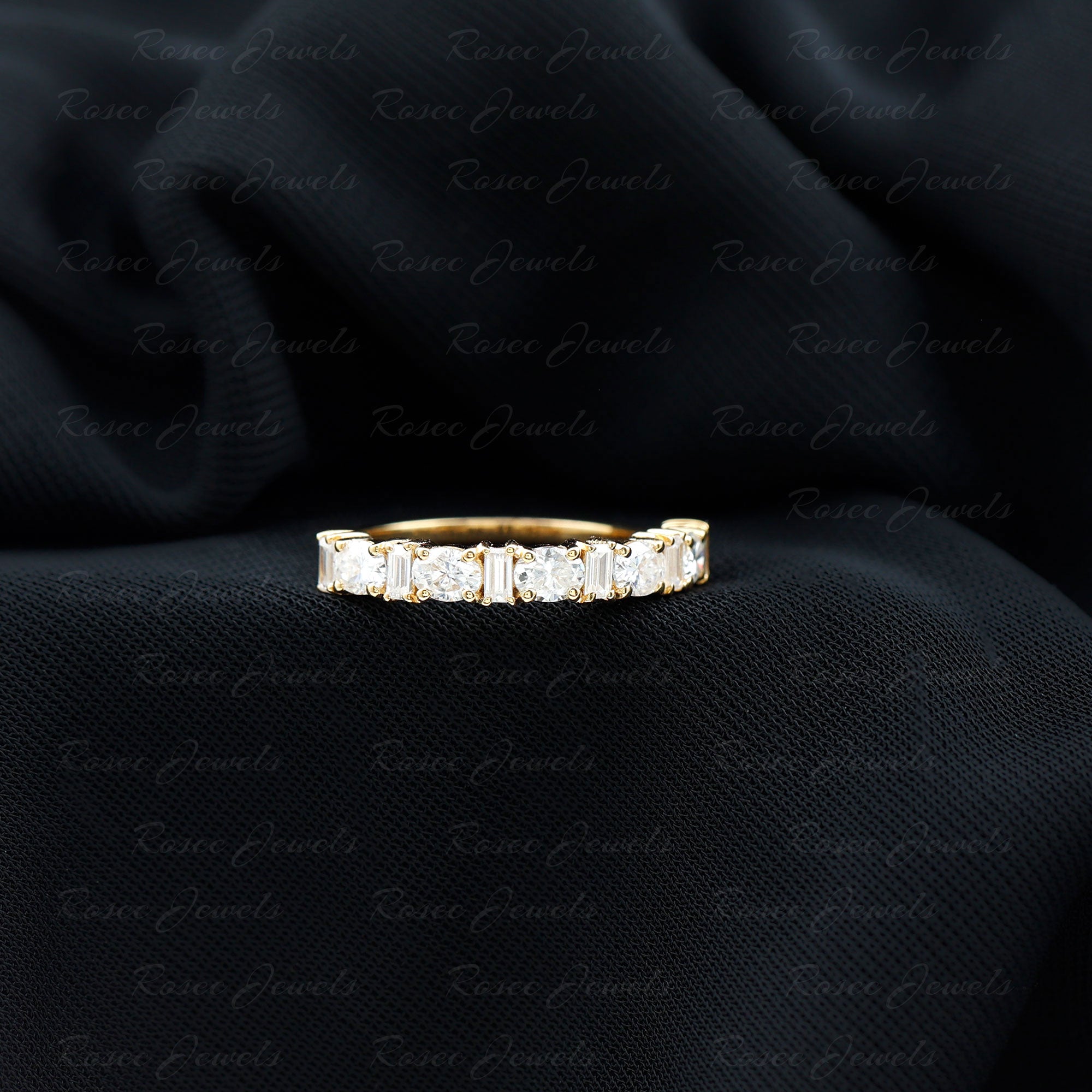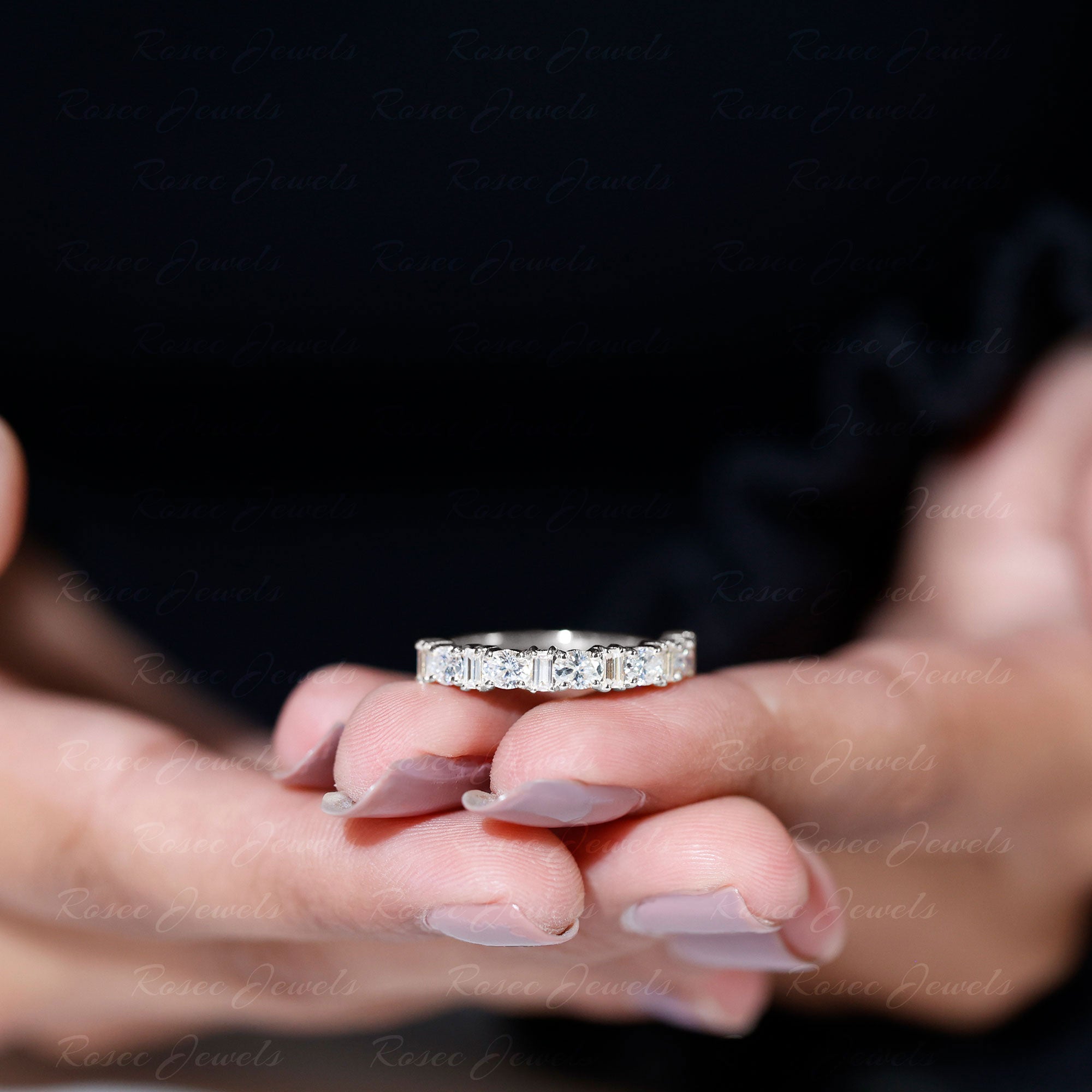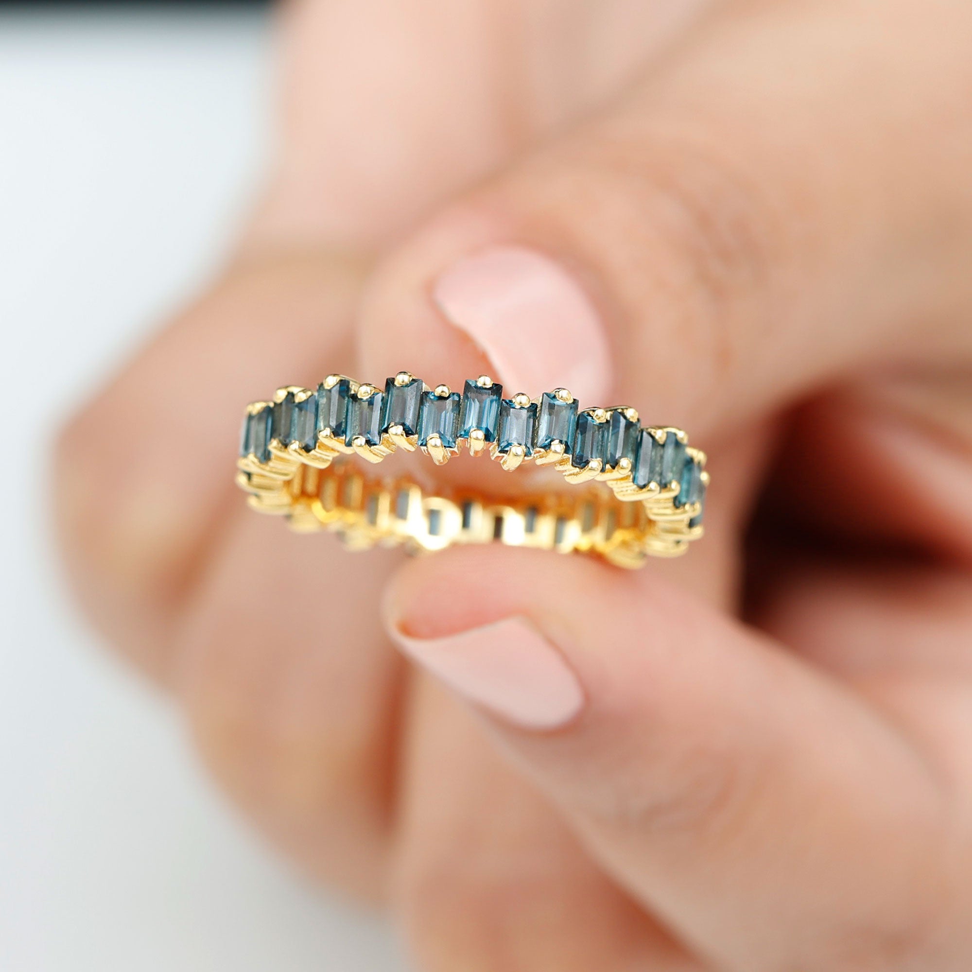 1. Baguette Wedding Rings: Baguette wedding bands are known for their larger gemstone illusion, vintage glam, and distinctive yet understated elegance. Tilted baguette sapphires, straight baguette moissanites, or any other colored or sparkling gemstone wedding bands can add a touch of sparkle to your engagement ring.