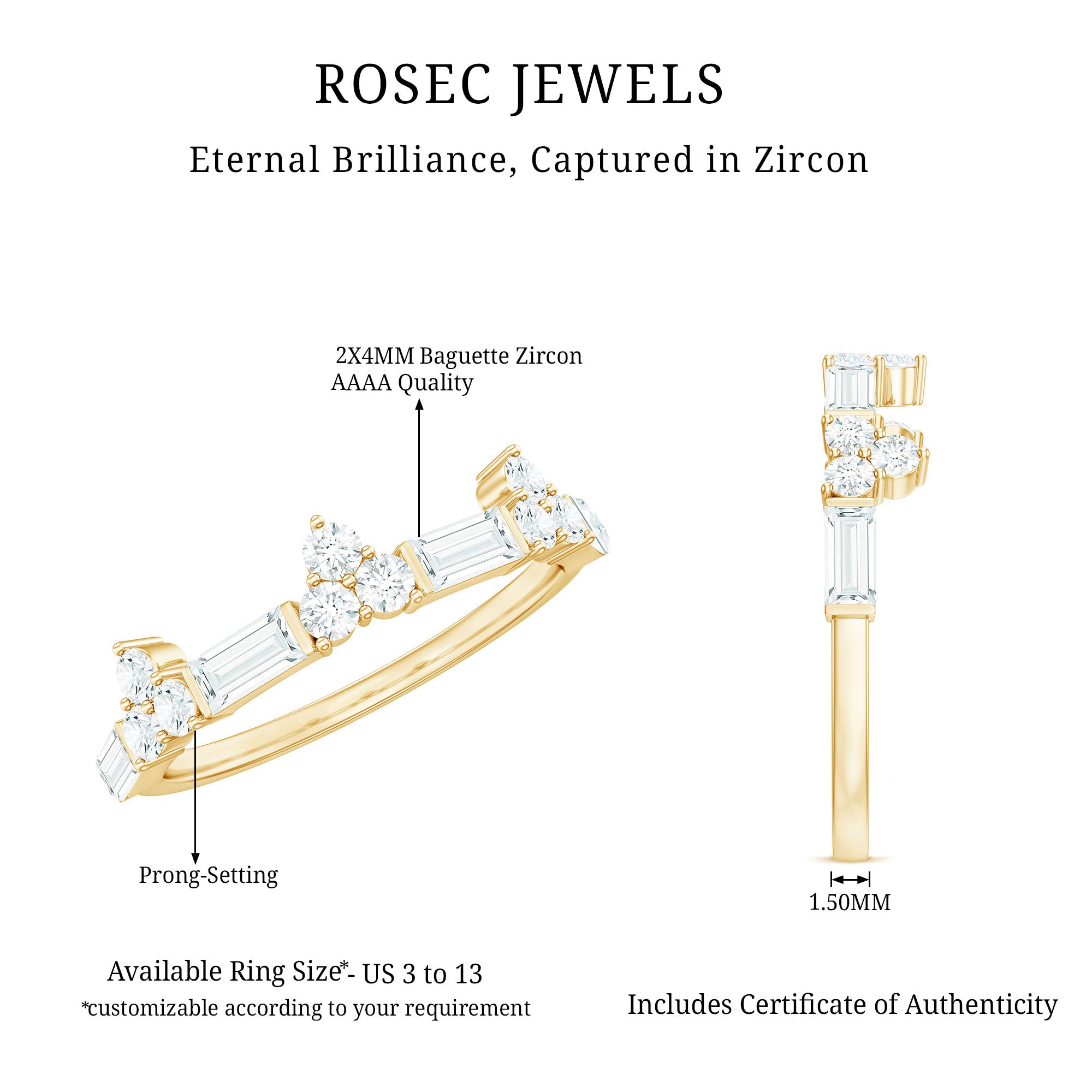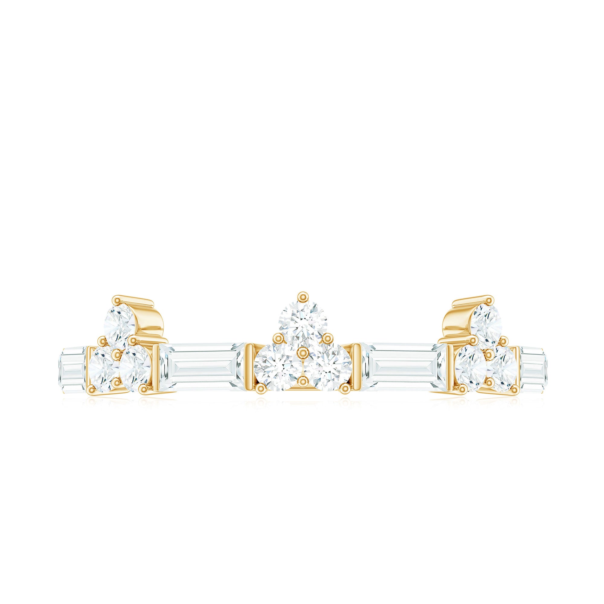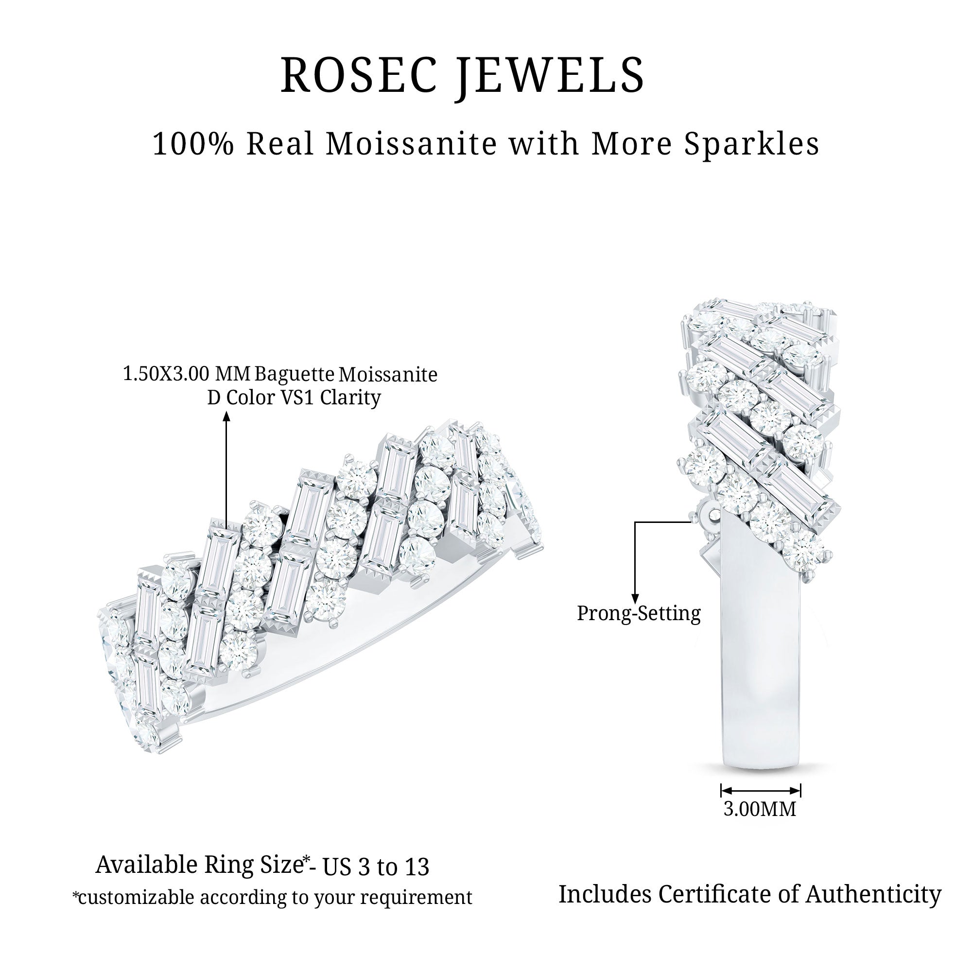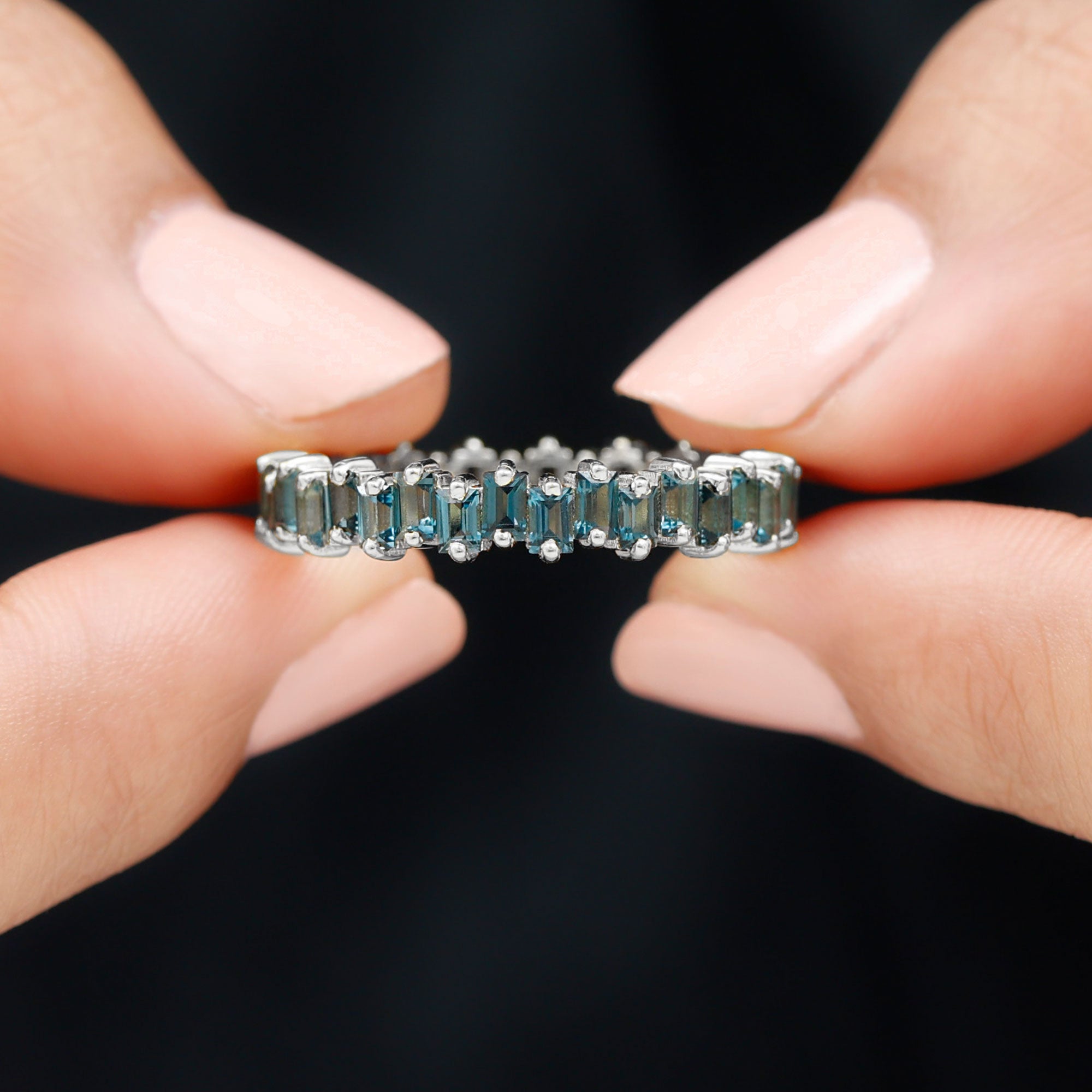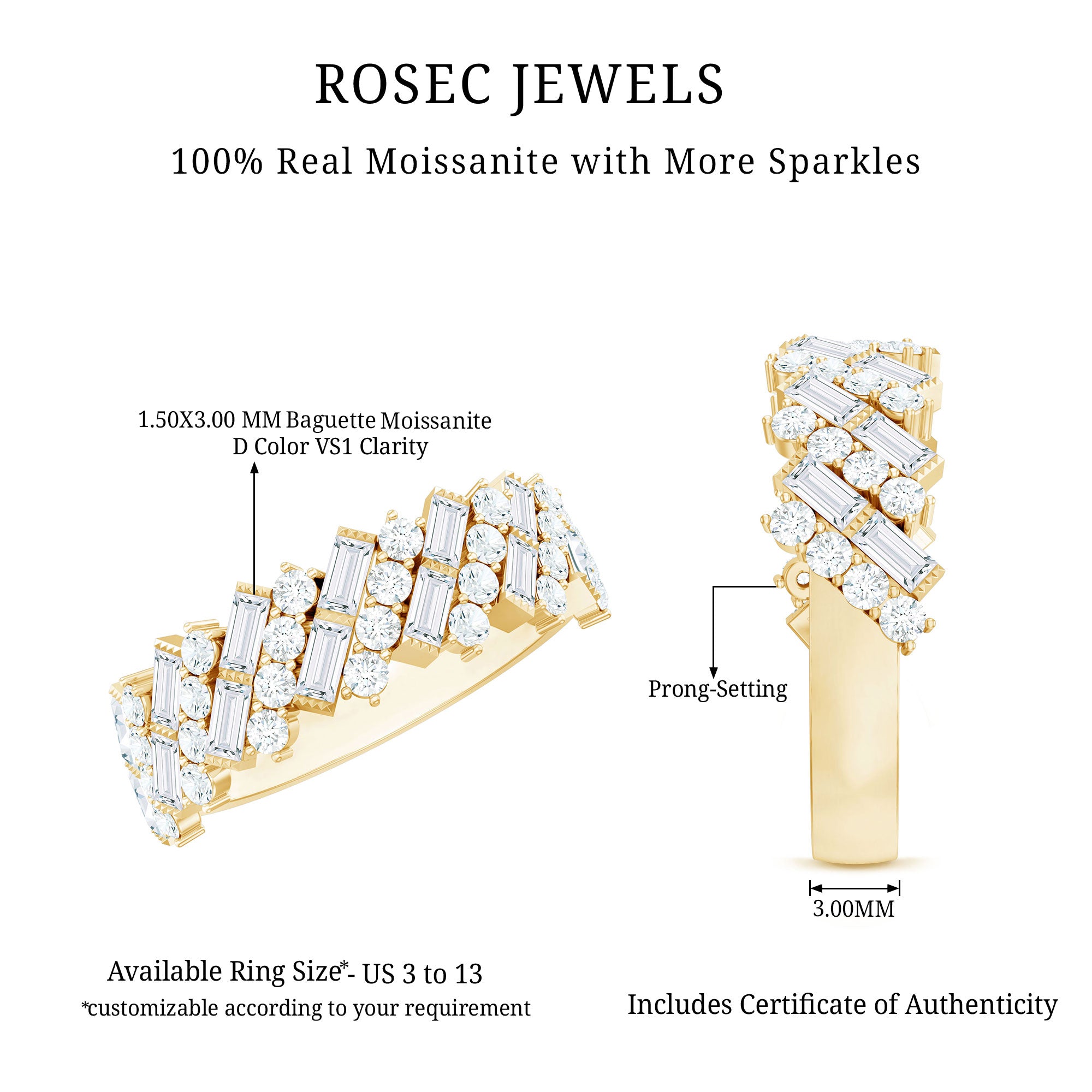 1. Baguette Wedding Rings: Baguette wedding bands are known for their larger gemstone illusion, vintage glam, and distinctive yet understated elegance. Tilted baguette sapphires, straight baguette moissanites, or any other colored or sparkling gemstone wedding bands can add a touch of sparkle to your engagement ring.