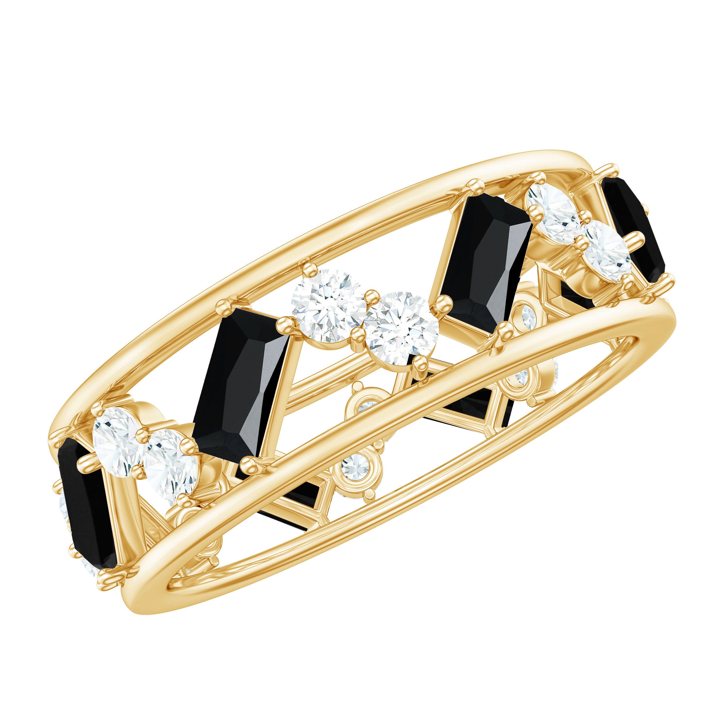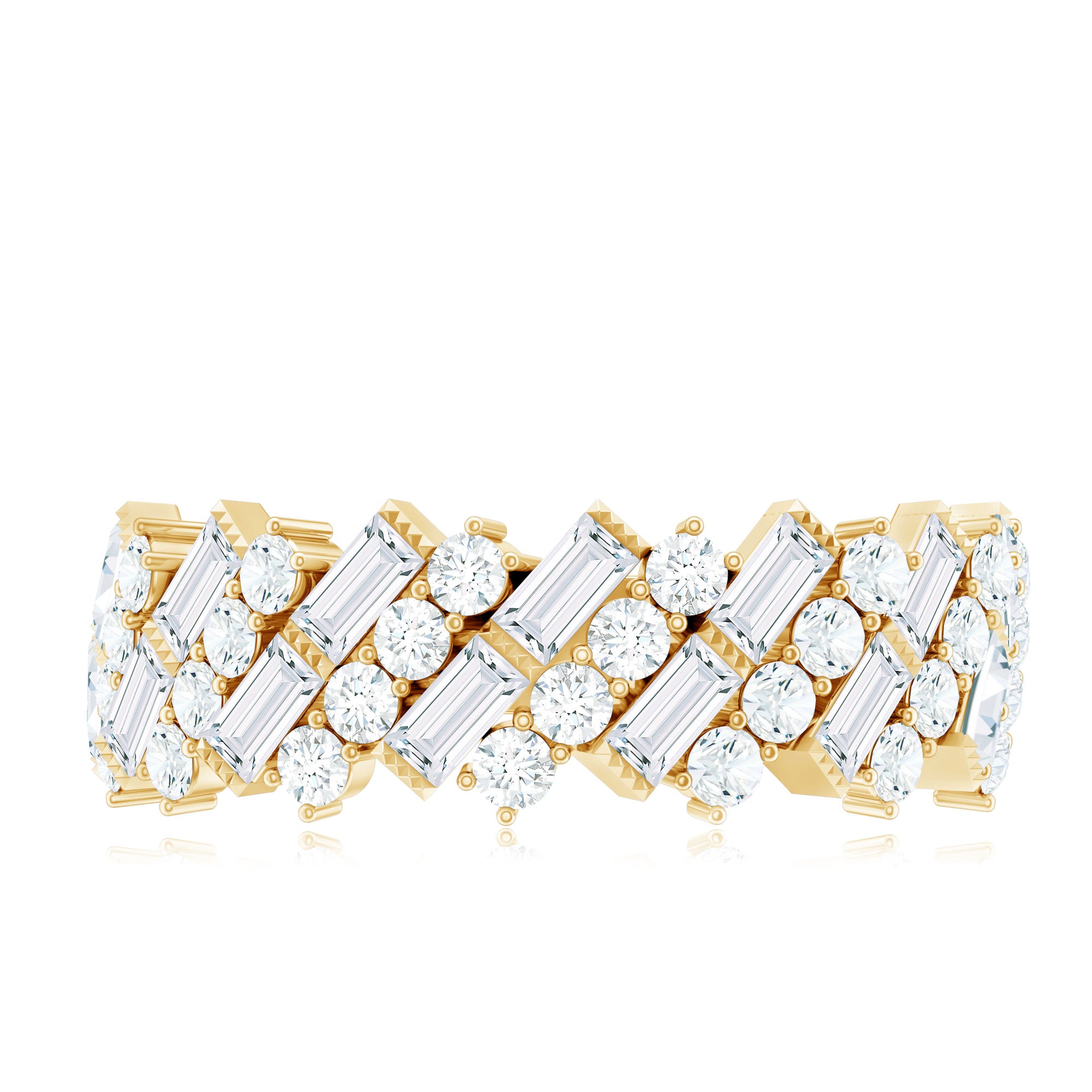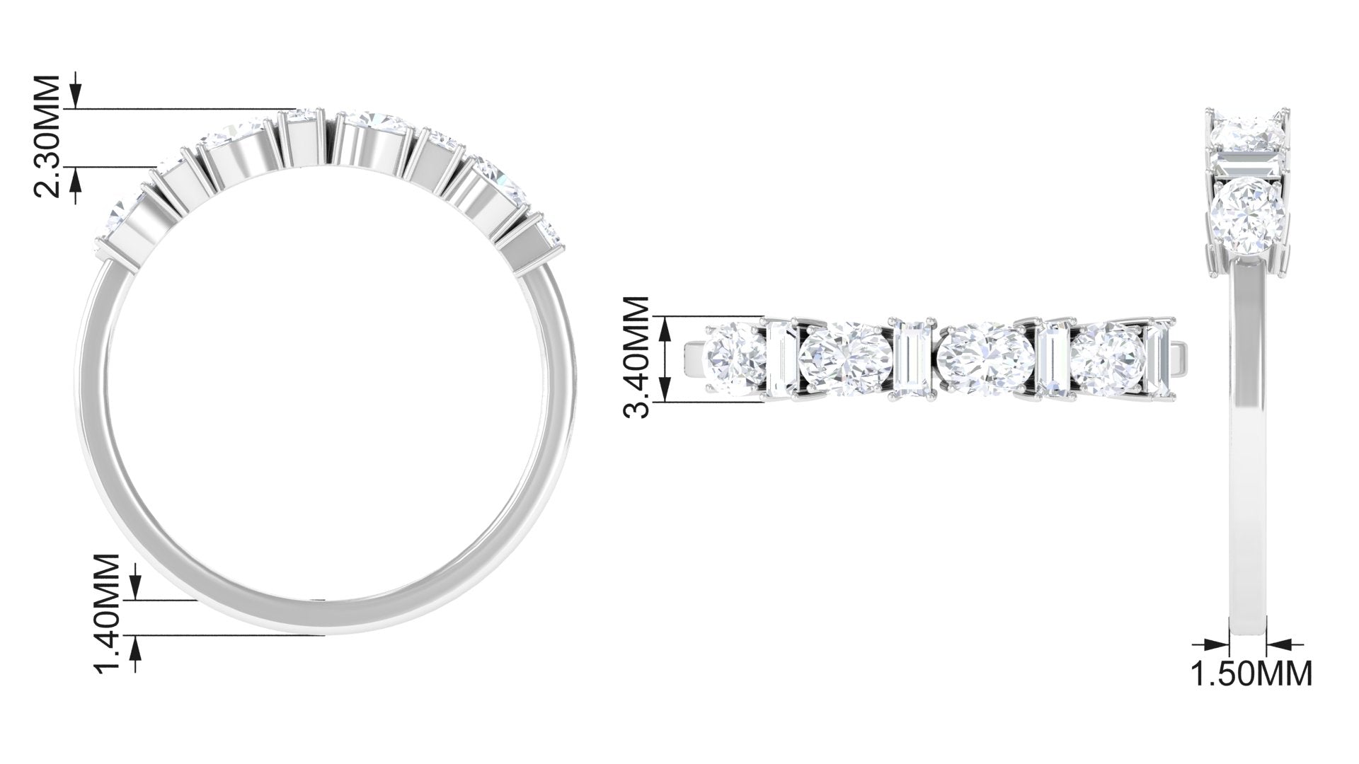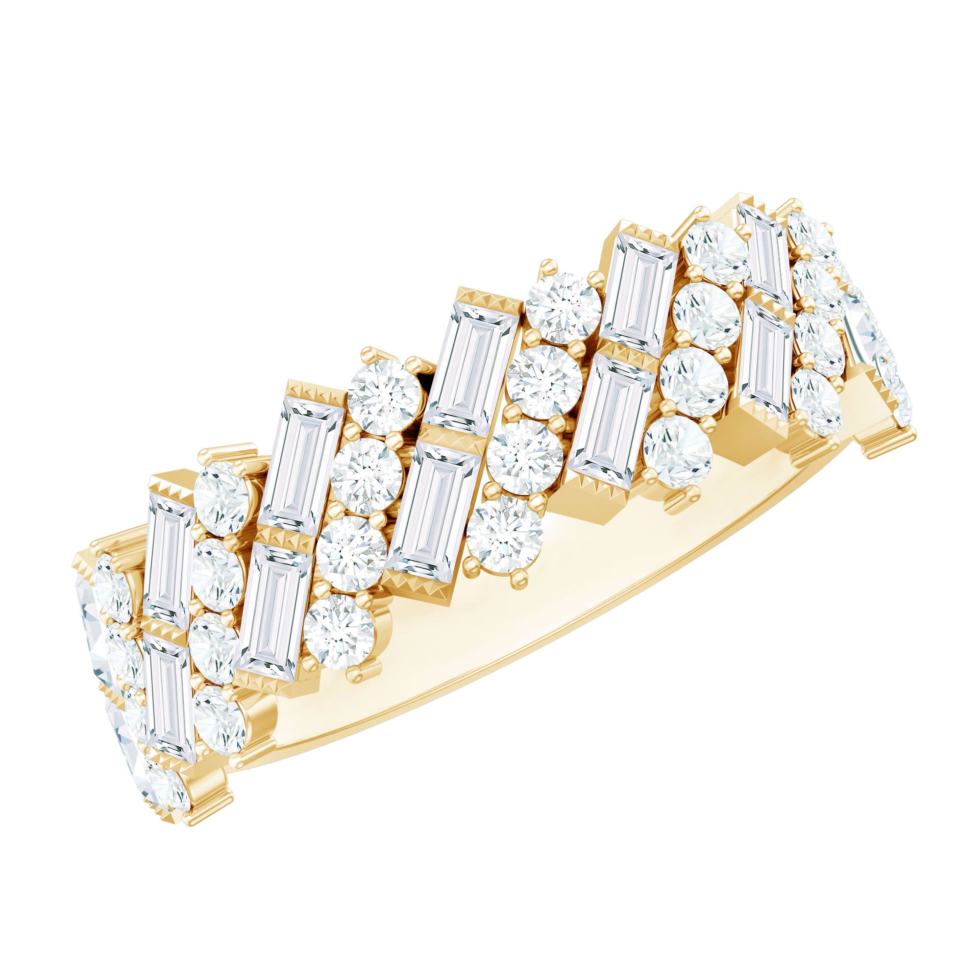 1. Baguette Wedding Rings: Baguette wedding bands are known for their larger gemstone illusion, vintage glam, and distinctive yet understated elegance. Tilted baguette sapphires, straight baguette moissanites, or any other colored or sparkling gemstone wedding bands can add a touch of sparkle to your engagement ring.