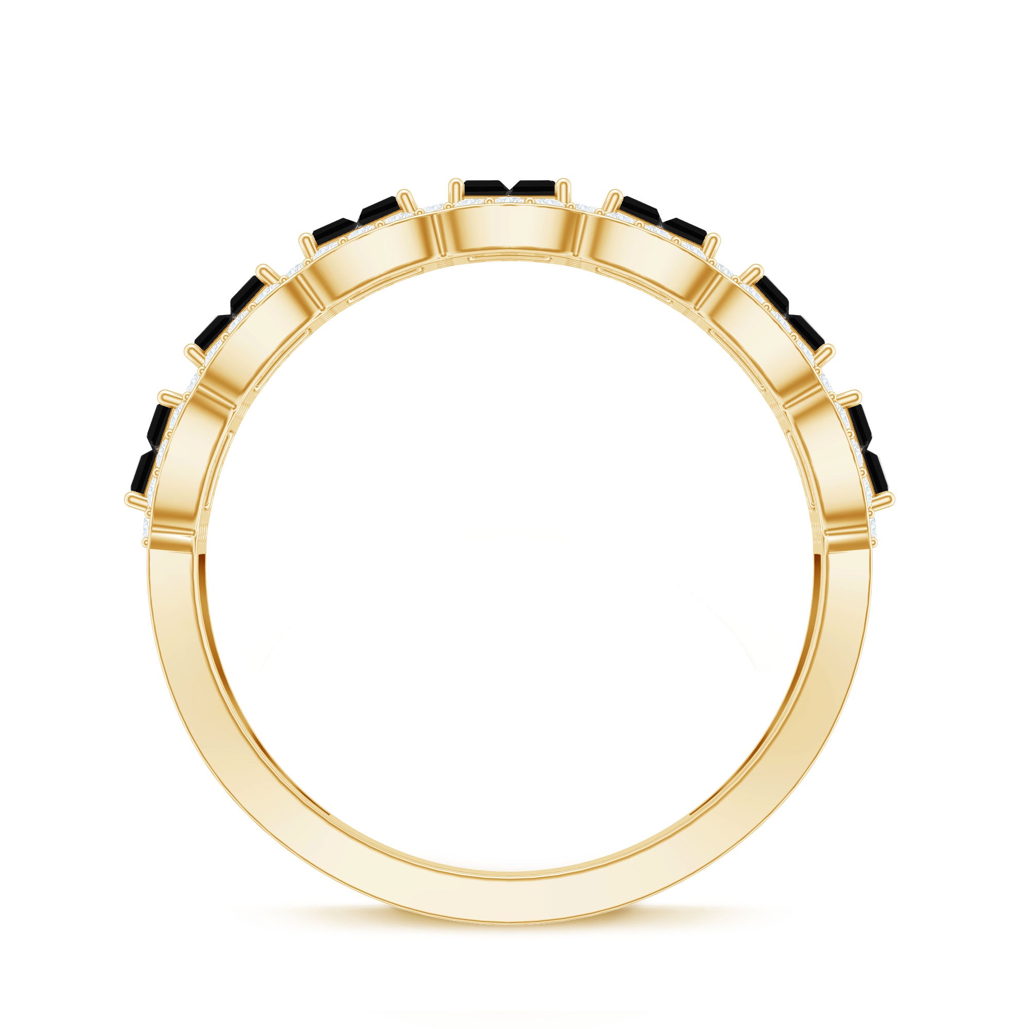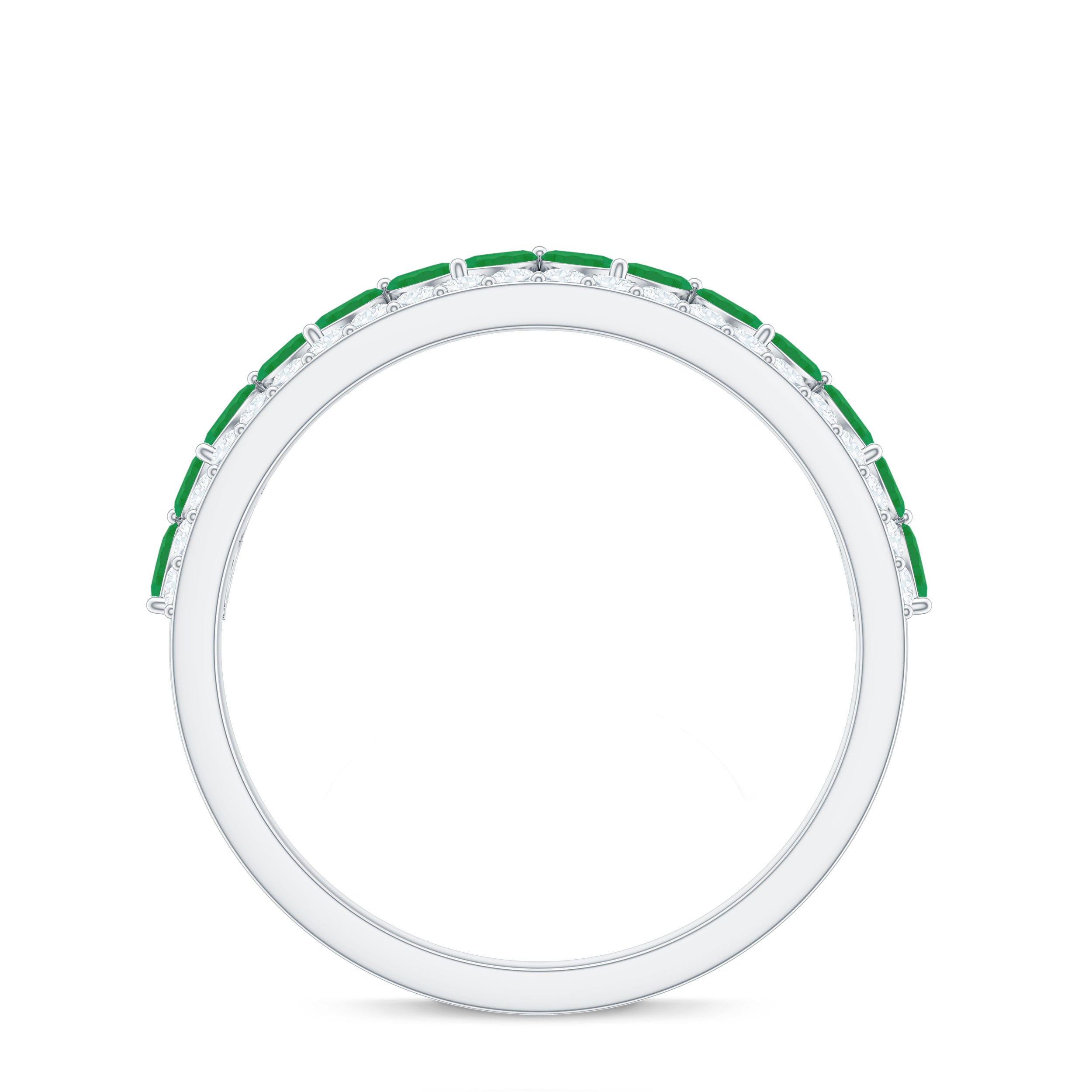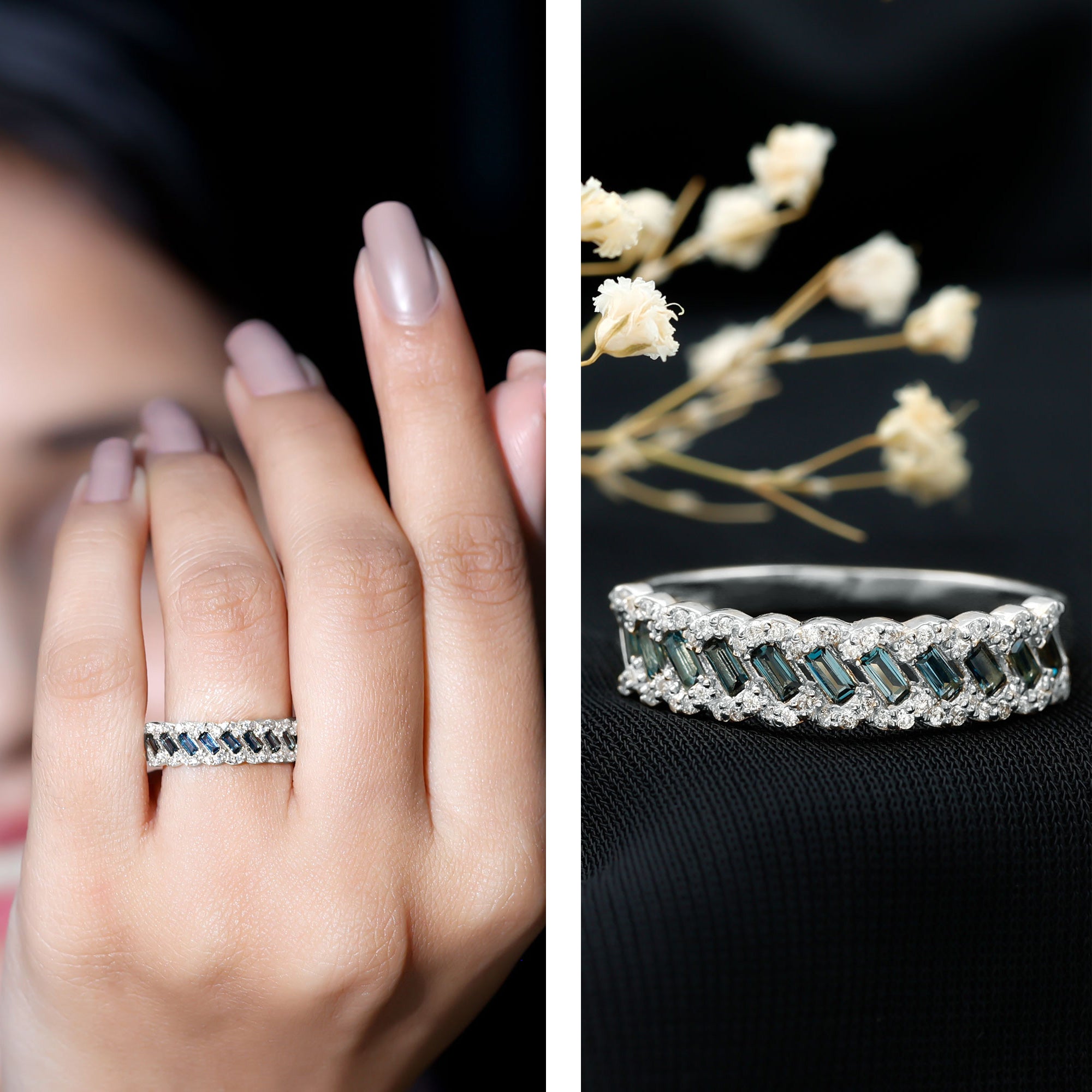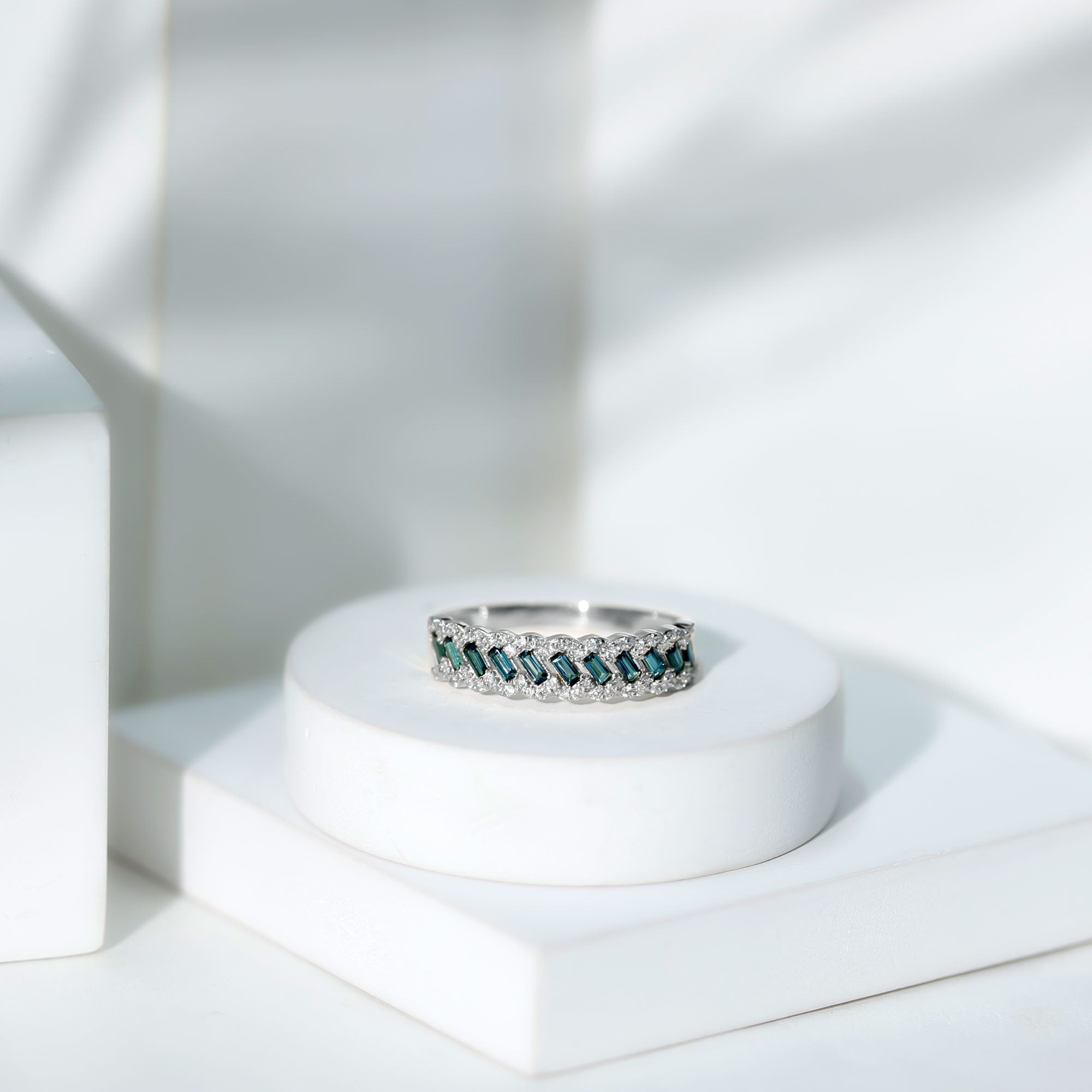 Baguette Wedding Rings: Baguette wedding bands are known for their larger gemstone illusion, vintage glam, and distinctive yet understated elegance. Tilted baguette sapphires, straight baguette moissanites, or any other colored or sparkling gemstone wedding bands can add a touch of sparkle to your engagement ring.