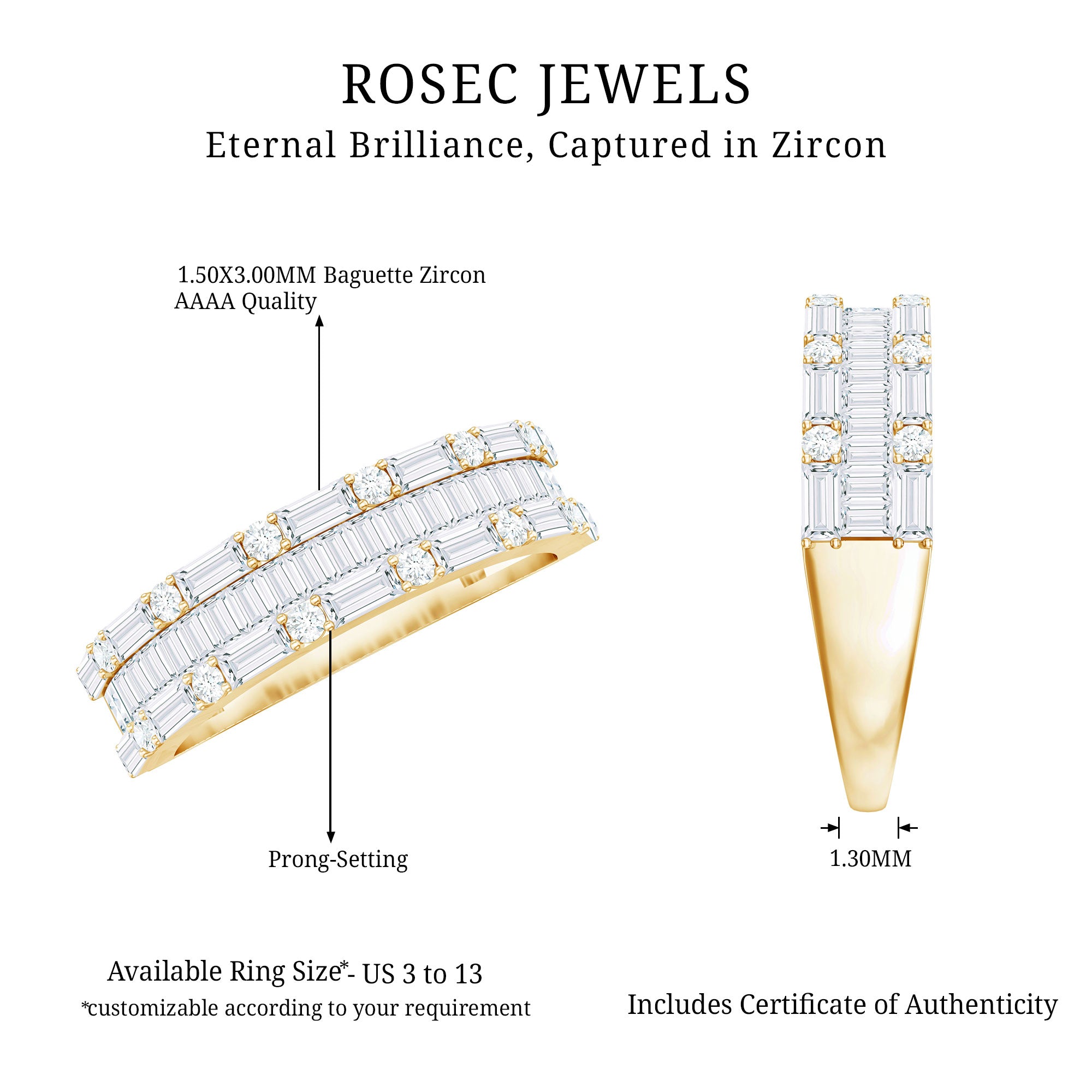 We at Rosec Jewels are the jewelers behind an assorted collection of eternity rings to mark the wedding ceremony. The available hues of gold namely, yellow gold, white gold and rose have motivated us to bring versatility in the process of crafting jewelry while creating a diversity in the range of gold eternity bands. We are in debt to our gemologists and lapidarist responsible for assuring the gemstone quality.
