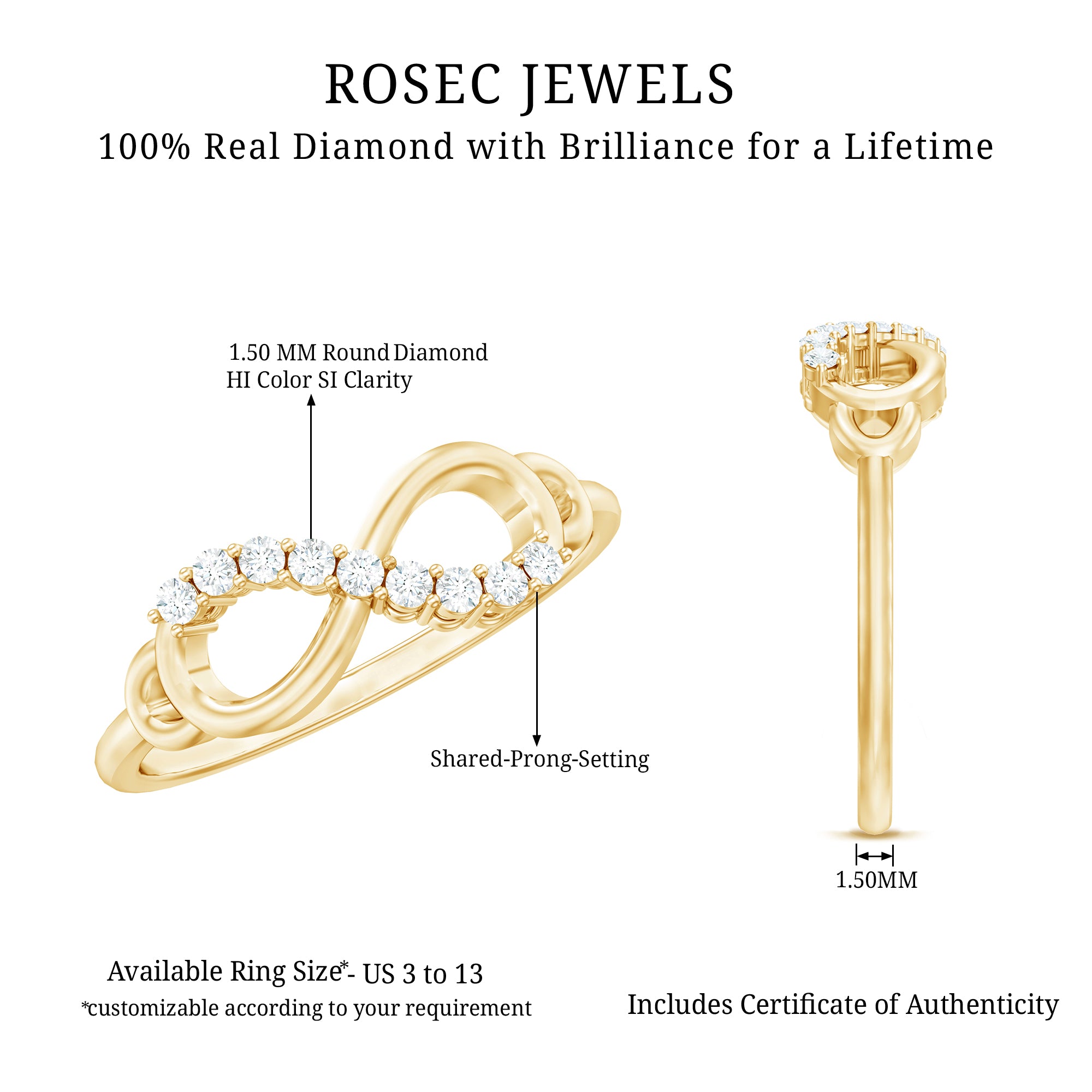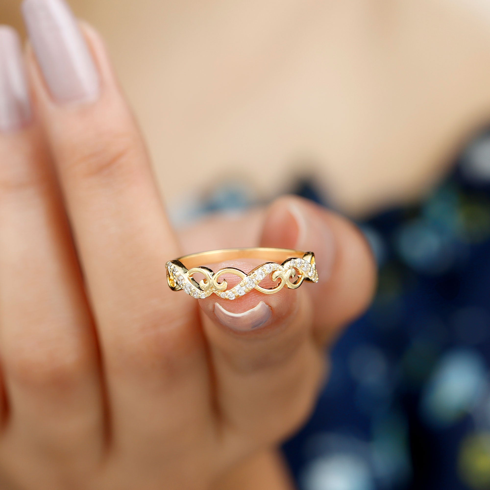 Rosec Jewels’ fantastic range of infinity rings for women are an unique combination of trending designs with a diverse range of precious and semi-precious gemstones to curate a mesmerizing collection of infinity rings. Further, blending different gemstone shapes with colorful hues of gold namely yellow gold, white gold and rose gold to bring further diversification in the overall infinity wedding ring styles.