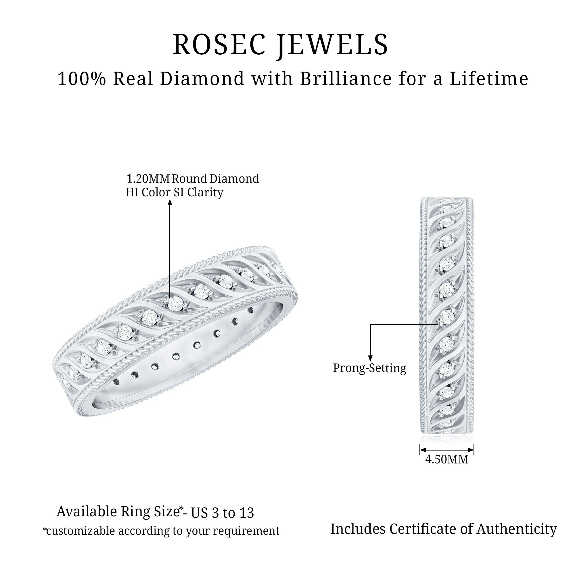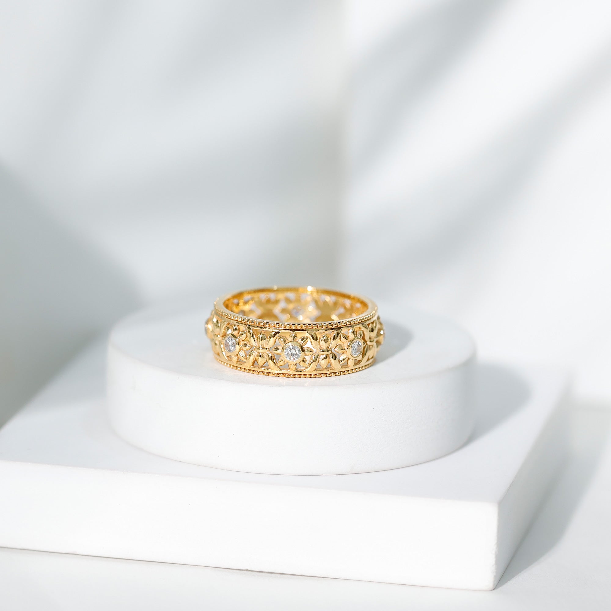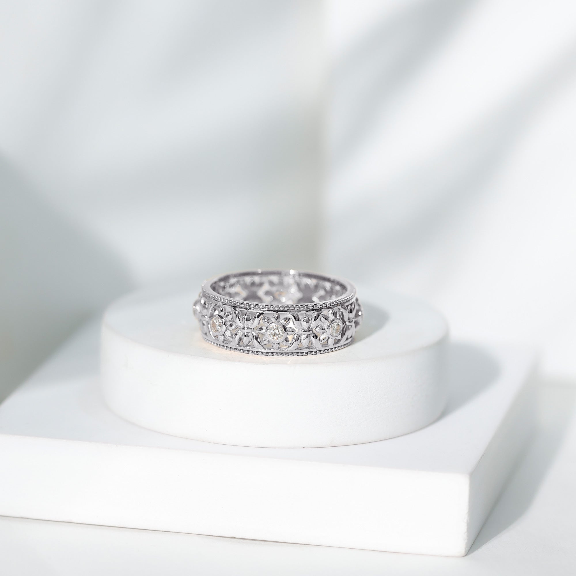 The craftsmen at Rosec Jewels are behind designing wedding ring styles that appeal to the women from all walks of life. With a keen attention to details and keeping a check on all the quality factors famously termed as the 4C’s Diamonds. The exceptional hardness offers our cutters to conveniently cut it into shapes to curate alluring diamond eternity bands, marquise diamond wedding band and baguette diamond eternity ring. In order to explore more elegant options, you can also select white gold diamond wedding bands and rose gold diamond bands.