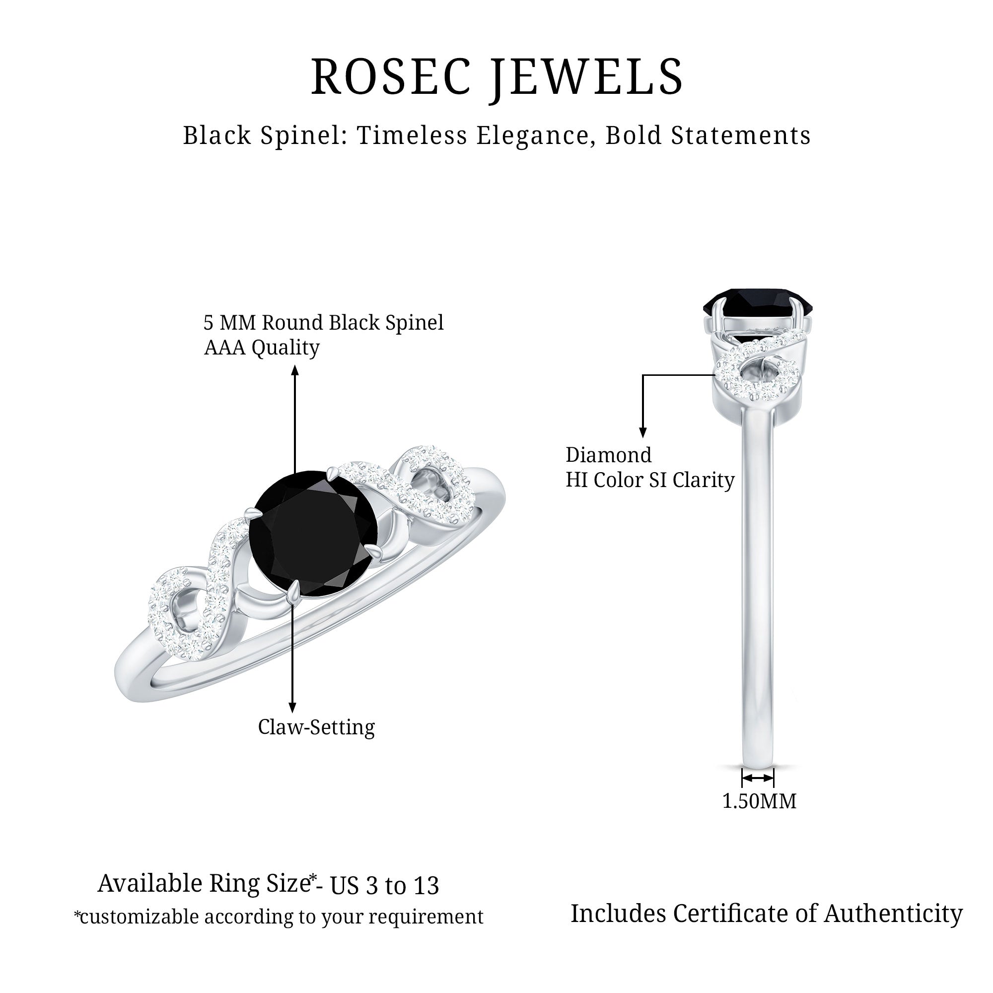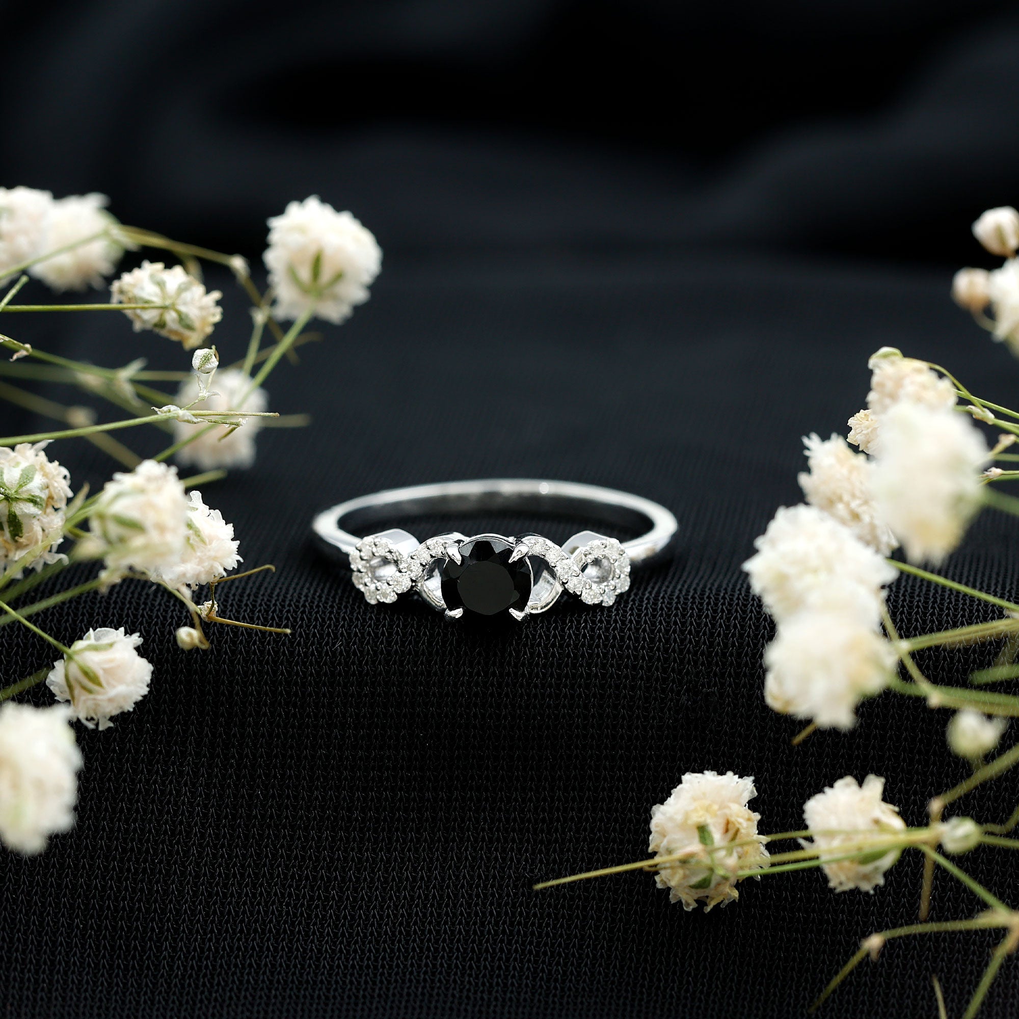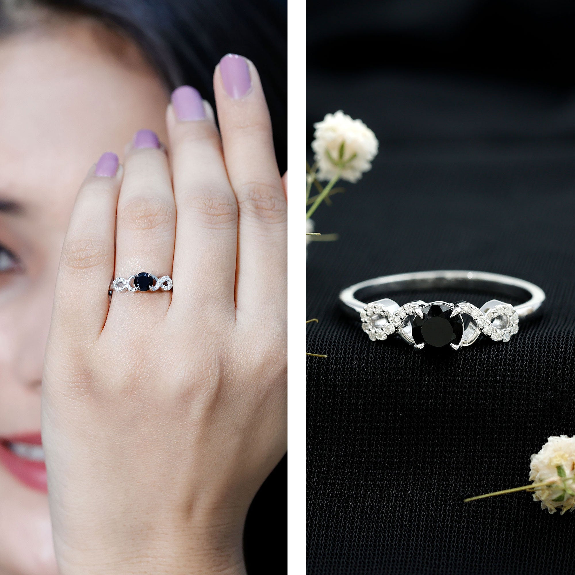 Une bague de promesse en spinelle noire peut insinuer une signification spécifique, mais elle ne se limite pas à un style spécifique. Il peut s'agir d'une bague solitaire simple qui dégage une esthétique discrète avec une taille de 4 MM ou même moins. Ou pour un attrait visuel exquis, soyez richement détaillé avec des motifs inspirés de la nature, des motifs de fleurs et d'infini, ou des accents étincelants de diamant/moissanite. Derrière cela, cela reflète la promesse d’un engagement éternel (qui précède généralement un engagement).