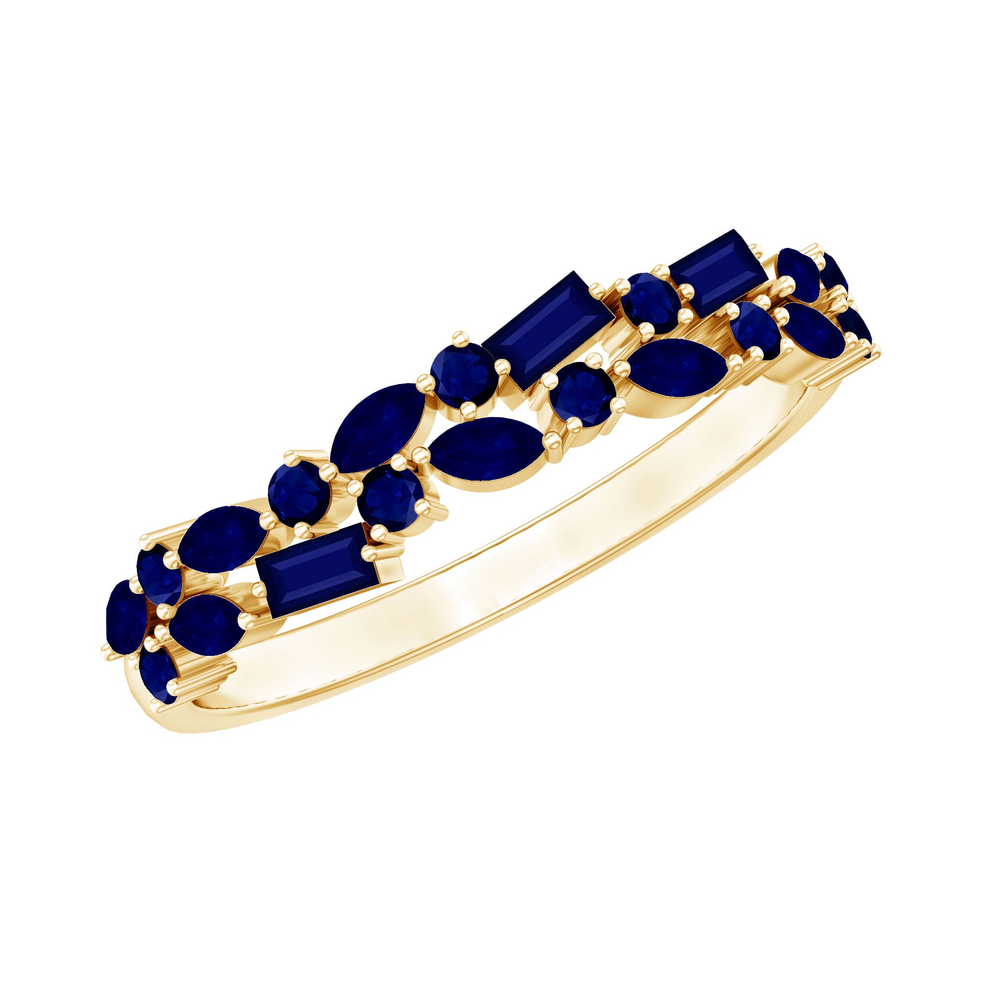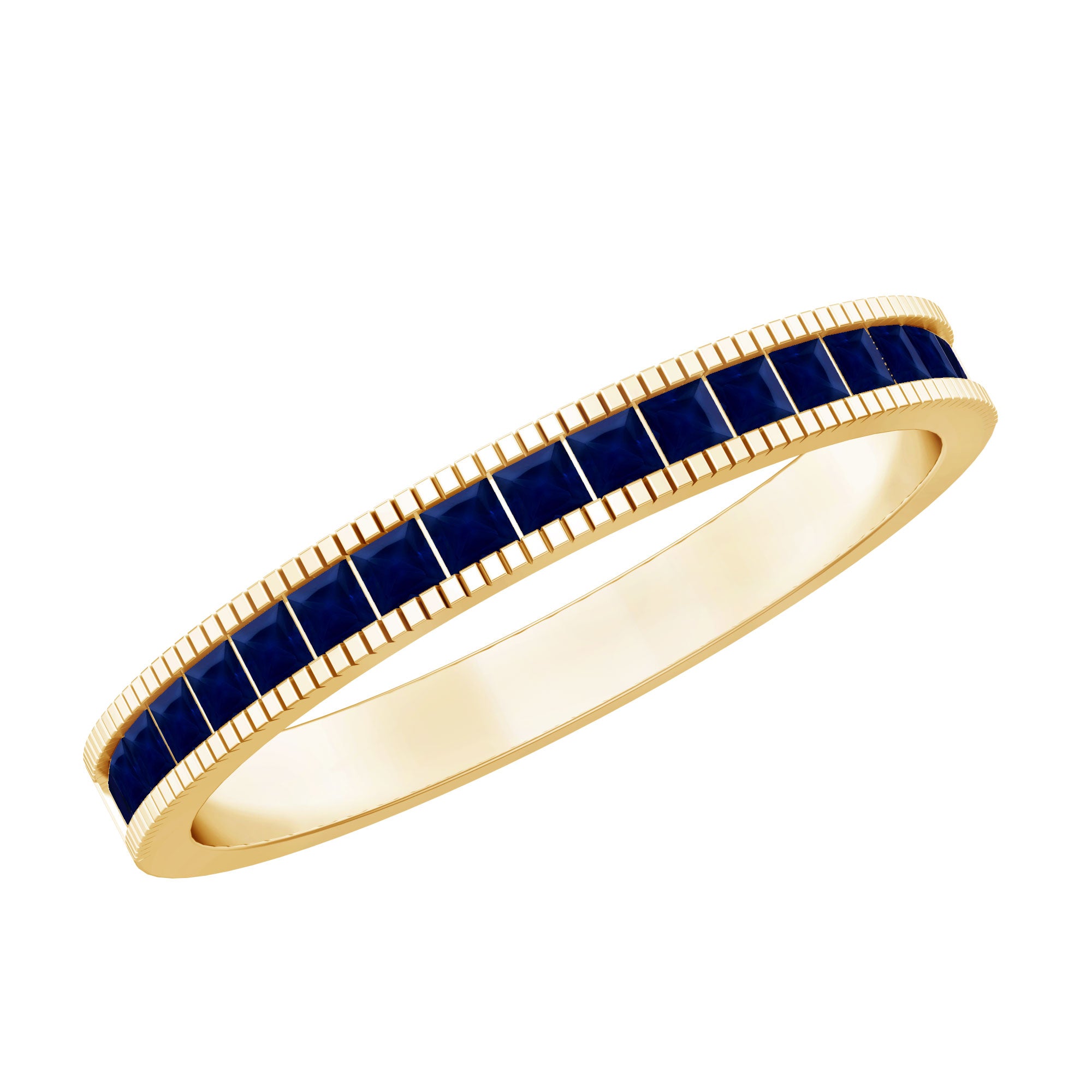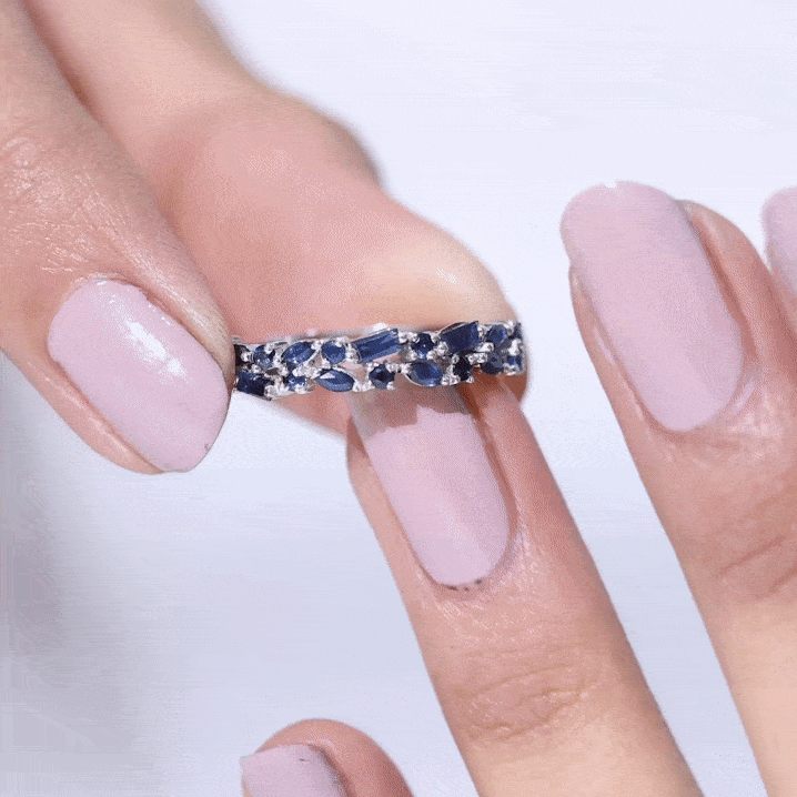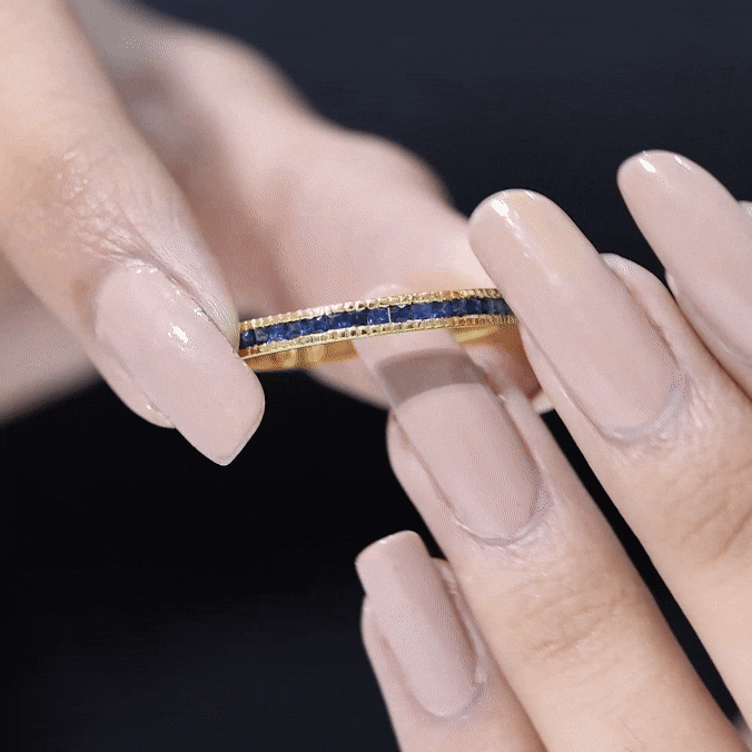 Considérée comme l'un des témoignages d'amour les plus romantiques, une bague d'éternité en saphir bleu est incrustée de saphirs bleus de taille uniforme dans un cercle ininterrompu (sur tout l'anneau). Il dégage une ambiance intemporelle, complétée par la touche bleue vibrante d'une rangée de saphirs. La meilleure partie? Vous pouvez l'empiler avec vos cierges magiques préférés avec peu ou pas d'effort. De plus, cette bague en saphir bleu commémore le genre d'amour qui ne connaît aucune mesure.