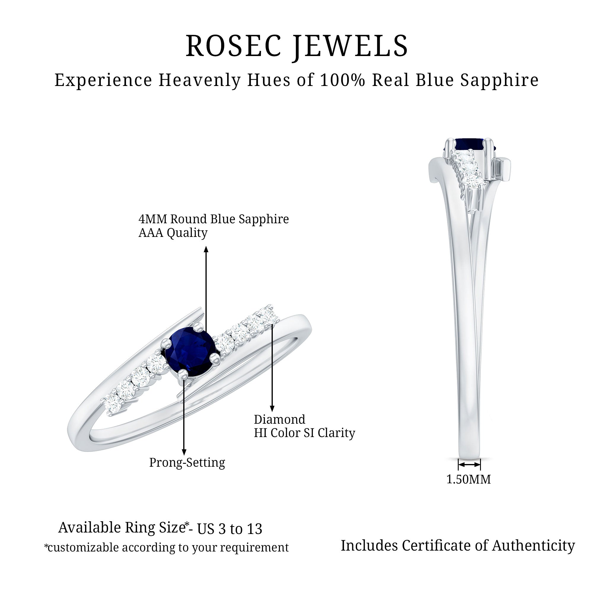 Classique, extravagante et tout le reste, une bague de promesse en saphir bleu n'est pas définie par un style spécifique. Vous serez témoin des bagues solitaires les plus sobres de cette catégorie, qui comportent un saphir bleu dont la taille ne dépasse pas 4 mm. Mais vous pouvez également vous attendre à craquer pour ceux qui ont été richement détaillés avec des motifs d'inspiration naturelle et florale, des accents de diamant ou des pierres jumelles/triples de saphirs. Cependant, rien n'est comparable à l'attrait romantique d'une bague cœur en saphir bleu dans cette catégorie. Symboliquement, il est échangé entre les couples comme un geste d'engagement à vie (qui précède souvent les fiançailles).