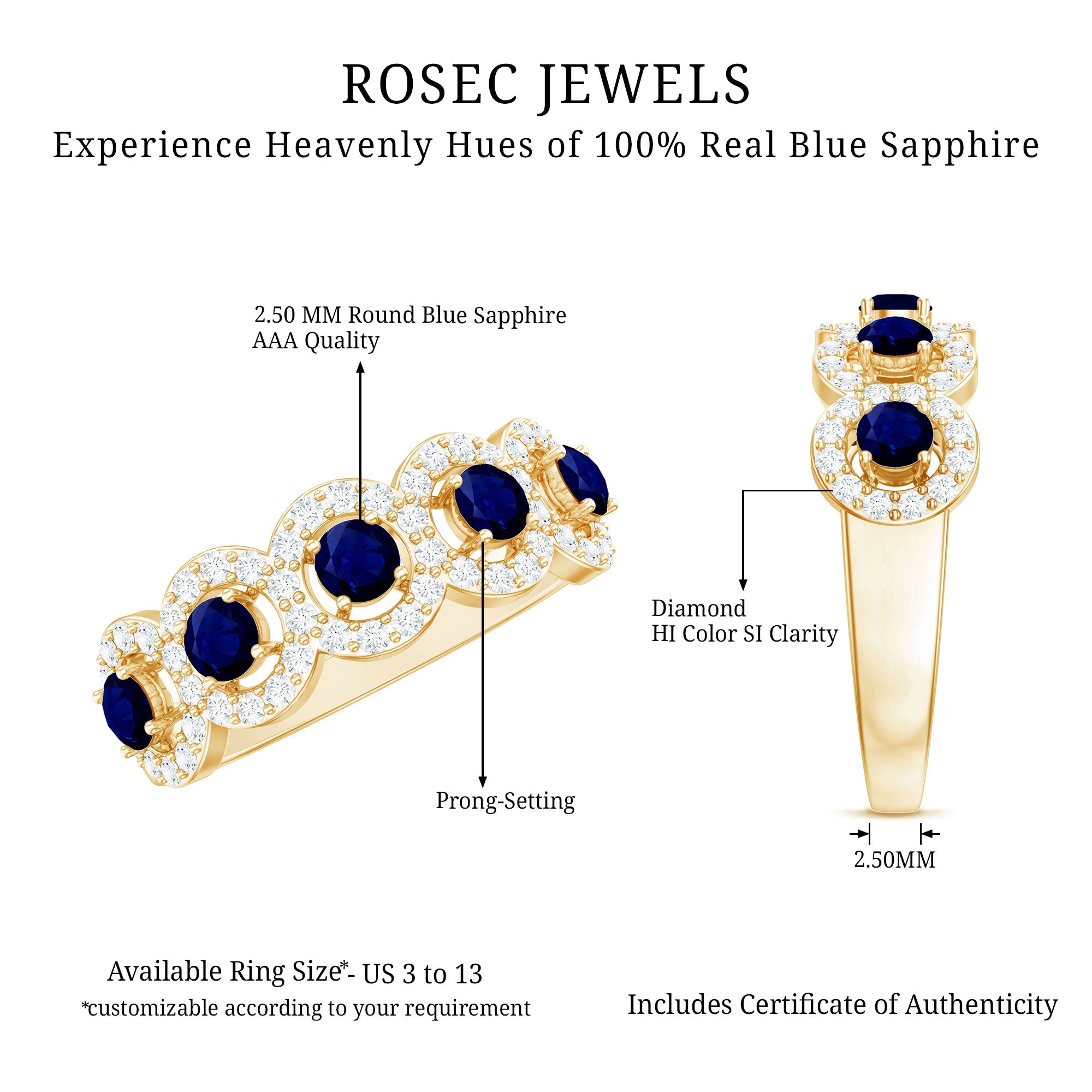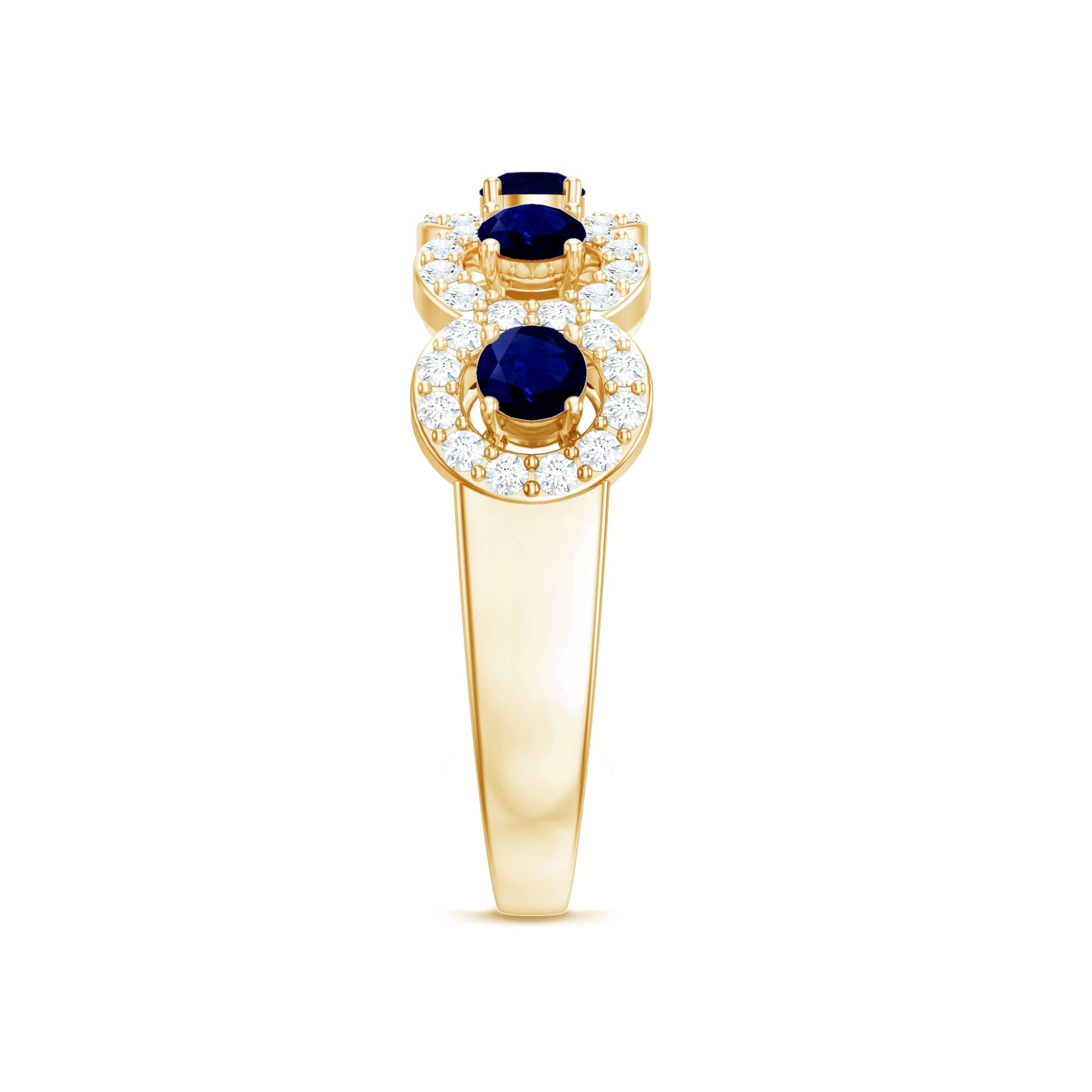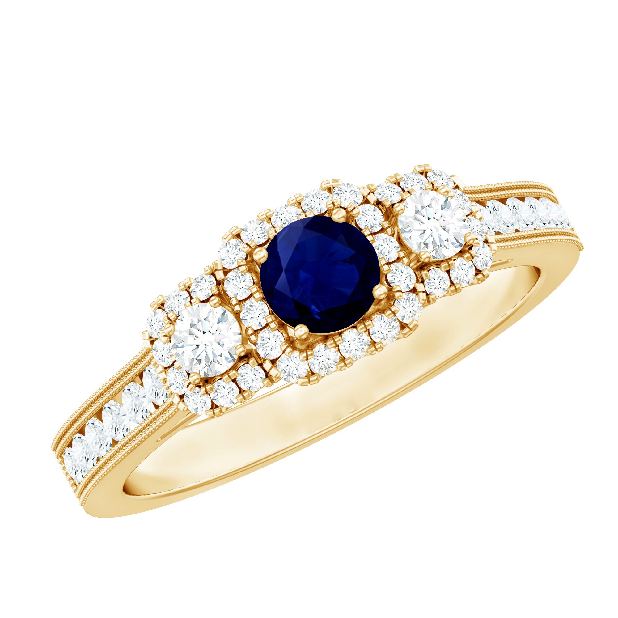 Une version moderne du style solitaire conventionnel, une bague halo de saphir bleu enferme la pierre centrale de saphir bleu avec un défilé scintillant de diamant/moissanite autour. Le Halo met davantage en lumière la beauté du Sapphire en le faisant paraître légèrement plus grand. La bague la plus emblématique de cette catégorie est la bague préférée des royalties : la bague en saphir bleu avec halo de diamants inspirée de la princesse Diana.