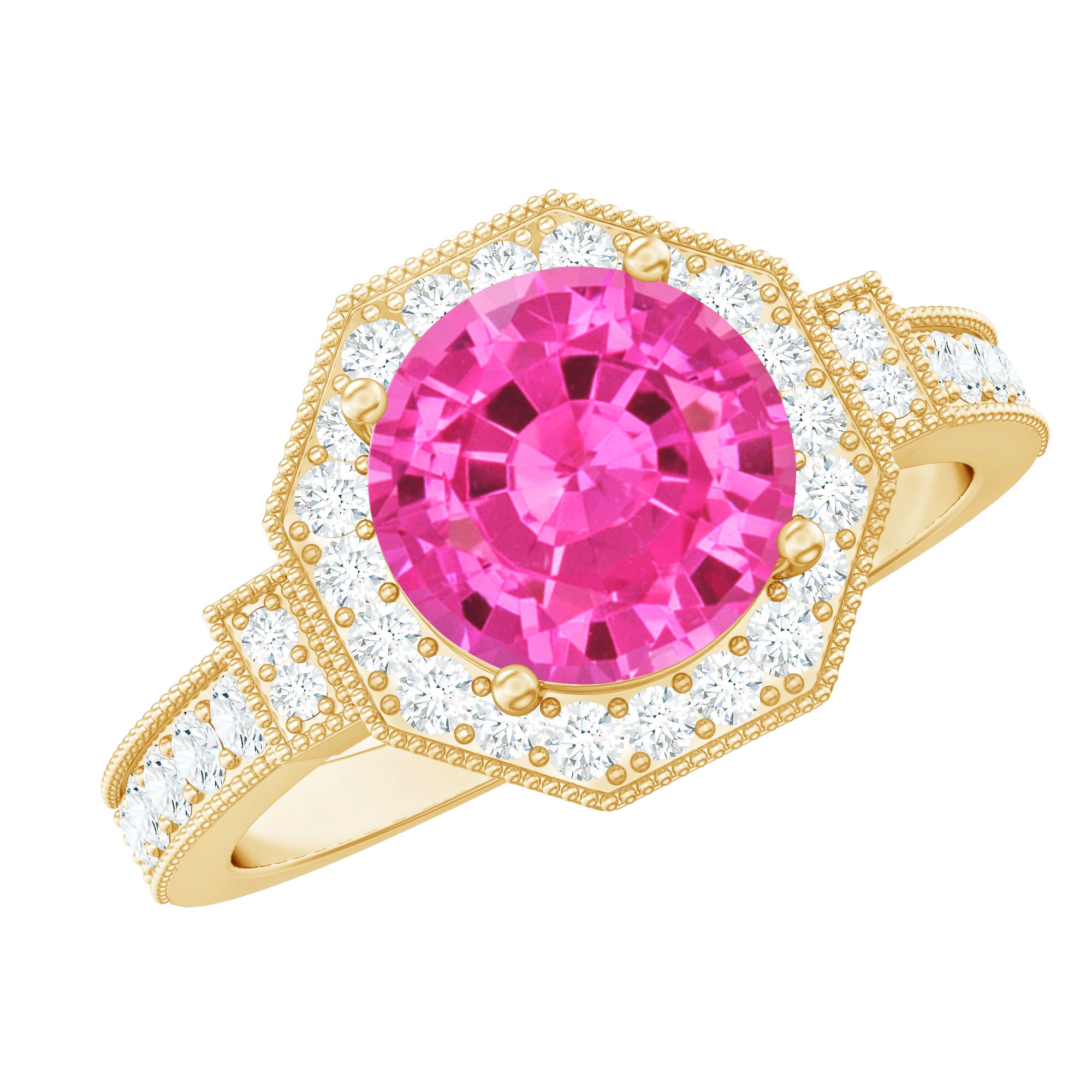If you love classic ring pieces with a stylish touch then you must check our vintage inspired lab created pink sapphire rings in solitaire and halo styles. Different gemstone shapes and metal settings give each piece a unique story to tell.