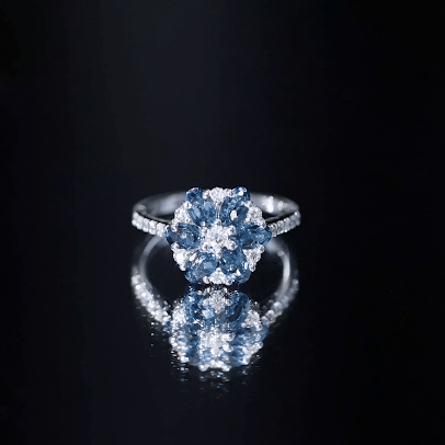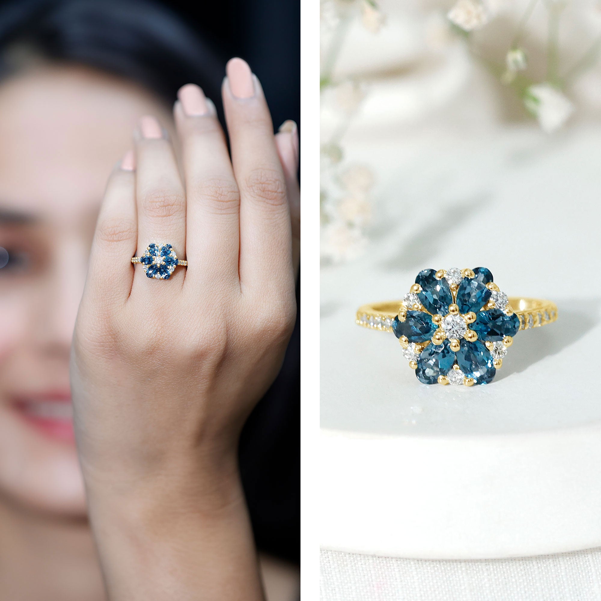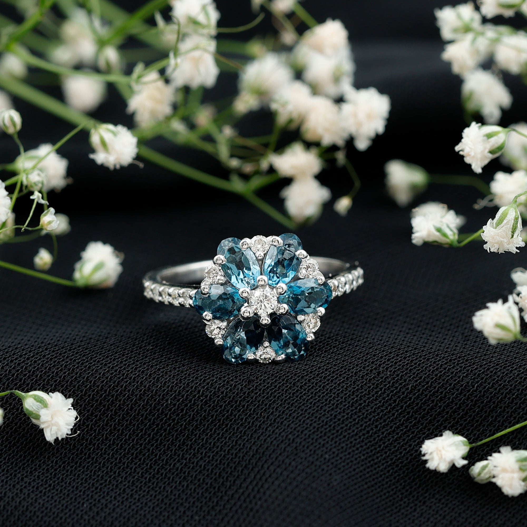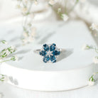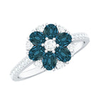 Bague de fiançailles avec topaze bleue naturelle de Londres et fleur de diamant
