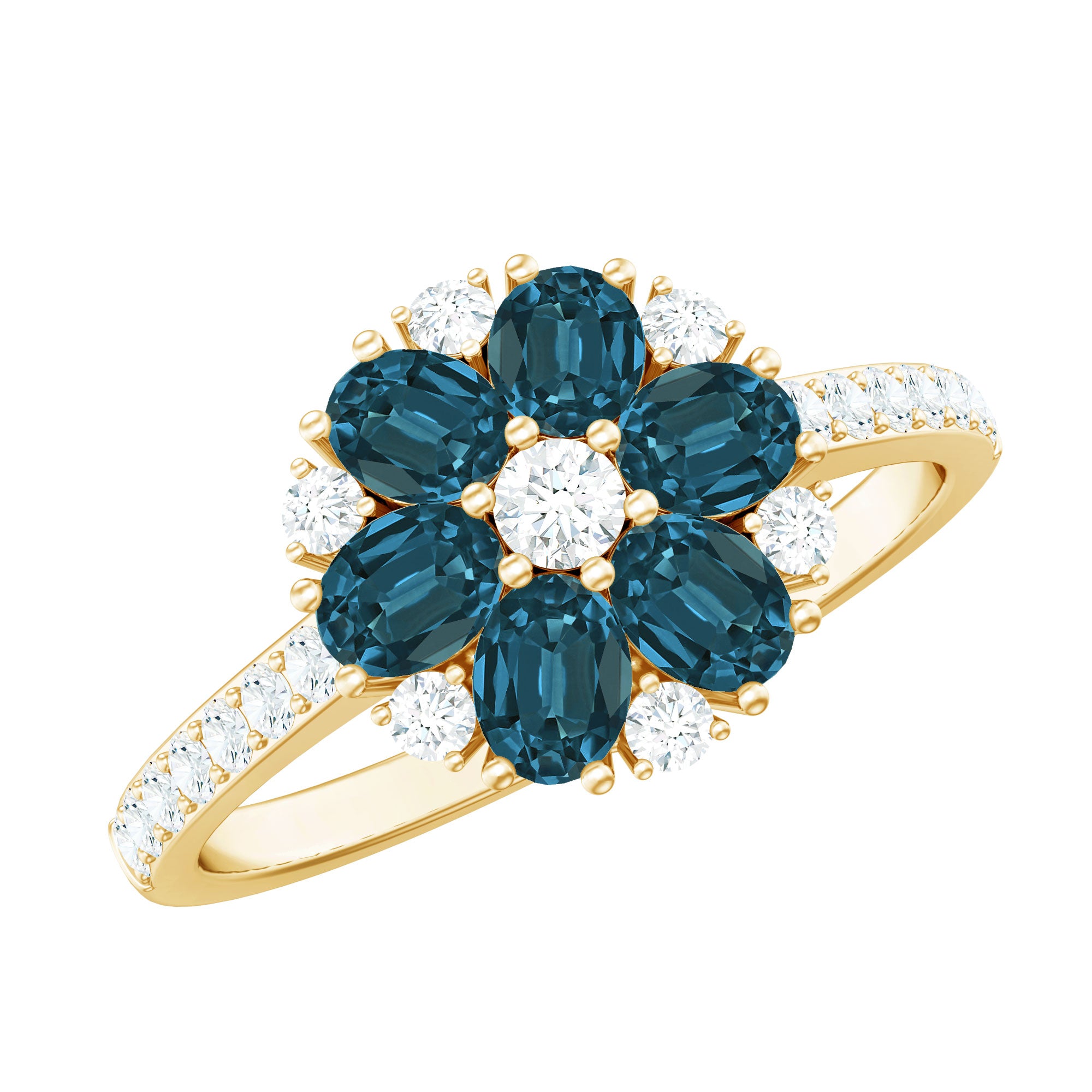 Notre bague de fiançailles avec fleur de topaze bleue de Londres est destinée à commémorer le genre d'amour qui ne cesse de fleurir. Imitant les pétales de la fleur, une série de topazes bleues de Londres de forme ovale reposent sur un sertissage à griffes. Ils sont étincelants de diamants de forme ronde au centre, autour et sur les côtés pour un beau contraste de couleurs. Toutes les pierres précieuses de cette bague de fiançailles cocktail ont été légitimement certifiées pour leur qualité supérieure, ce qui en fait un trésor intemporel dans sa boîte à bijoux.
