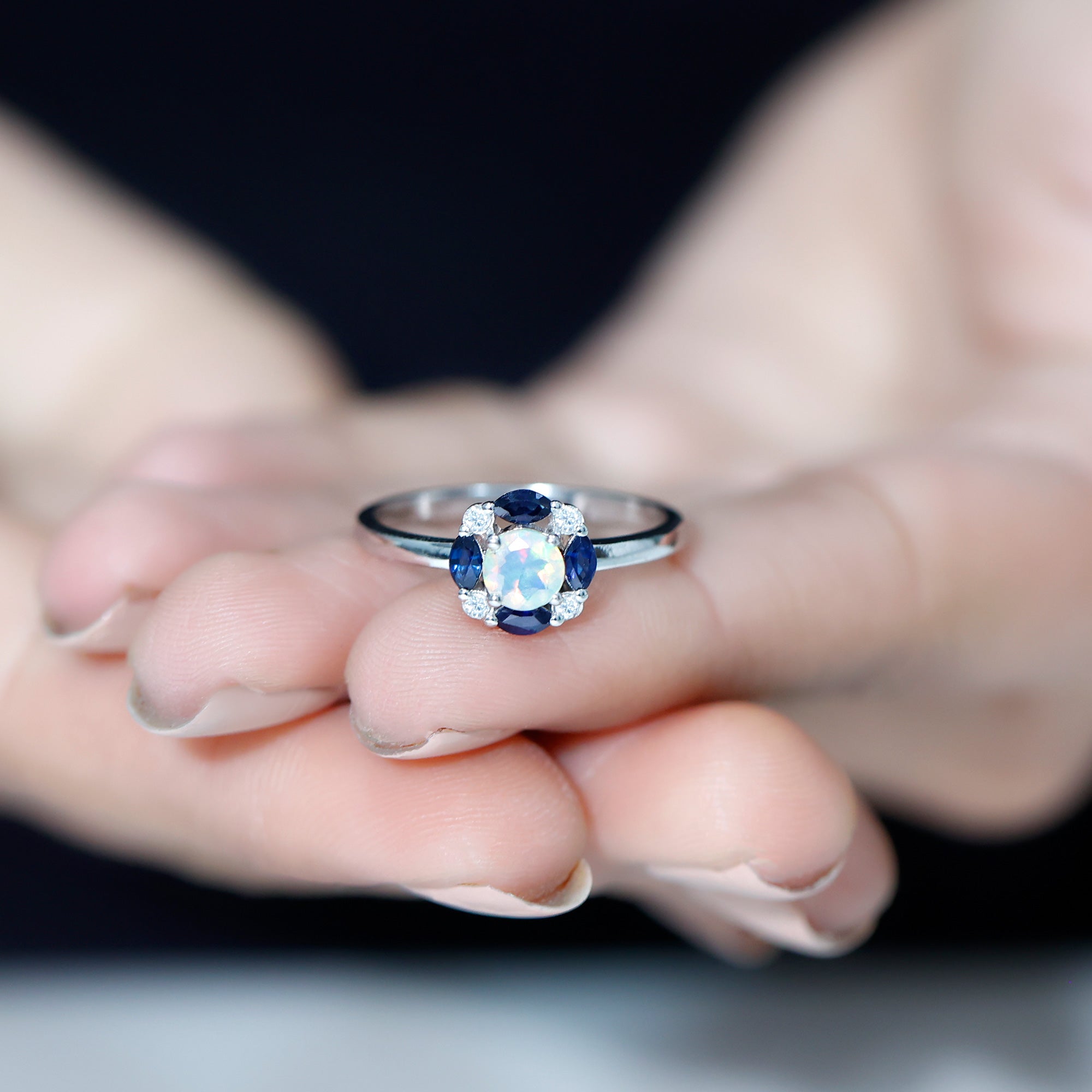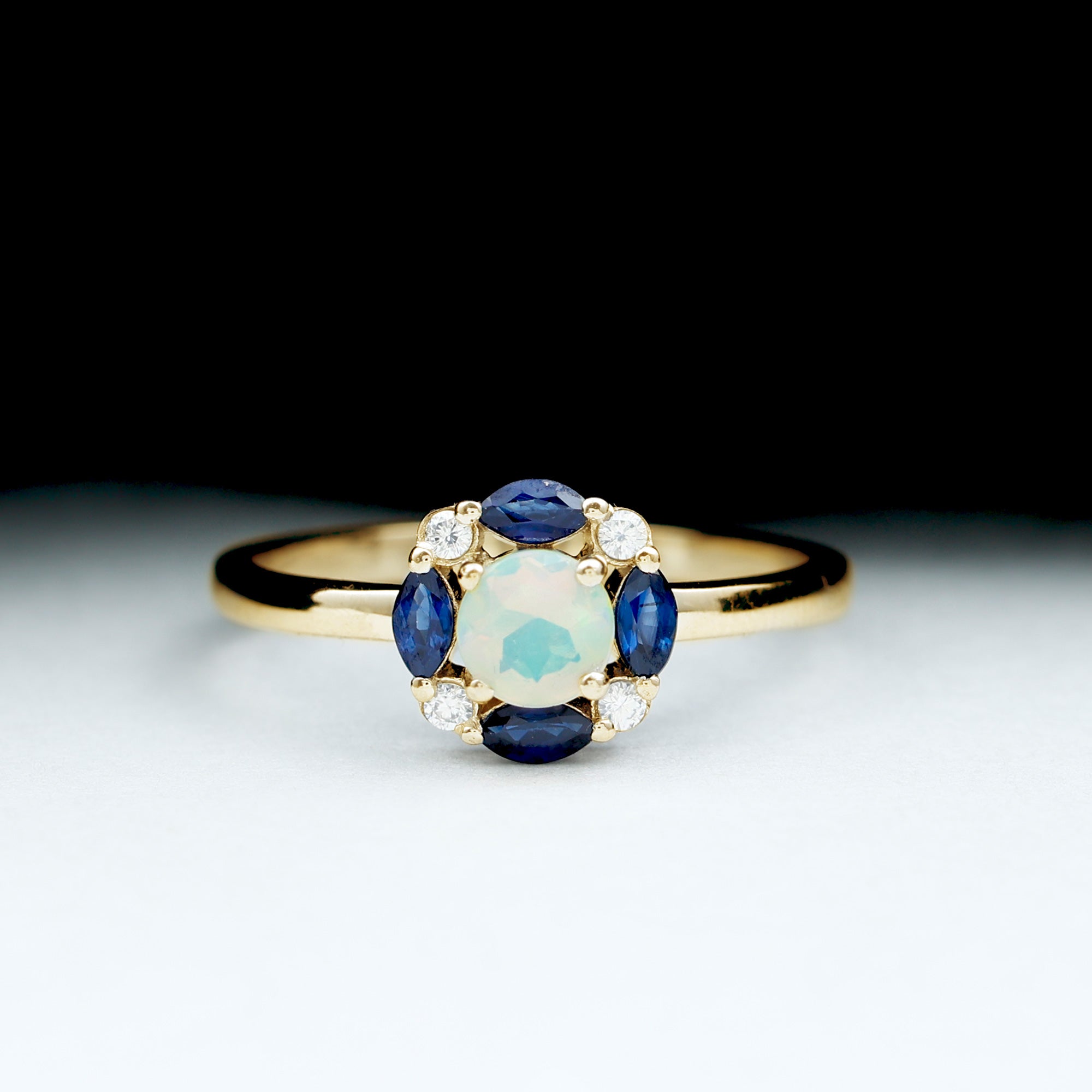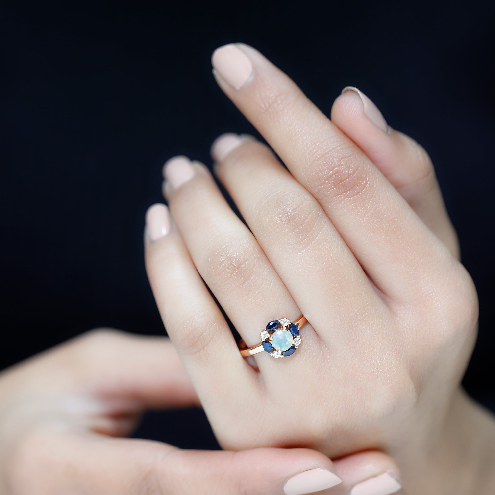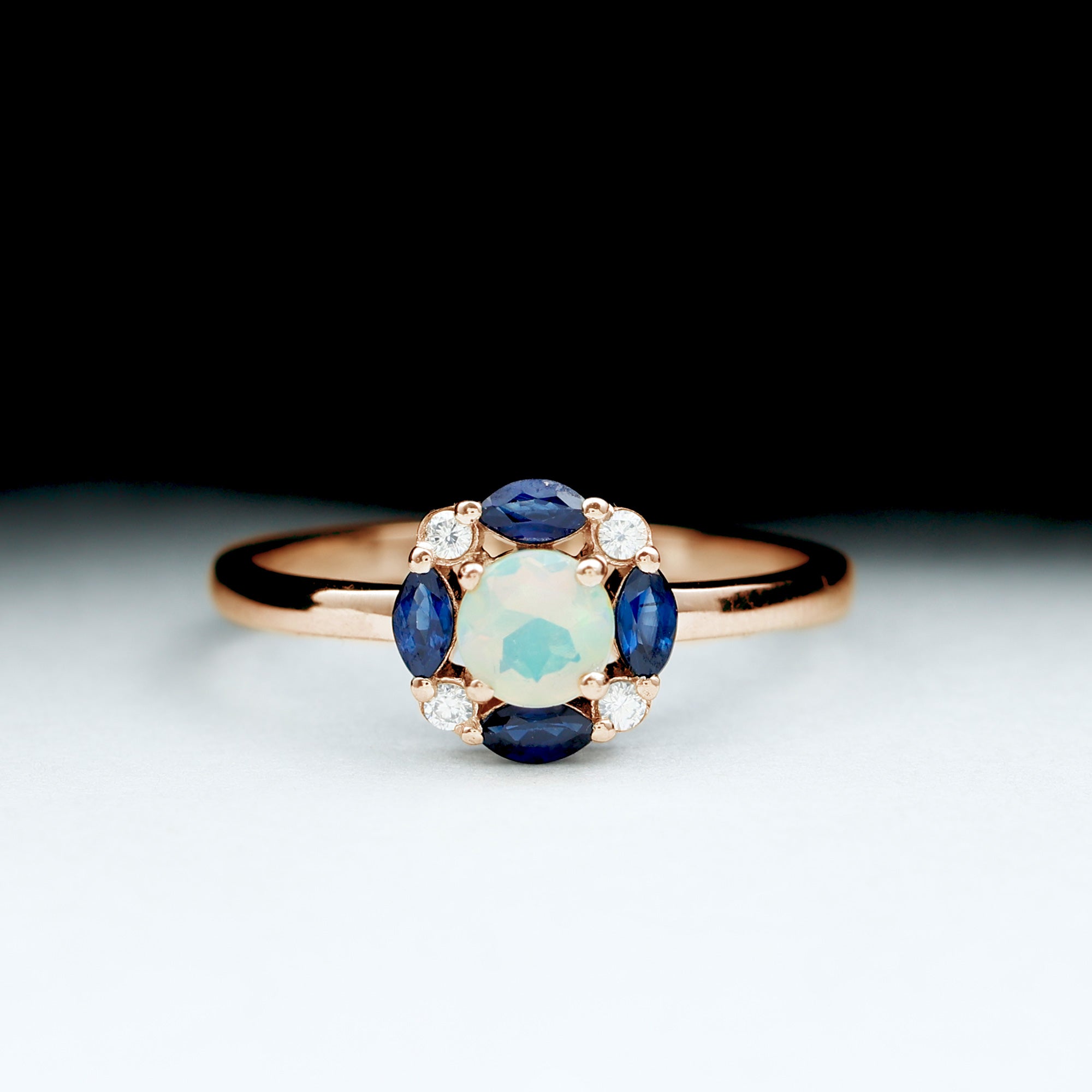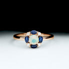 Bague de fiançailles en opale éthiopienne avec saphir bleu et moissanite