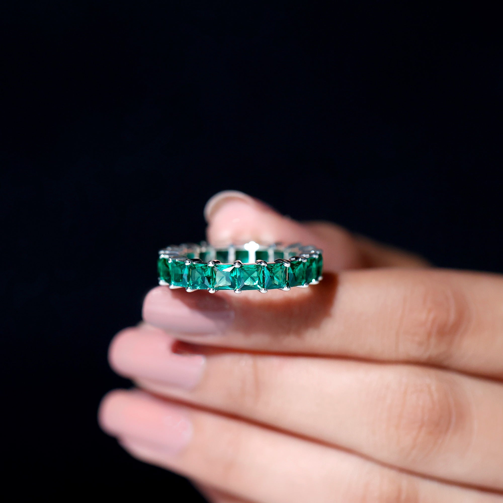 Faites passer votre relation au niveau supérieur avec le cadeau d'une bague d'éternité complète, symbole d'amour pur et de compassion. La bague d'anniversaire d'éternité en émeraude taille princesse créée en laboratoire incarne parfaitement ces sentiments. Avec des émeraudes synthétiques taille princesse de 3 mm formant un cercle dans un sertissage à griffes communes, cette bague respire l'élégance.