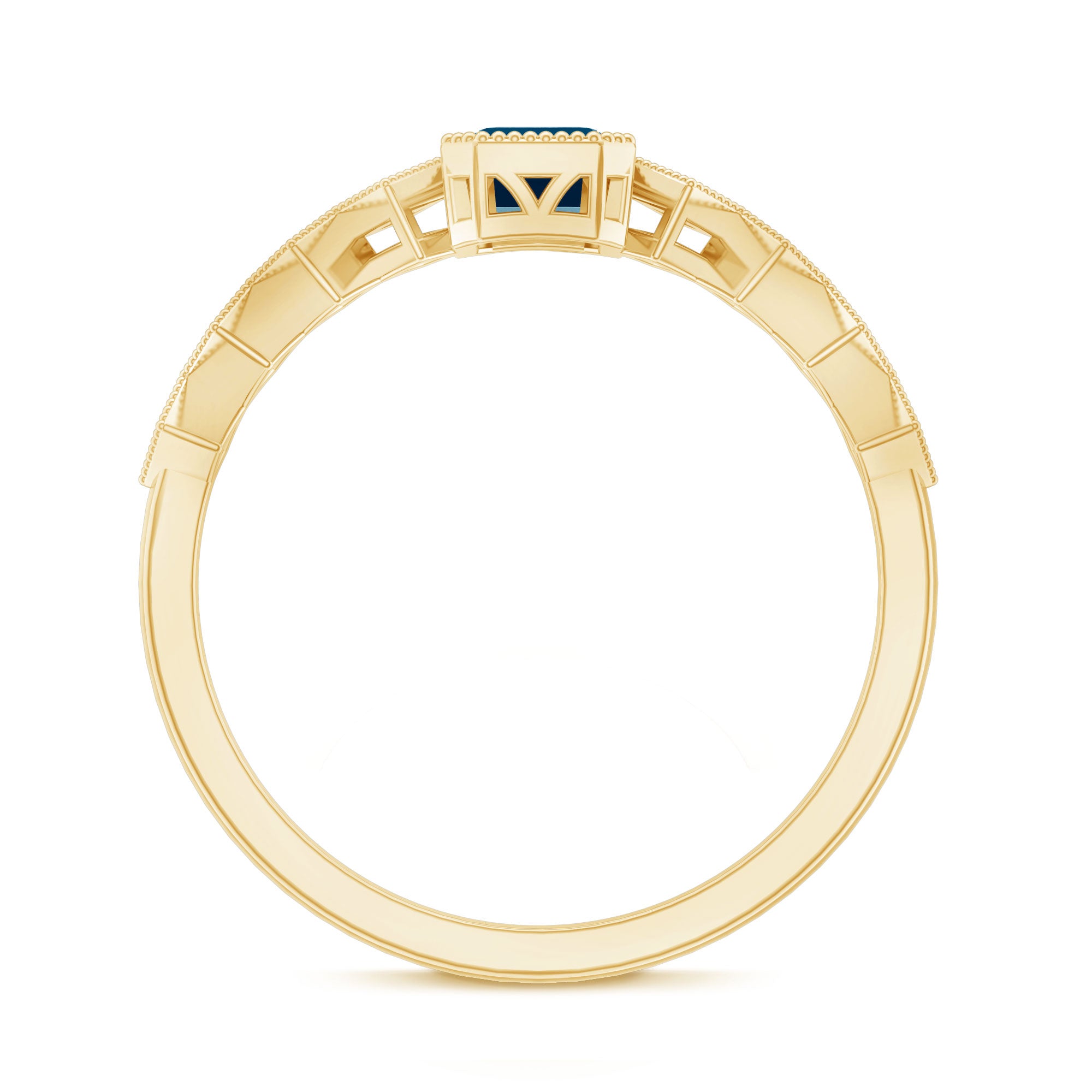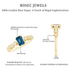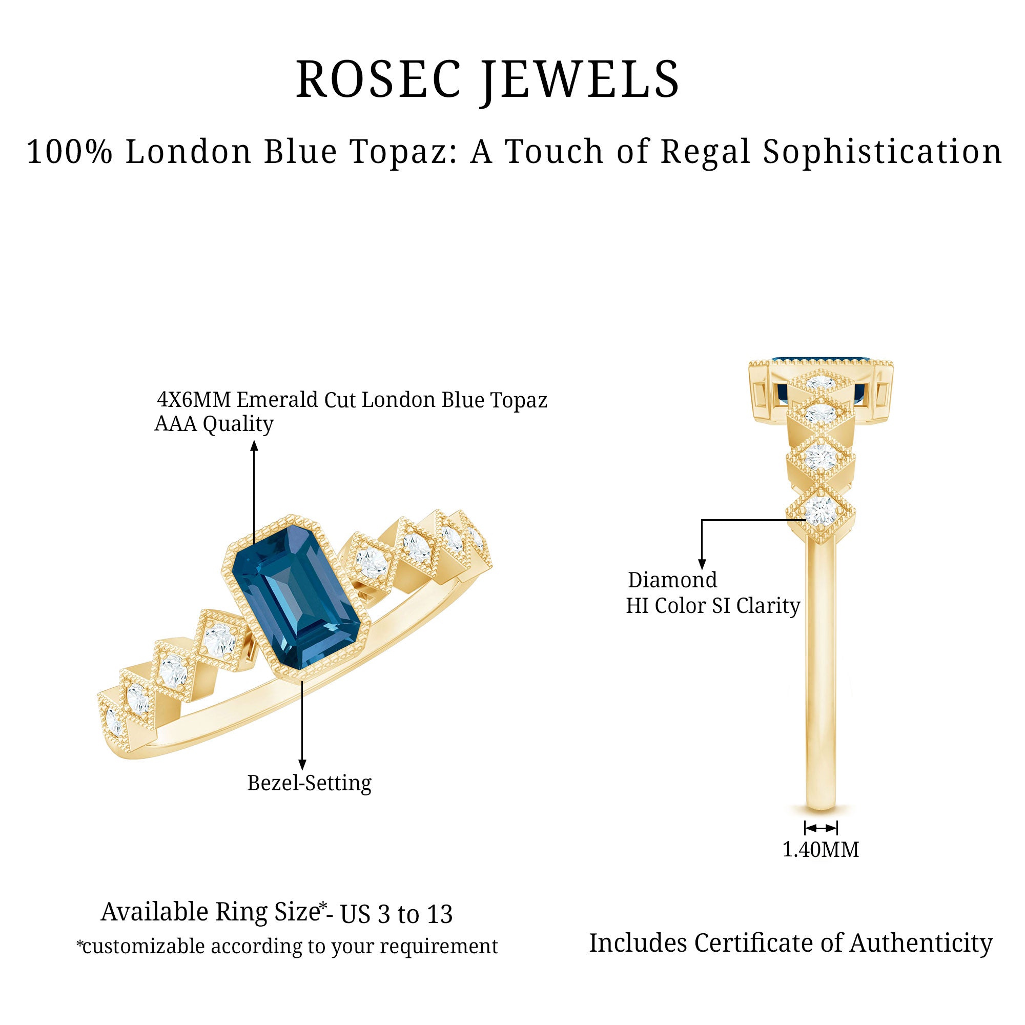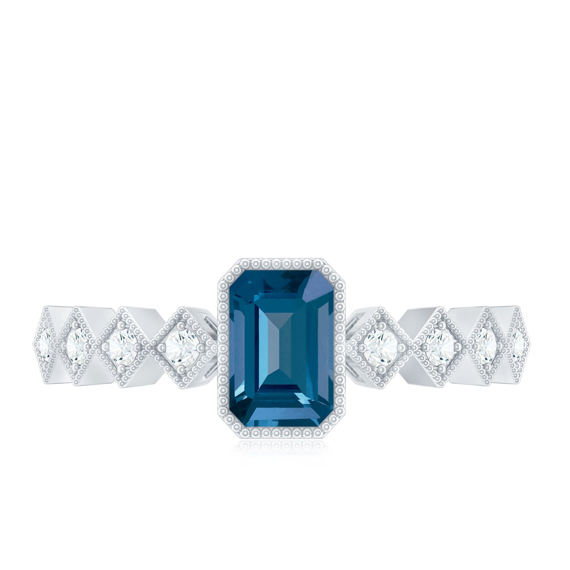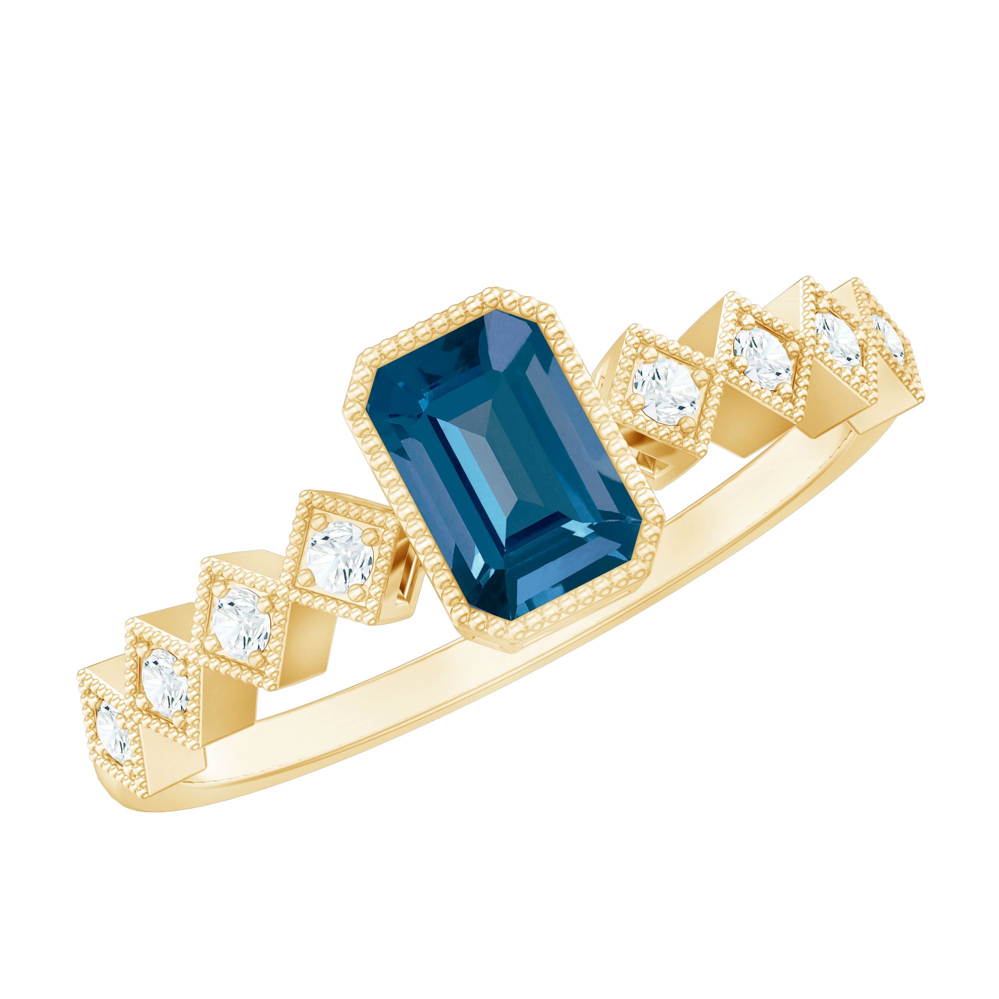 Prenez notre bague solitaire car elle possède un attrait visuel remarquable grâce à son excellent design. Orné d'une topaze bleue de Londres taille émeraude dans un sertissage de lunette perlée tandis que de délicats diamants ronds sont parsemés sur la tige. La bague topaze bleue de Londres est élégamment confectionnée avec du métal poinçonné. La bague solitaire représente une beauté et une simplicité intemporelles qui feront battre son cœur.