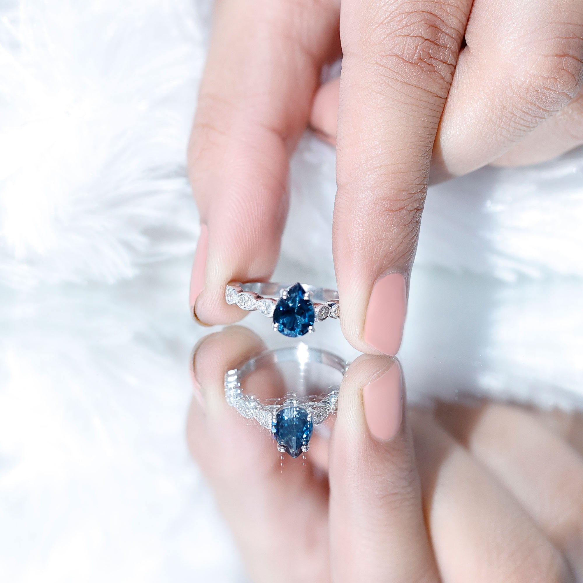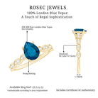 Bague solitaire topaze bleue de Londres taille poire avec pierres latérales en diamant