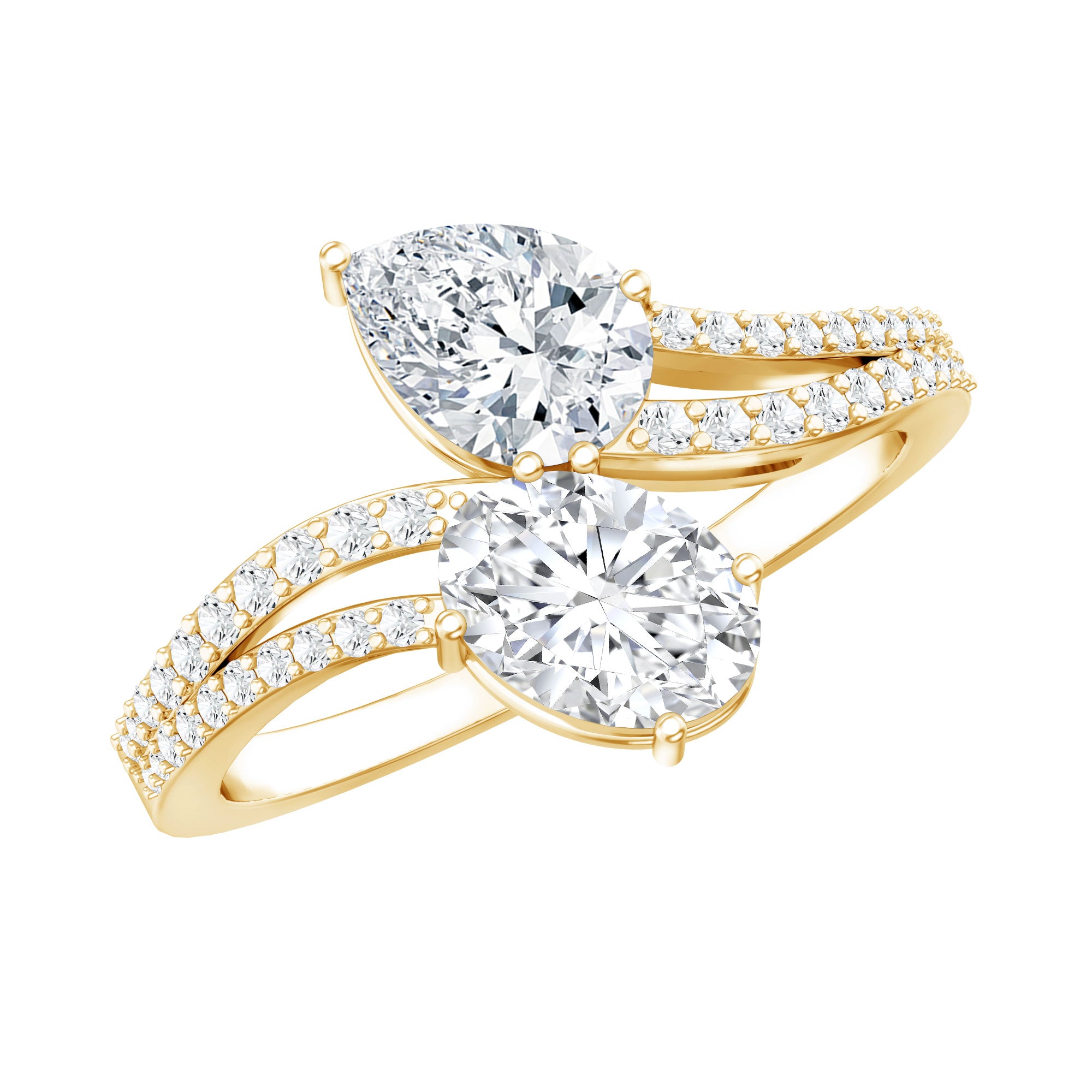 The Two Stone Engagement Ring is a beautiful and unique piece of jewelry that is perfect for those looking to make a statement on their special day. This stunning Bypass Ring features sparkling 5X7MM oval and pear shaped lab grown diamonds set in the center in prong setting. The band is adorned with multiple rows of round cut diamonds that enhance the overall glamour of this Toi Et Moi Ring. The EF-VS Quality diamond stones offer exceptional brilliance and fire, making it an ideal choice for an engagement ring. The two stone design of this Designer Diamond Ring symbolizes the union of two hearts, making it a timeless and romantic gesture that will be treasured for years to come.