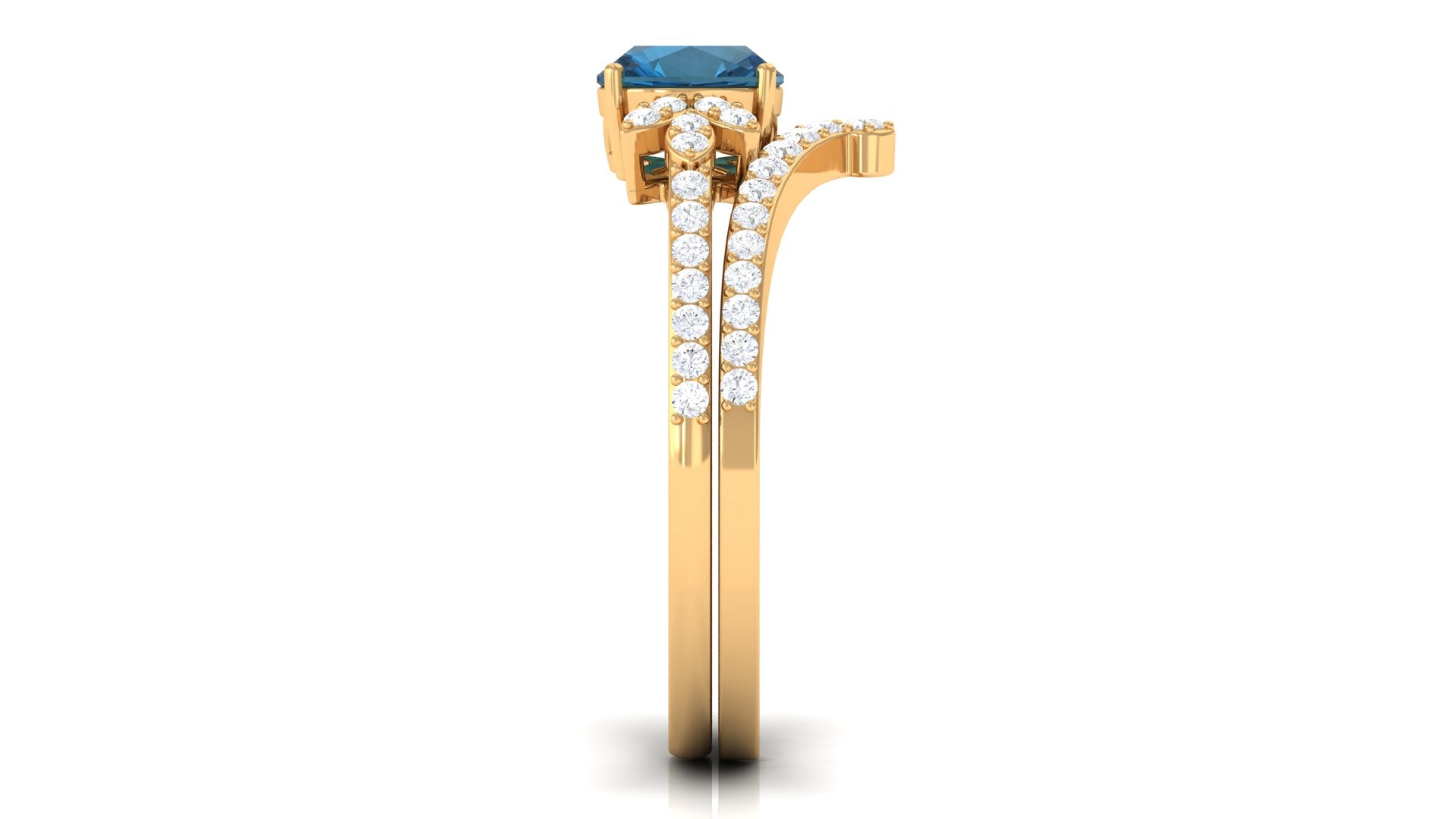 Marquez le début de votre vie avec cet ensemble de bagues de mariée empilables. Façonnée dans un métal poinçonné, la bague de fiançailles met en valeur une éblouissante topaze bleue de Londres taille coussin sertie en solitaire dans un sertissage à griffes avec un diamant rond serti comme pierres latérales et des diamants plus ronds sont également sertis sur un anneau empilable.