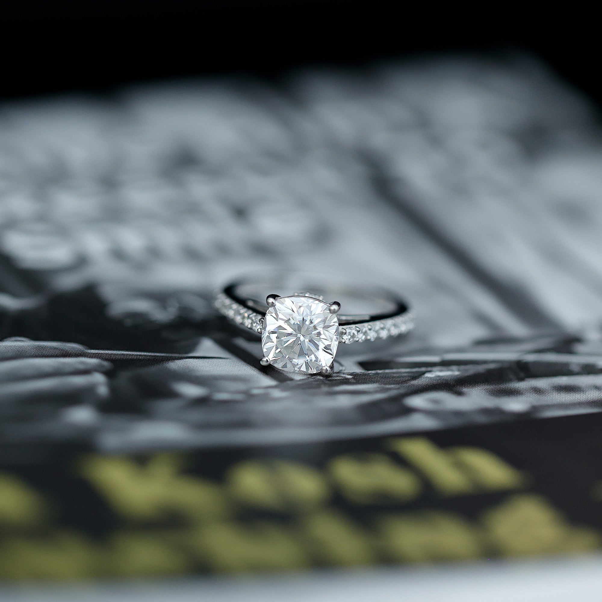 Prong, halo, pave are some of the popular settings for cushion cut gemstones.