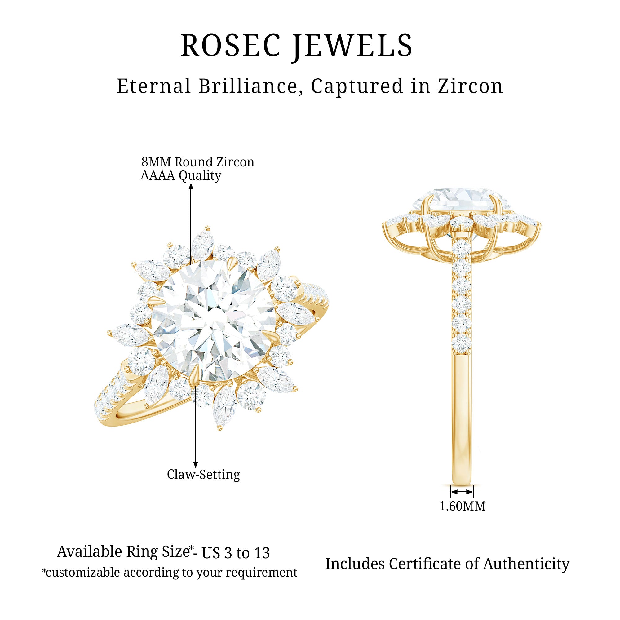 Afgezien van de vele ringstijlen, is een verlovingsring met zirkonia uitgevoerd in drie tinten goud: wit, geel en roze. Terwijl witgouden verlovingsringen mensen met een klassiek en ingetogen gevoel voor stijl aanspreken, spreken degenen die in geelgoud zijn uitgevoerd aan vanwege hun kleurcontrasterende esthetische en traditionele uitstraling. Aan de andere kant ziet een Cz-ring in roségoud er ongelooflijk vrouwelijk uit.