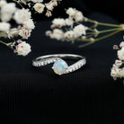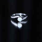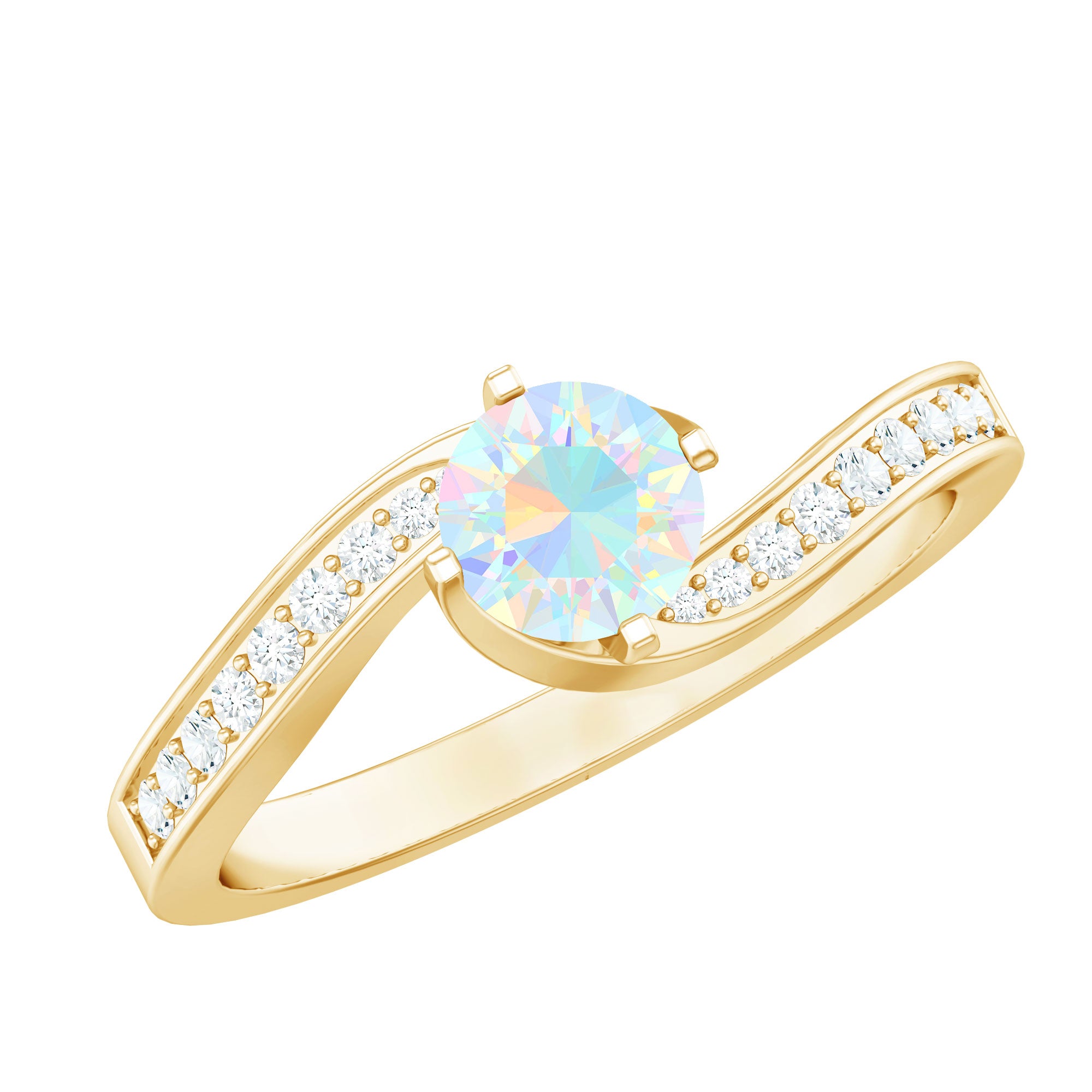 Bekend als een bypass-ring in massief goud, bestaat deze uit Ethiopische opaal met ronde vorm als solitaire verfraaid in 4-tands zetting en ronde vorm Moissanite als accent verfraaid in pave zetting. Deze Solitaire Band-ring is op creatieve wijze gemaakt en samengesteld zodat jij helder kunt stralen.