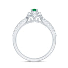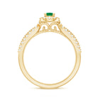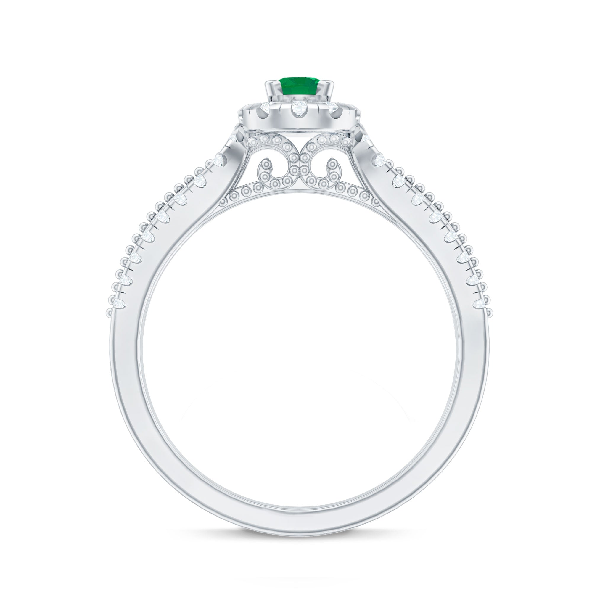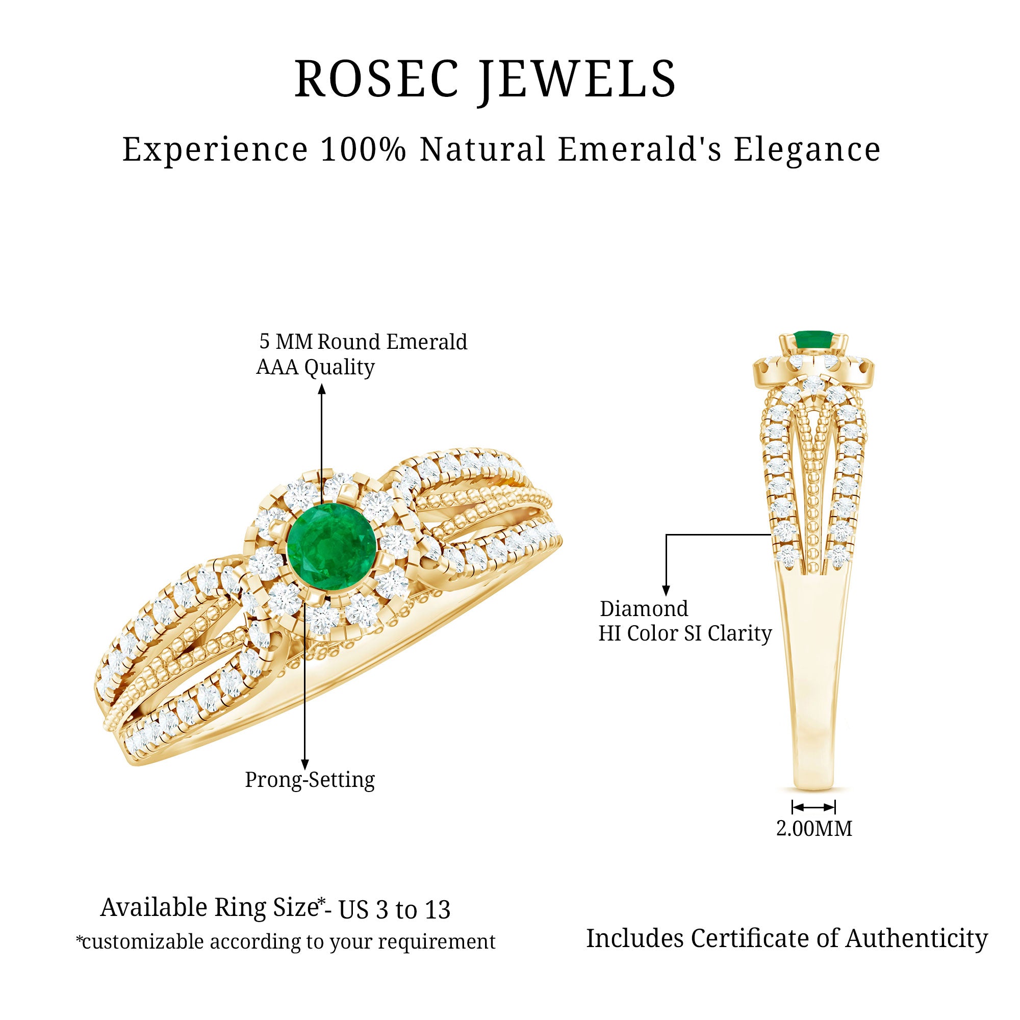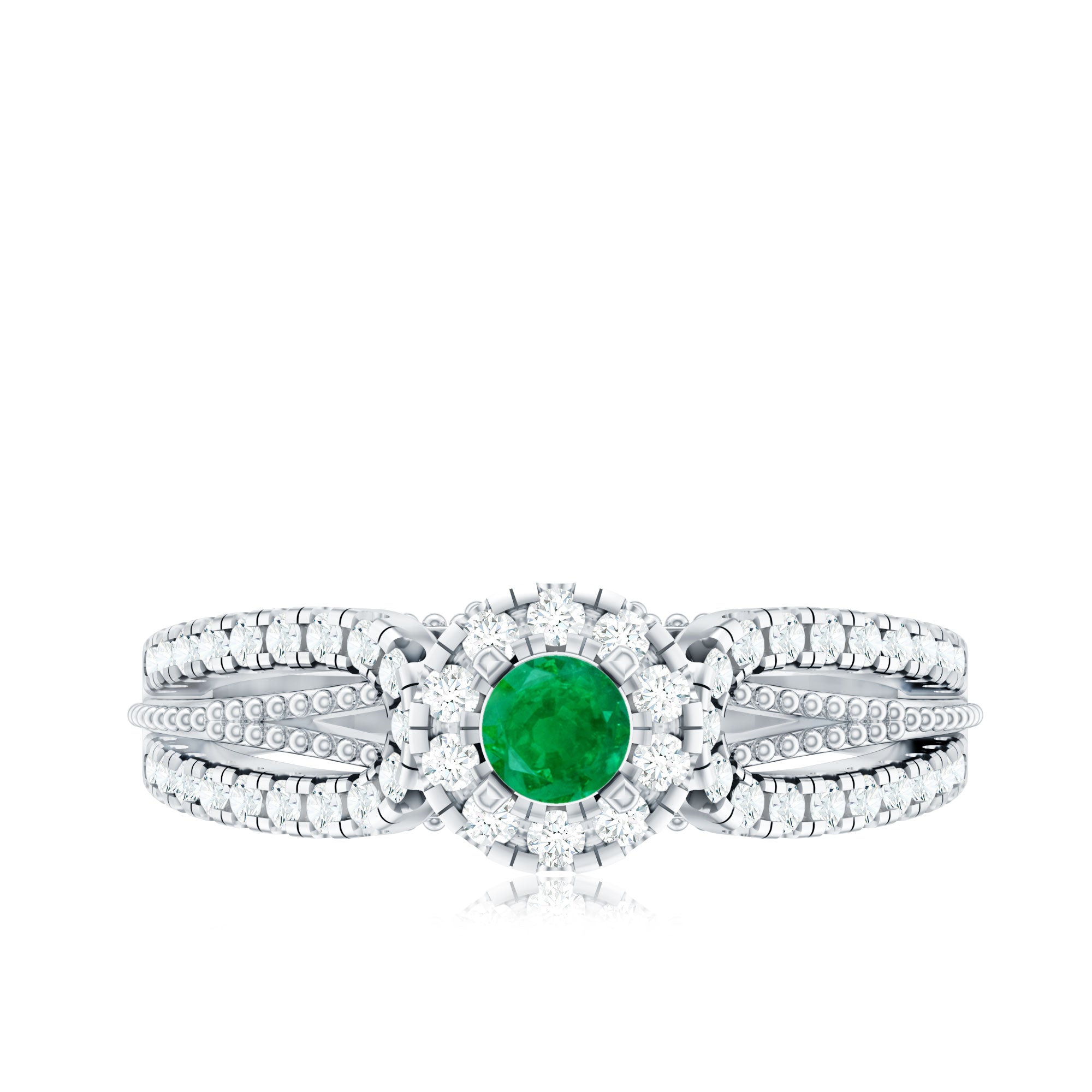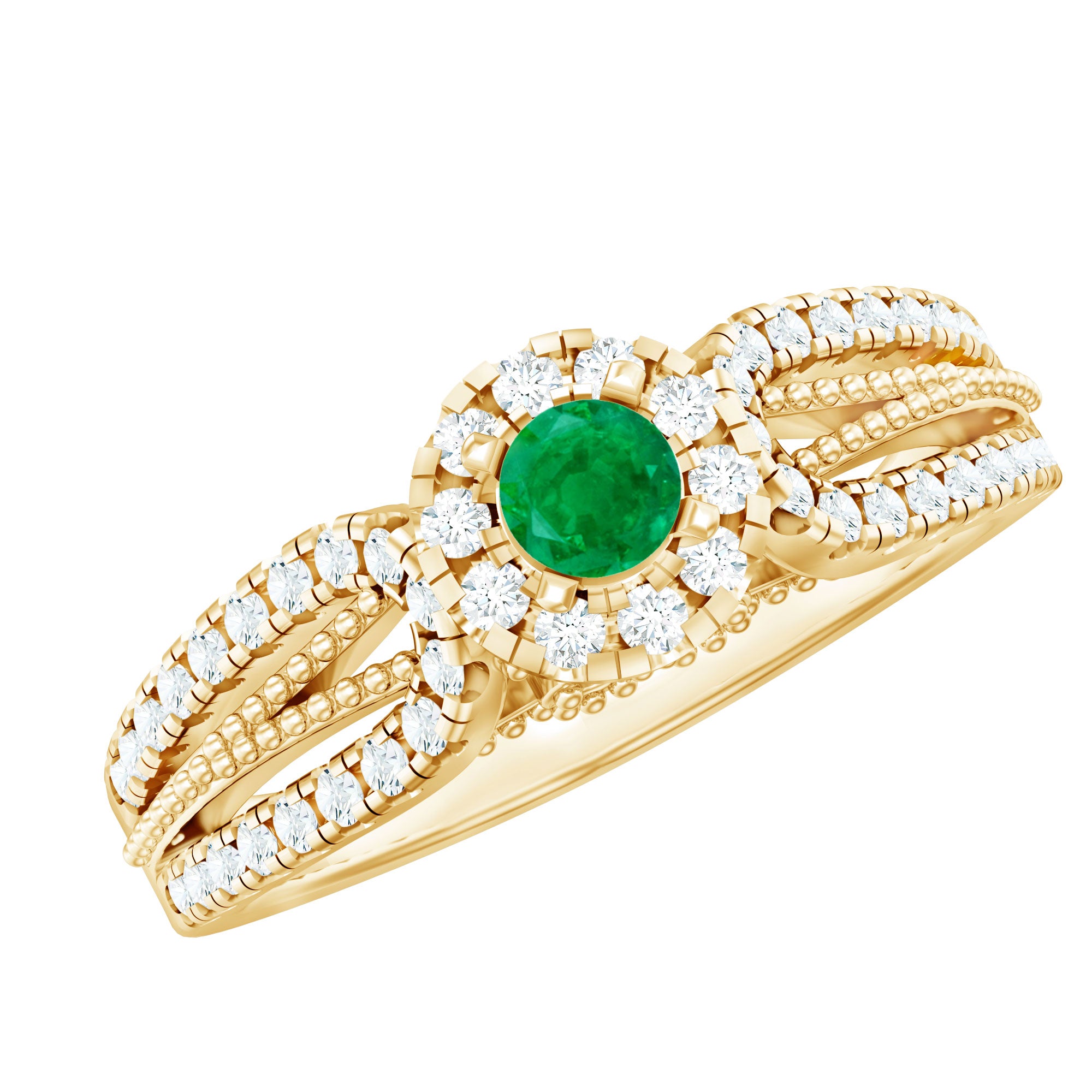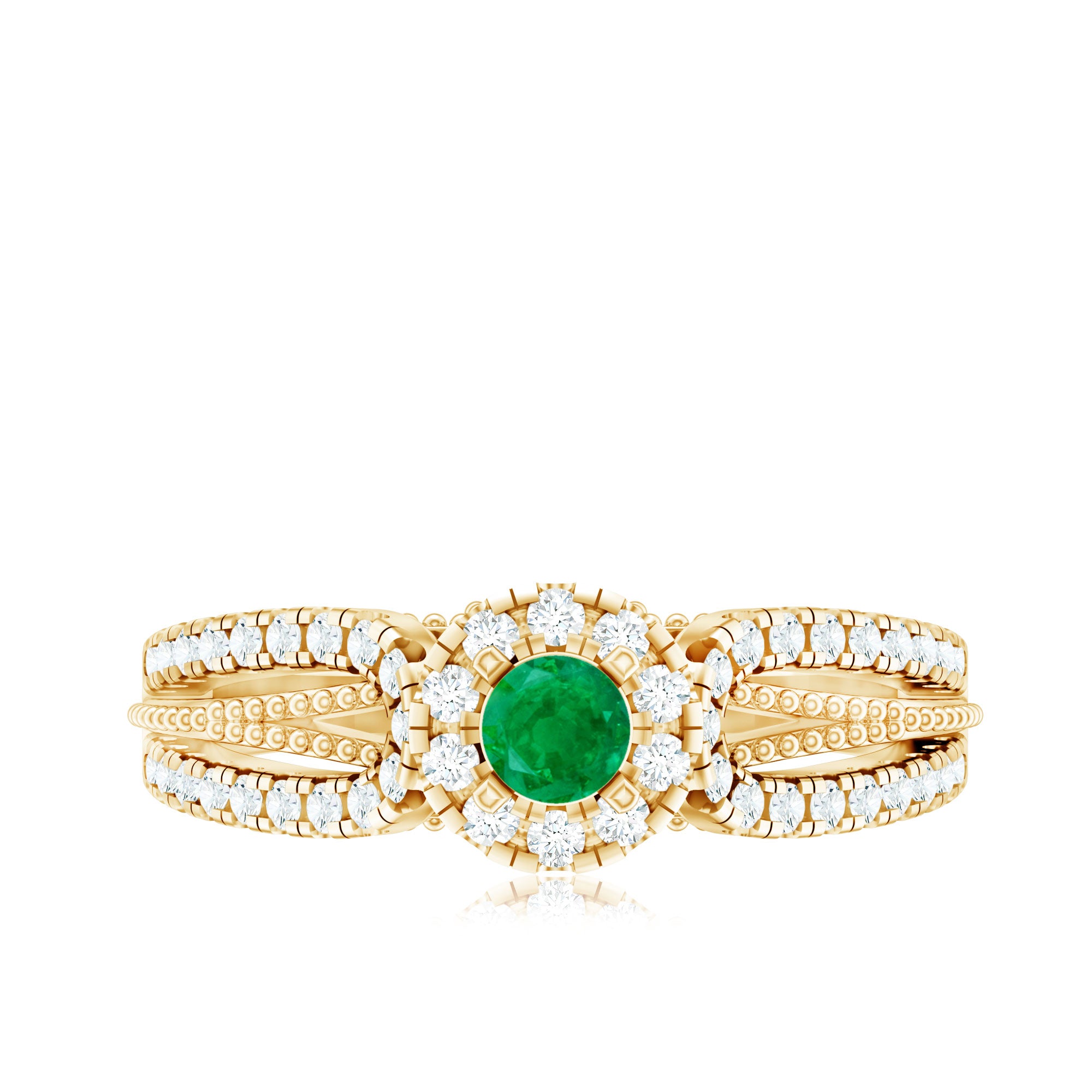 Deze massief gouden ring heeft een oogverblindend rond smaragdgroen centrum en diamanten accenten, met boeiende kralendetails. Het halo-ontwerp met gespleten schacht zal zeker de aandacht trekken.