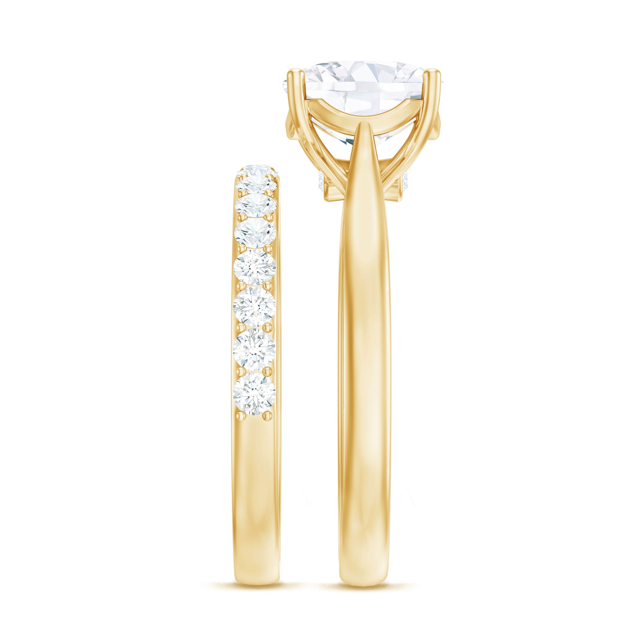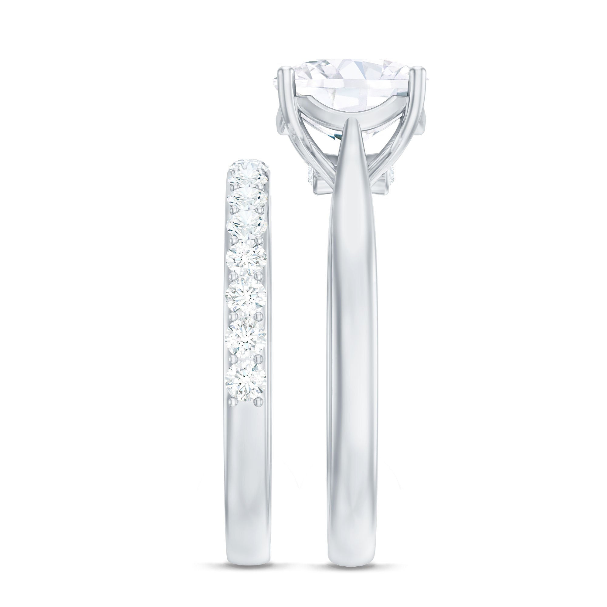 Verklaar uw eeuwige liefde met de prachtige Moissanite bruidsringset, een symbool van uw eeuwige toewijding. De Solitaire-verlovingsring is voorzien van een betoverende Cushion Cut Moissanite, veilig vastgehouden in een mandsetting, geaccentueerd door een verborgen Moissanite voor een extra vleugje schittering. Op je trouwdag kun je haar ensemble verfraaien met de bijpassende Simple Band, versierd met oogverblindende ronde Moissanite-stenen, elegant gezet in een tandzetting.