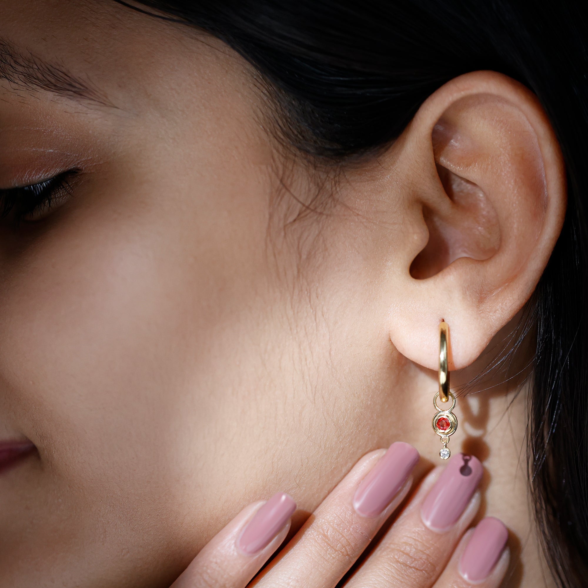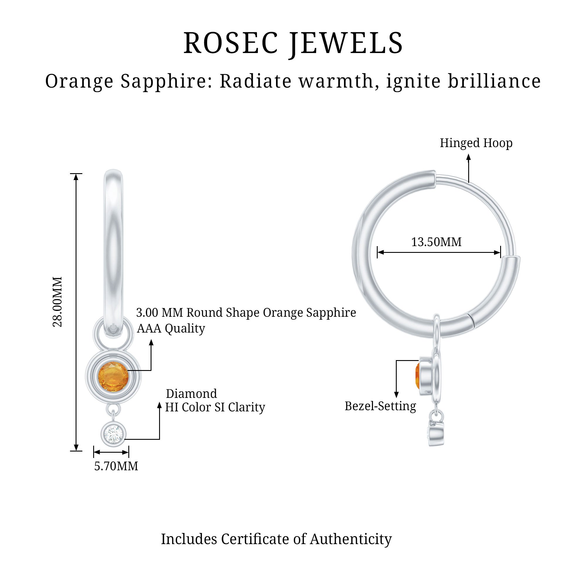 Make a chic and sophisticated fashion statement with these Bezel Set Orange Sapphire and Diamond Simple Hoop Drop Earrings. These earrings feature a stunning orange sapphire held in a secure bezel setting with a Diamond gemstone. The Diamond and sapphire are suspended from simple hoops, creating a look that is both elegant and understated. The warm and vibrant orange color of the sapphire is perfectly complemented by the Diamond gemstone, creating a harmonious and stunning look. These earrings are ideal for special events, such as weddings or anniversaries, and are sure to become a treasured addition to any jewelry collection. With their timeless design and exceptional craftsmanship, these Bezel Set Orange Sapphire and Diamond Simple Hoop Drop Earrings are the epitome of elegance and beauty. These earrings are perfect for those who love to add a pop of color to their jewelry collection and are ideal for daytime or evening wear.