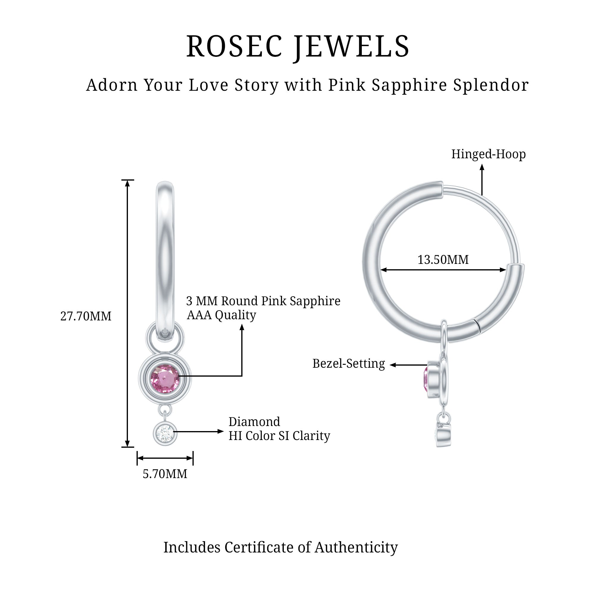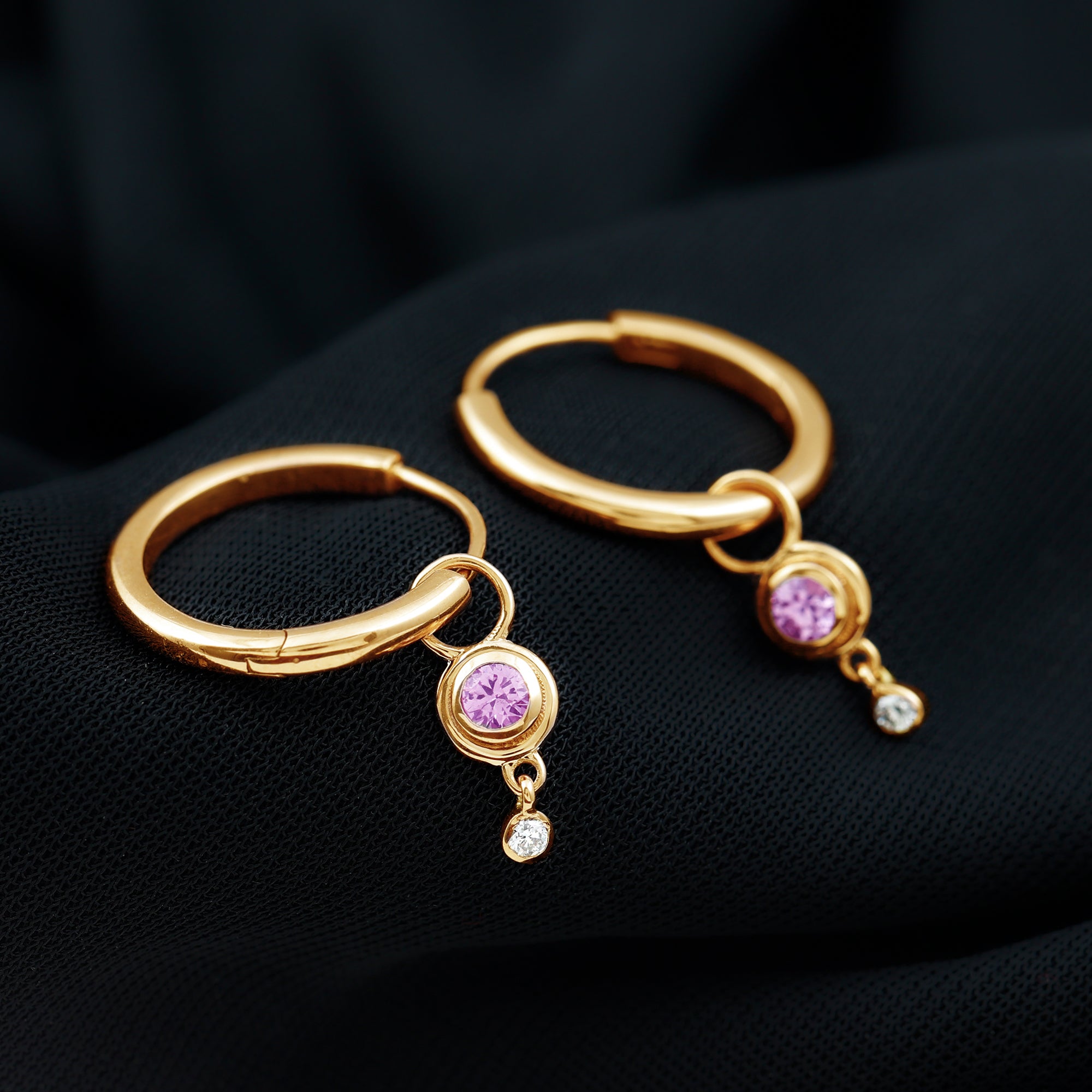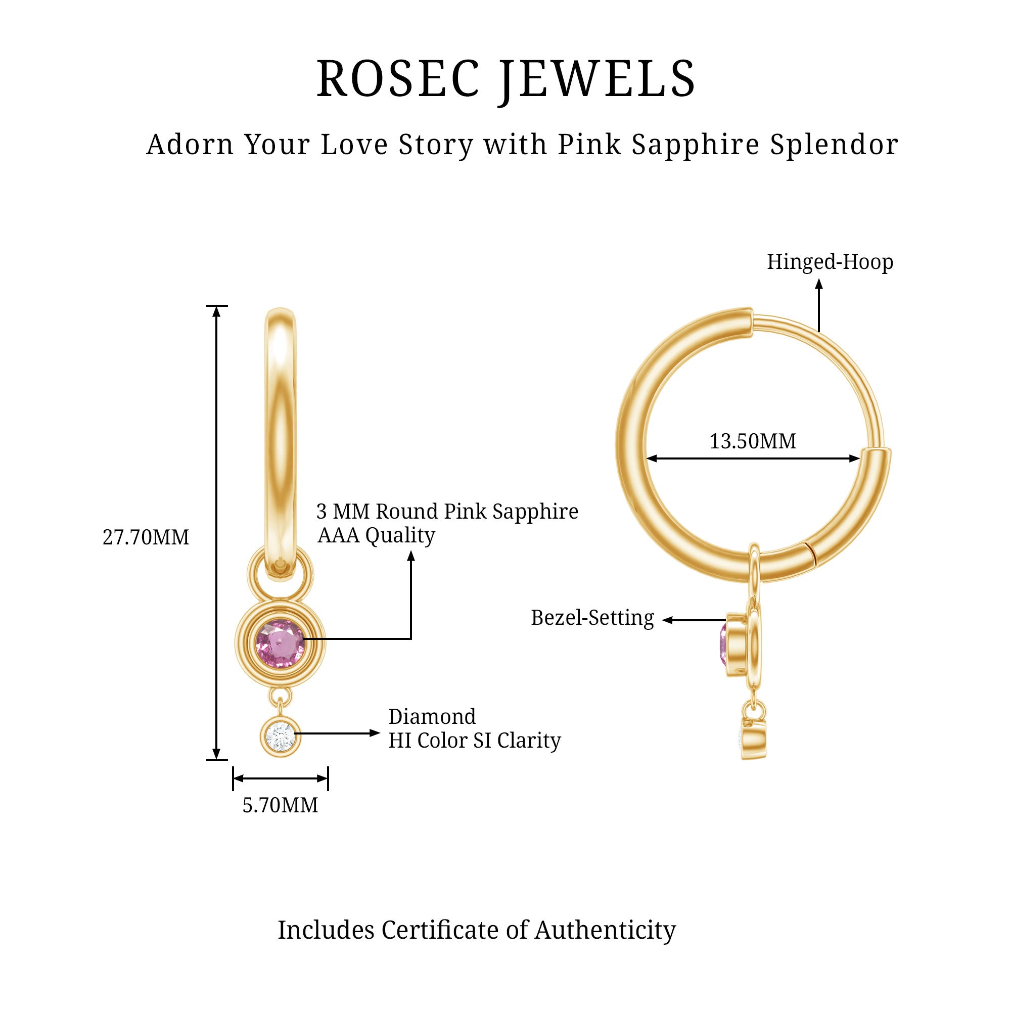 Surprise your beloved with these elegant Simple Drop Hoop Earrings, designed to make her feel truly cherished. These exquisite earrings feature a Round Shape Pink Sapphire accompanied by a Diamond Drop, all delicately set in a stylish Bezel Setting. They are also equipped with a convenient Hinged Hoop Back finding, ensuring a secure and comfortable fit. Treat your lady love to these stunning earrings and let her know how special she is to you.