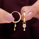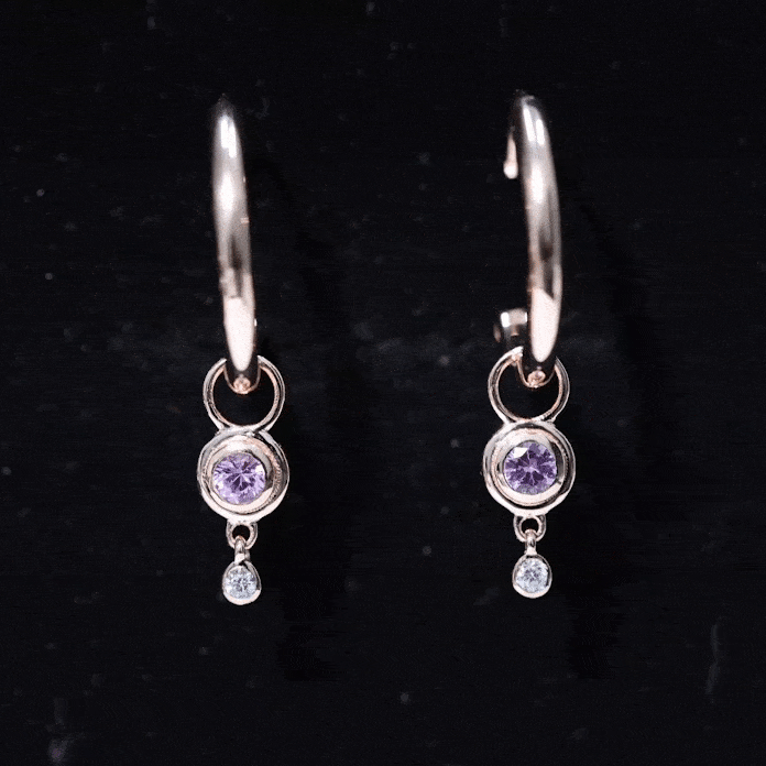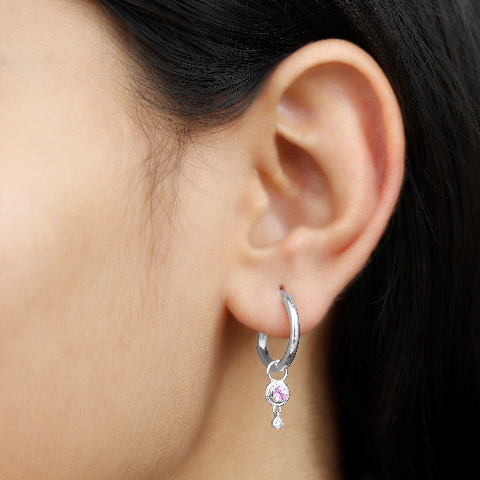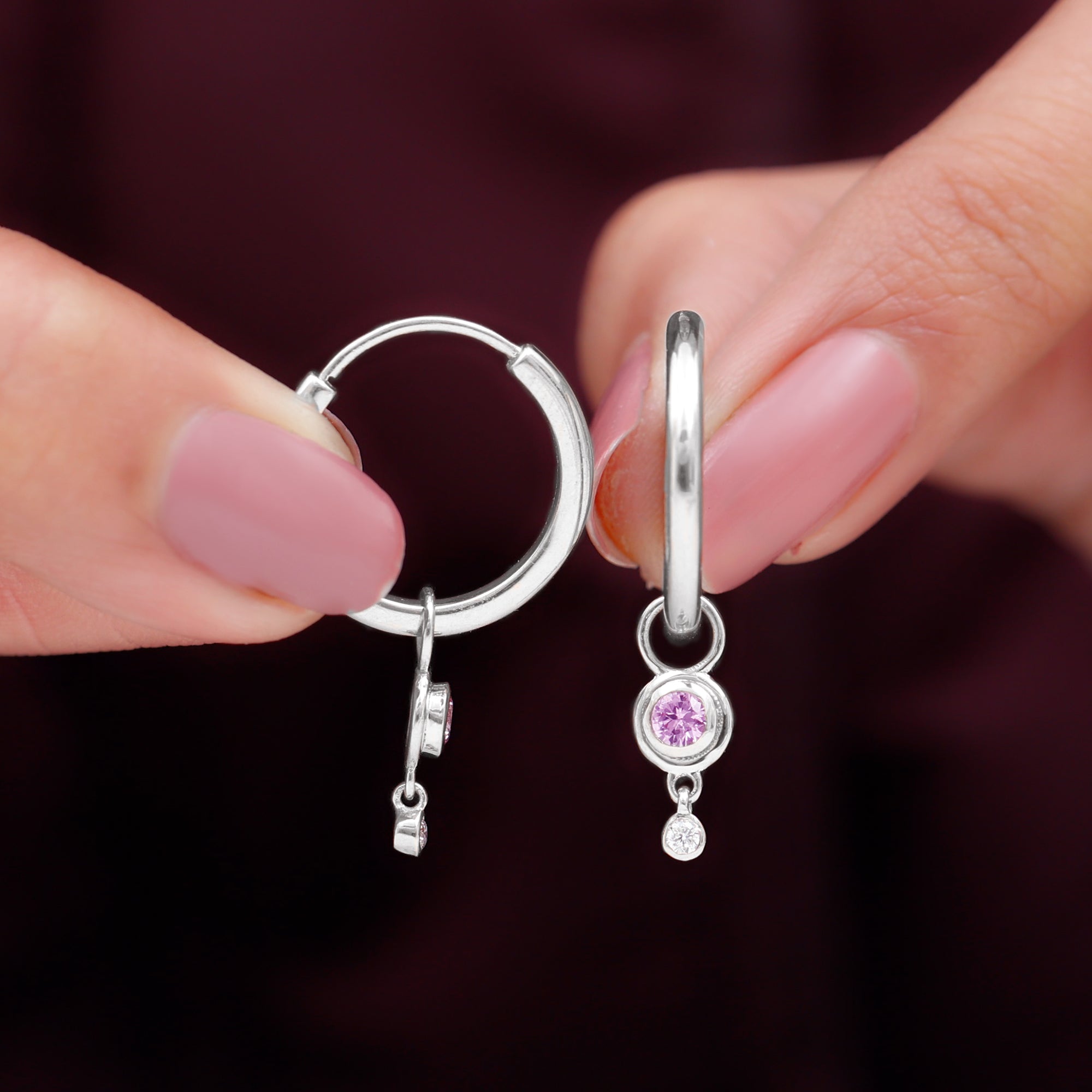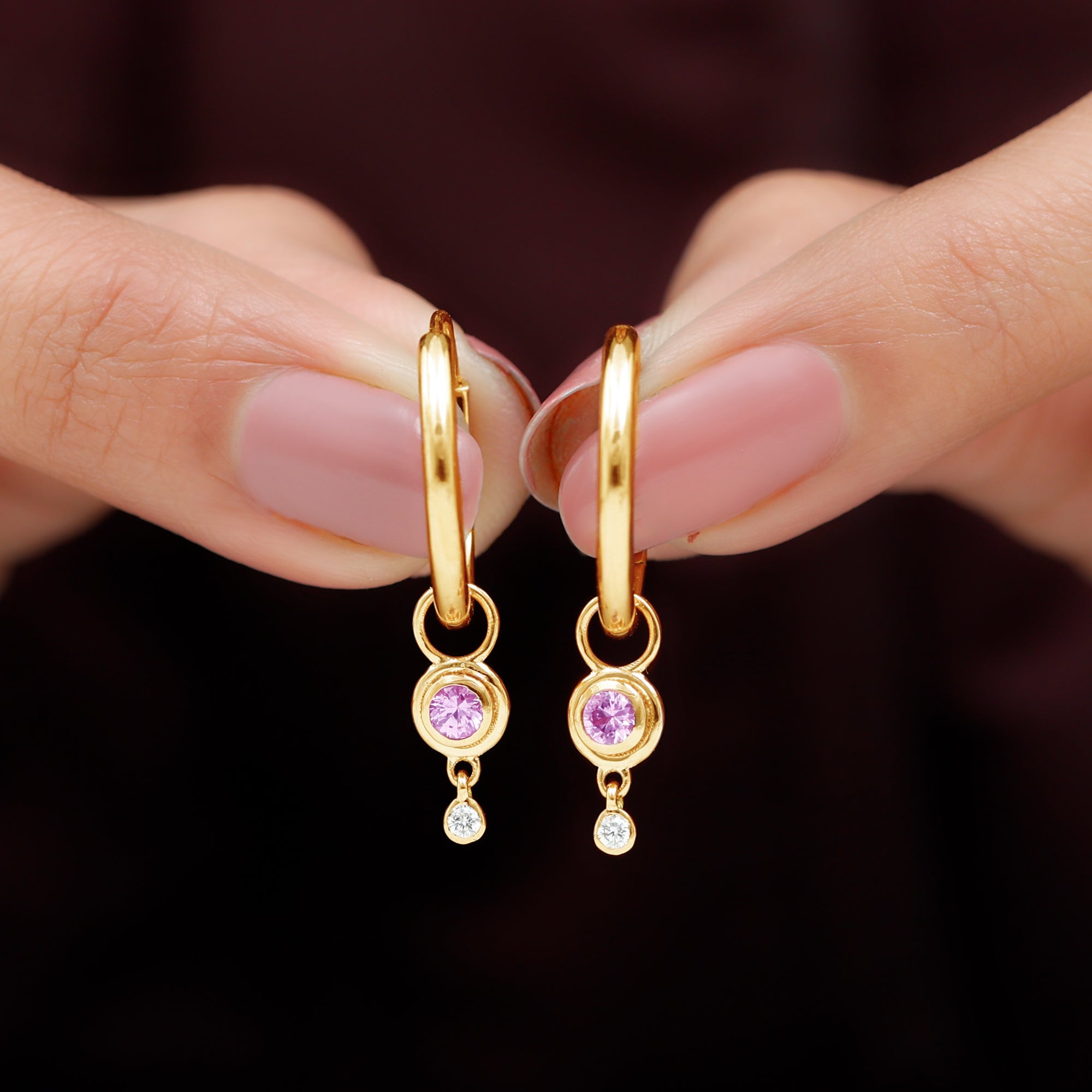 Surprise your beloved with these elegant Simple Drop Hoop Earrings, designed to make her feel truly cherished. These exquisite earrings feature a Round Shape Pink Sapphire accompanied by a Diamond Drop, all delicately set in a stylish Bezel Setting. They are also equipped with a convenient Hinged Hoop Back finding, ensuring a secure and comfortable fit. Treat your lady love to these stunning earrings and let her know how special she is to you.